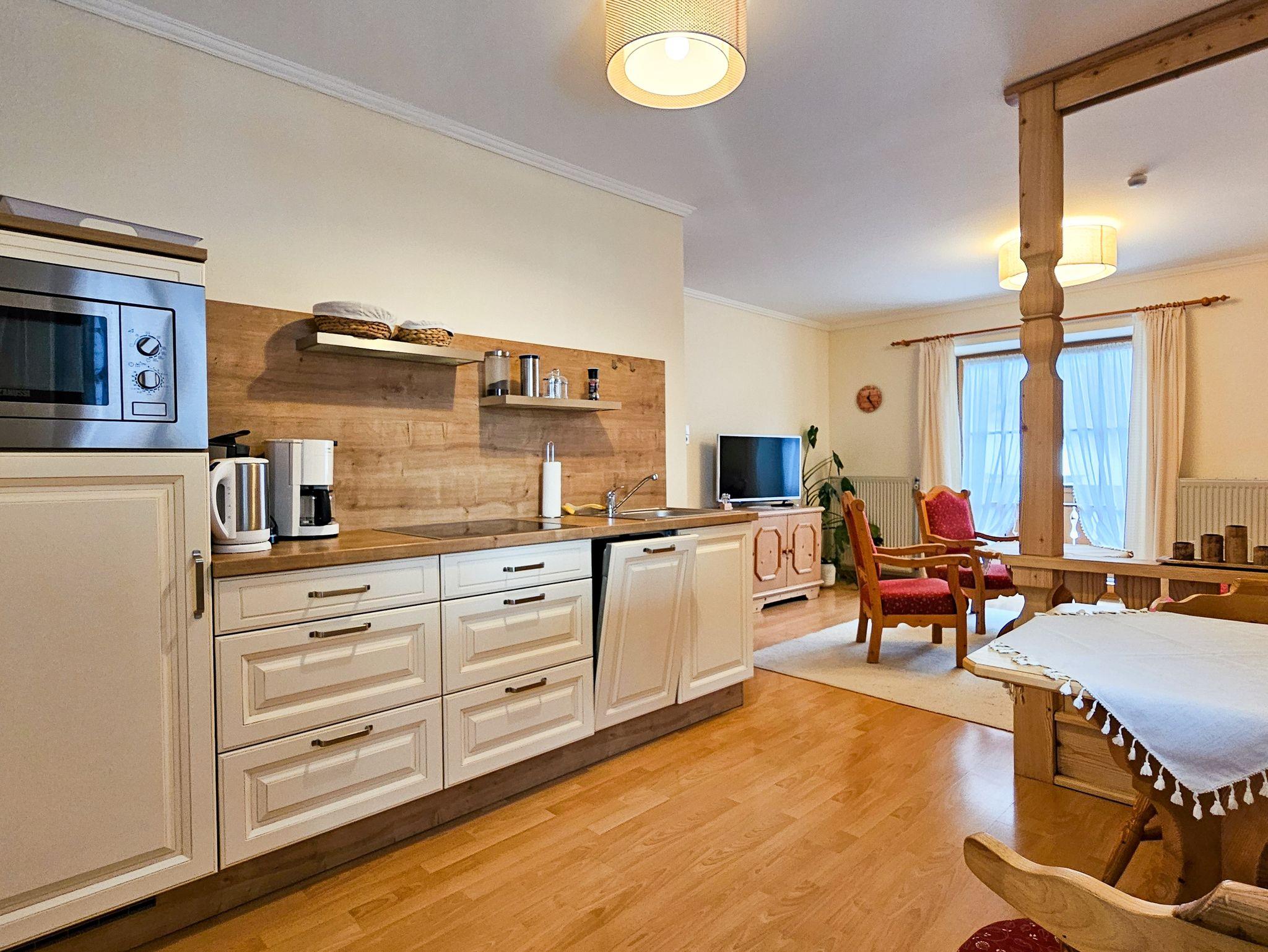 • im Wohnraum integrierte Küche (mit Geschirrspüler, ****Kühlschrank, 4-Platten-Cerankochfeld, Mikrowelle, Kaffeemaschine, Kaffee-Pad-Maschine, Wasserkocher, Eierkocher, Toaster,Heißluftfritteuse)