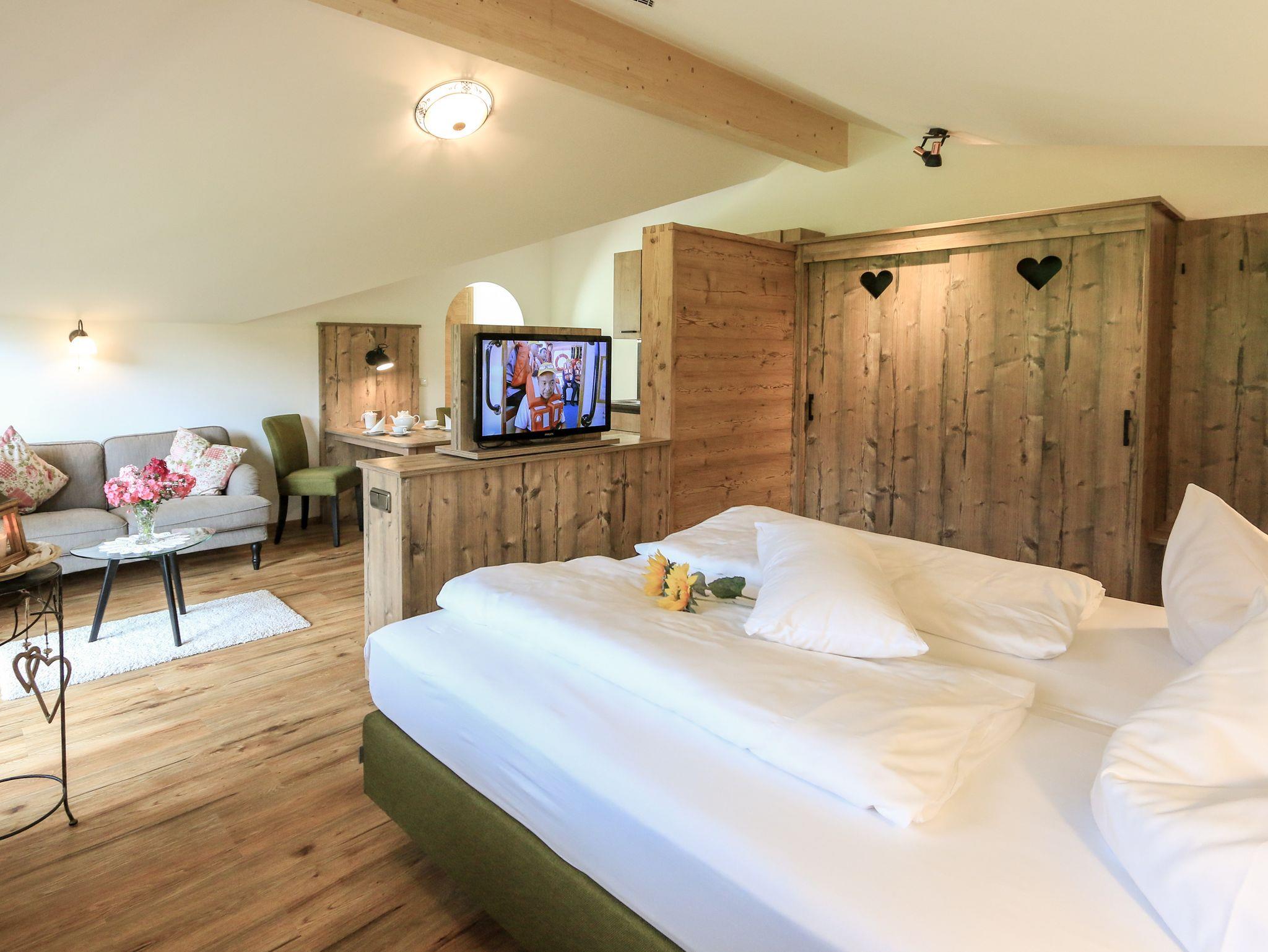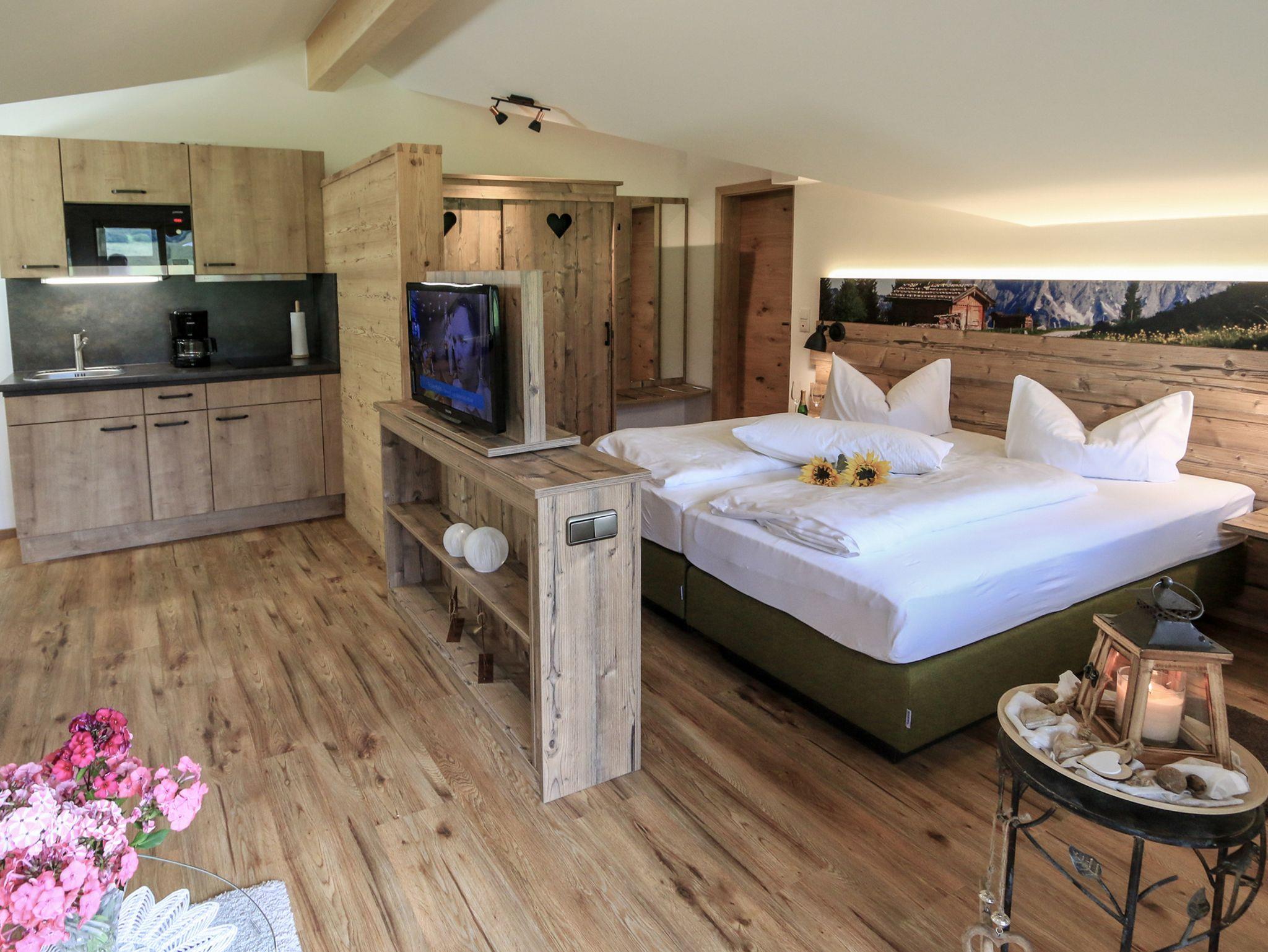 An dem freien Blick auf grüne Wiesen und die Reiteralpe können Sie sich durch die große Fensterfront im ganzen Wohn- und Schlafbereich erfreuen. Im komfortablen Boxspringbett wachen Sie morgens erholt auf und genießen. Die liebevoll und raffinierte, offene Gestaltung der Räume sorgen für ein Freiheitsgefühl und Entspannung.