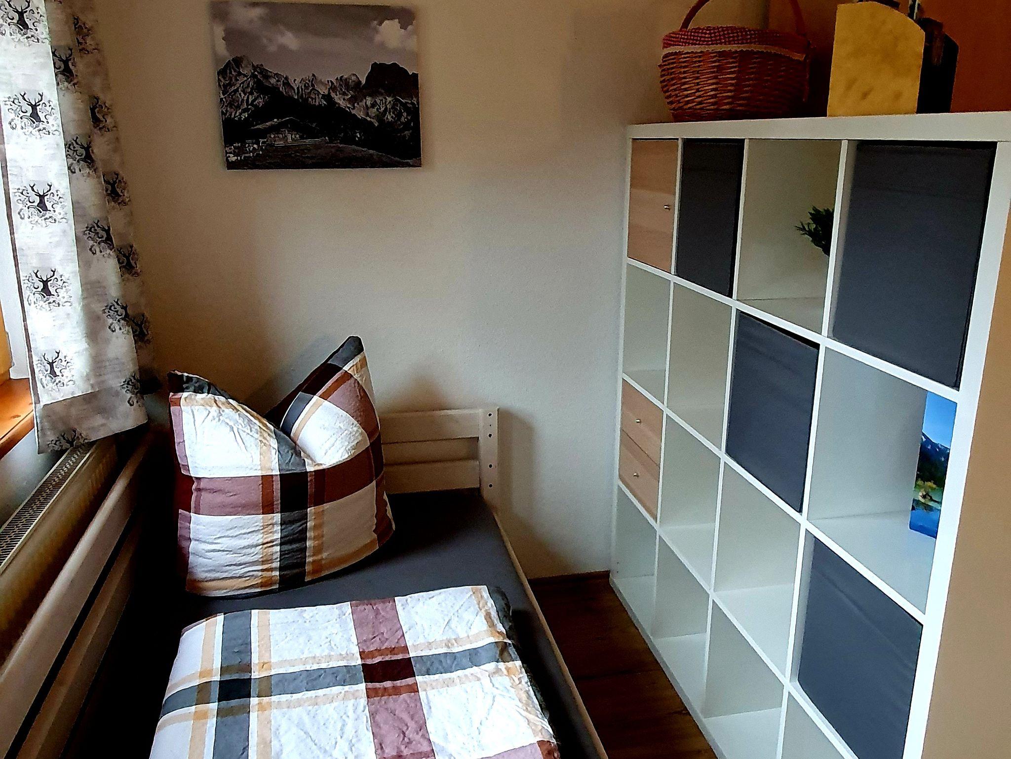 Nichtraucher-Ferienwohnung Bergblick im Obergeschoss mit Balkon zur Westseite für 1-3 Personen, 60 qm, Wohnzimmer mit Küche und gemütlicher Essecke undd zusätzlicher Schlafmöglichkeit im Wohnraum, TV, kostenloses W-LAN, DVD, Herd, Geschirrspüler, Kühlschrank mit Gefrierfach, Kaffeemaschine, Wasser- und Eierkocher, 2 separate Bäder mit Dusche und WC.