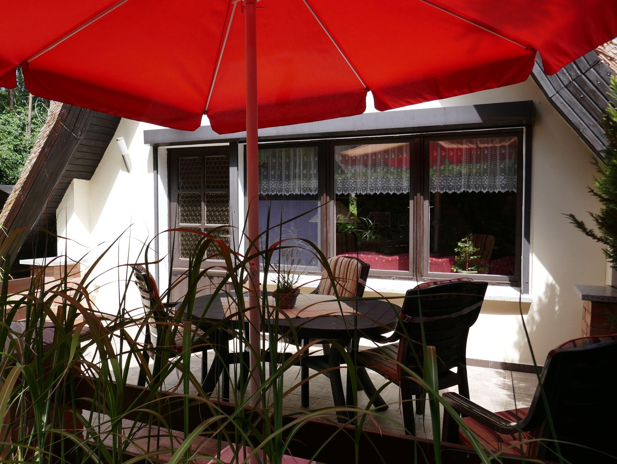 Vor der Finnhütte befindet sich eine gemütliche und möblierte Terrasse mit Sonnenschirm. Die Erstausstattung Bettwäsche und Handtücher ist bereits im Gesamtpreis enthalten. Ein Parkplatz und eine abschließbare Fahrradunterstellmöglichkeit stehen Ihnen ebenfalls zur Verfügung.