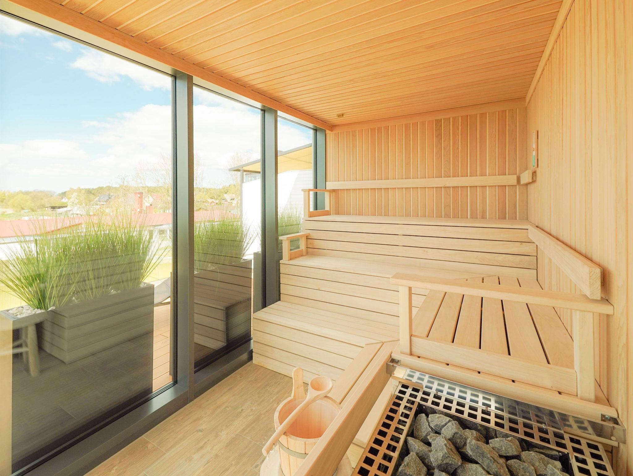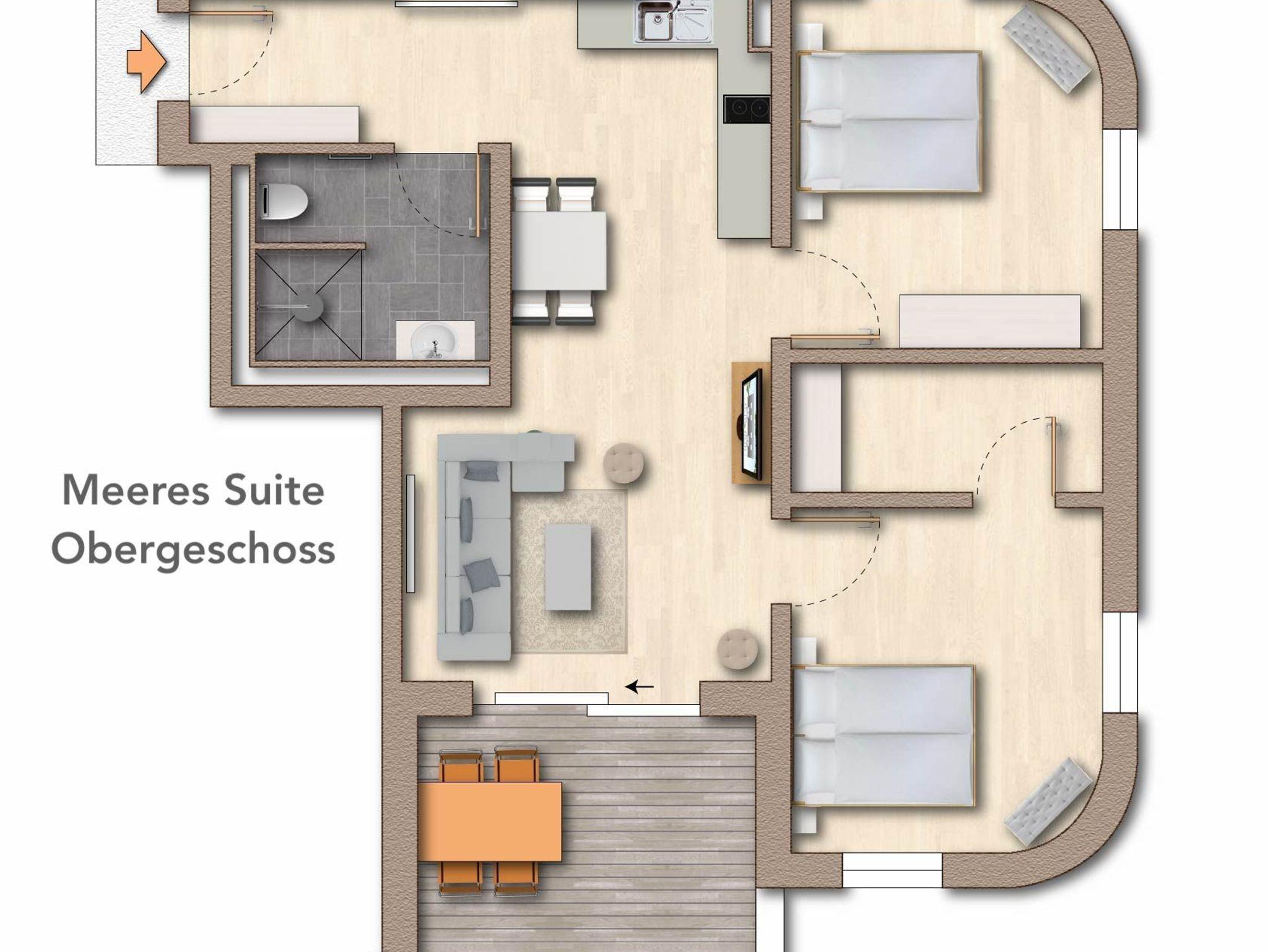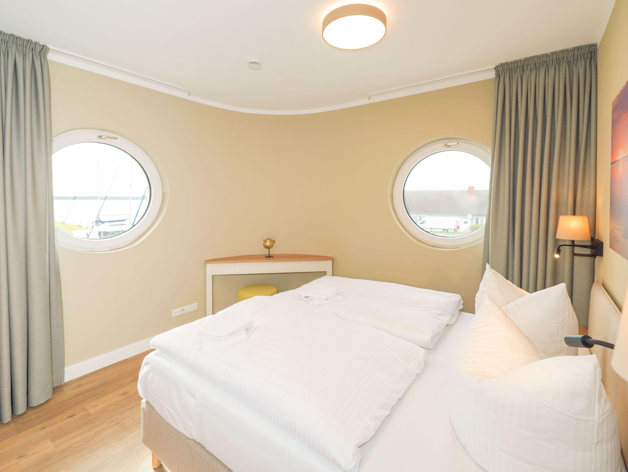 75m² Suite im OG für bis zu 4 Personen. Schlafzimmer mit Doppel-Boxspringbett (180x200). 15 m² Balkon mit einmaligem Blick auf Wasser und Hafen. Parkplatz und WLAN sind inklusive.Nichtraucher-Suite. Dachsauna mit Terrasse, Fitnessraumund Frühstück sind vor Ort zu buchbar. Wäschepaket und Endreinigung einmalig 139,- €.