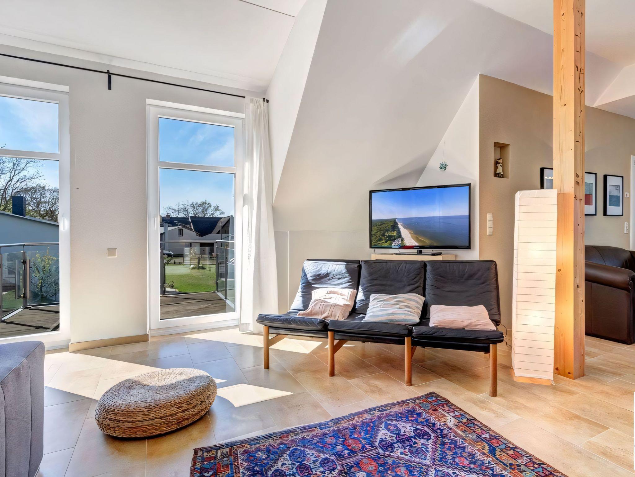 Die Ferienwohnung im Obergeschoss ist über eine separate Außentreppe erreichbar und erstreckt sich über das gesamte Stockwerk. Sie bietet einen großzügigen Wohn- und Essbereich mit bequemen Lederpolstermöbeln, einem Flachbild-TV, einer Hifi-Anlage, einem DVD-Player, einem Esstisch und einer kleinen Urlaubsbibliothek für entspannte Stunden.