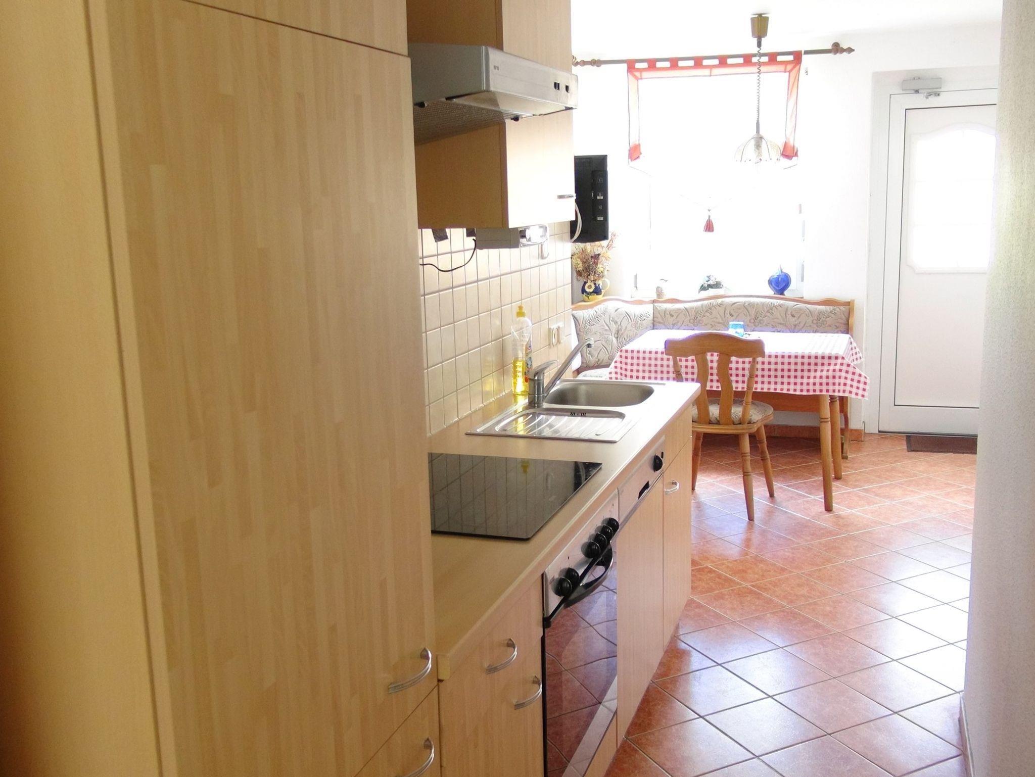 • moderne Einbauküche mit Geschirrspüler, Ceran-Kochherd (4 Kochzonen) Backofen, Mikrowelle, Toaster, Wasserkocher, Spüle, Kühlschrank (mit Gefrierfach), Abzugshaube, Kaffeemaschine, Geschirr u.m.