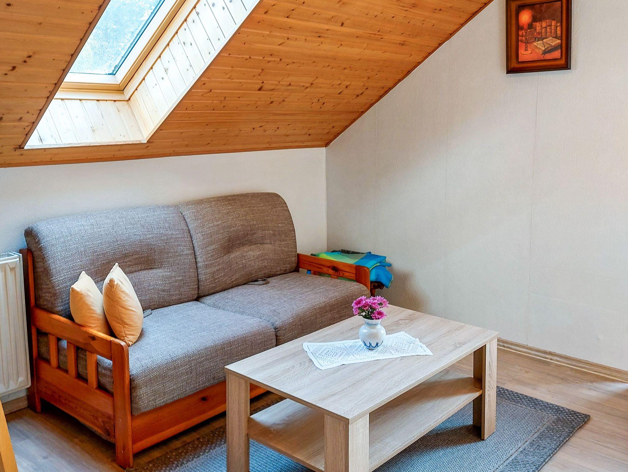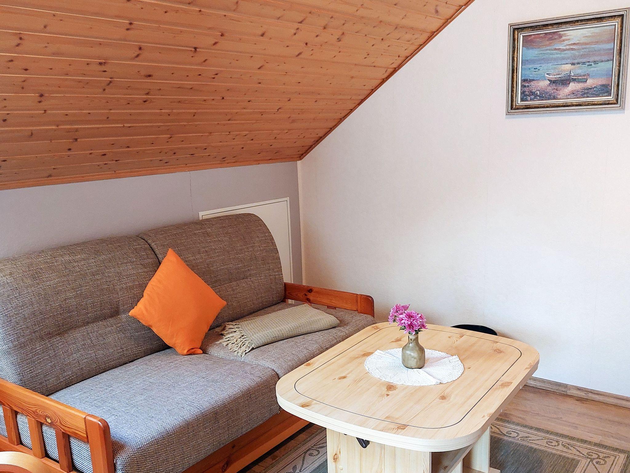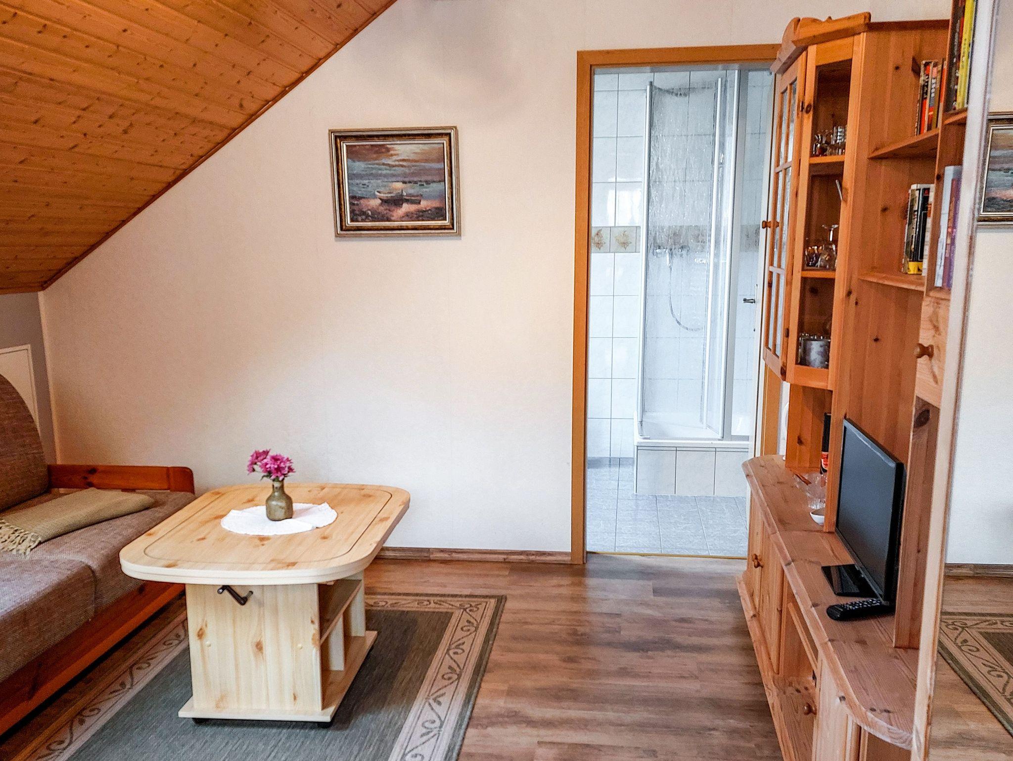 Das 21 m² große Einzelzimmer im Dachgeschoss des Gästehauses ist ein ruhiger Rückzugsort für alle, die es unkompliziert und gemütlich mögen. Über eine Außentreppe erreichst du dein Zimmer, wo dich ein bequemes Einzelbett (90x200) erwartet. Für eine zusätzliche Person steht ein Schlafsofa (150x190) bereit, perfekt, wenn du nicht allein reisen möchtest. Das Zimmer verfügt über einen TV, einen Kleiderschrank sowie einen Wasserkocher. Das angrenzende Bad ist mit einer Dusche und WC ausgestattet. Auch dein Hund darf gern mitkommen, bedenke nur, dass das Zimmer im Dachgeschoss liegt und über eine Eisentreppe erfolgt.