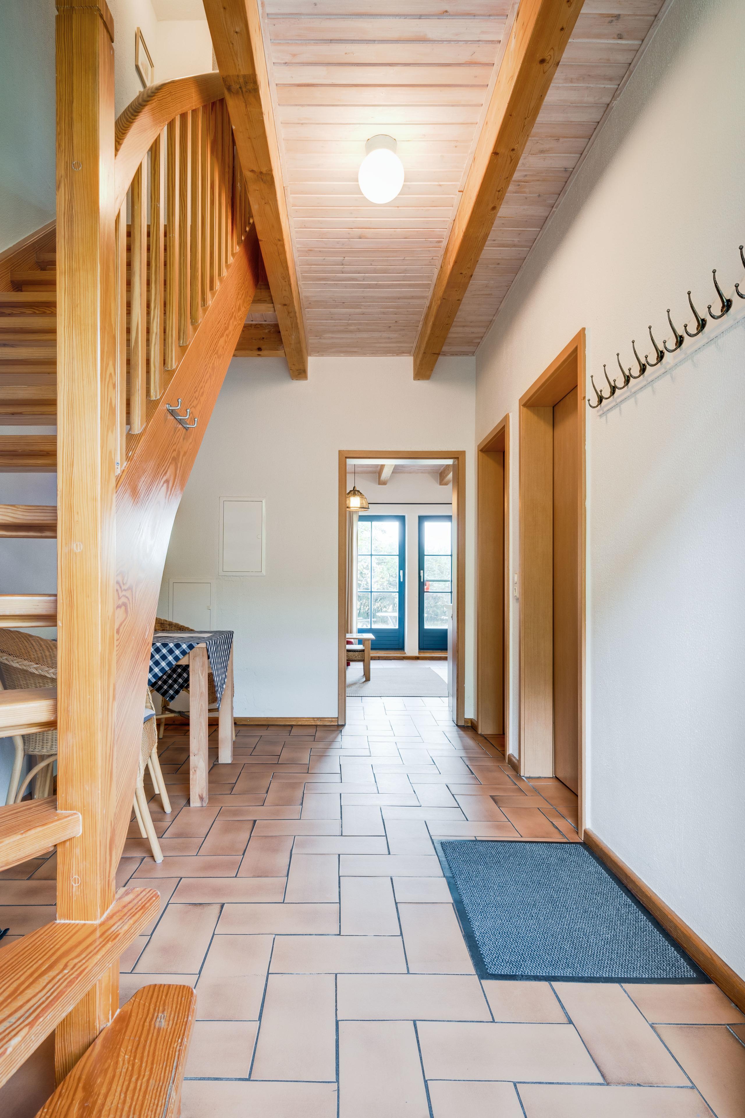 Das Apartment auf ca. 83 m² bietet Platz für max. 6 Personen. Im Erdgeschoss befinden sich das große Wohnzimmer mit Einbauküche, Kamin und Terrasse, ein Schlafzimmer und das Gäste-WC. Eine breite Holztreppe im Eingangsbereich führt in das OG mit 2 Schlafzimmern und einem Badezimmer (DU/WC).