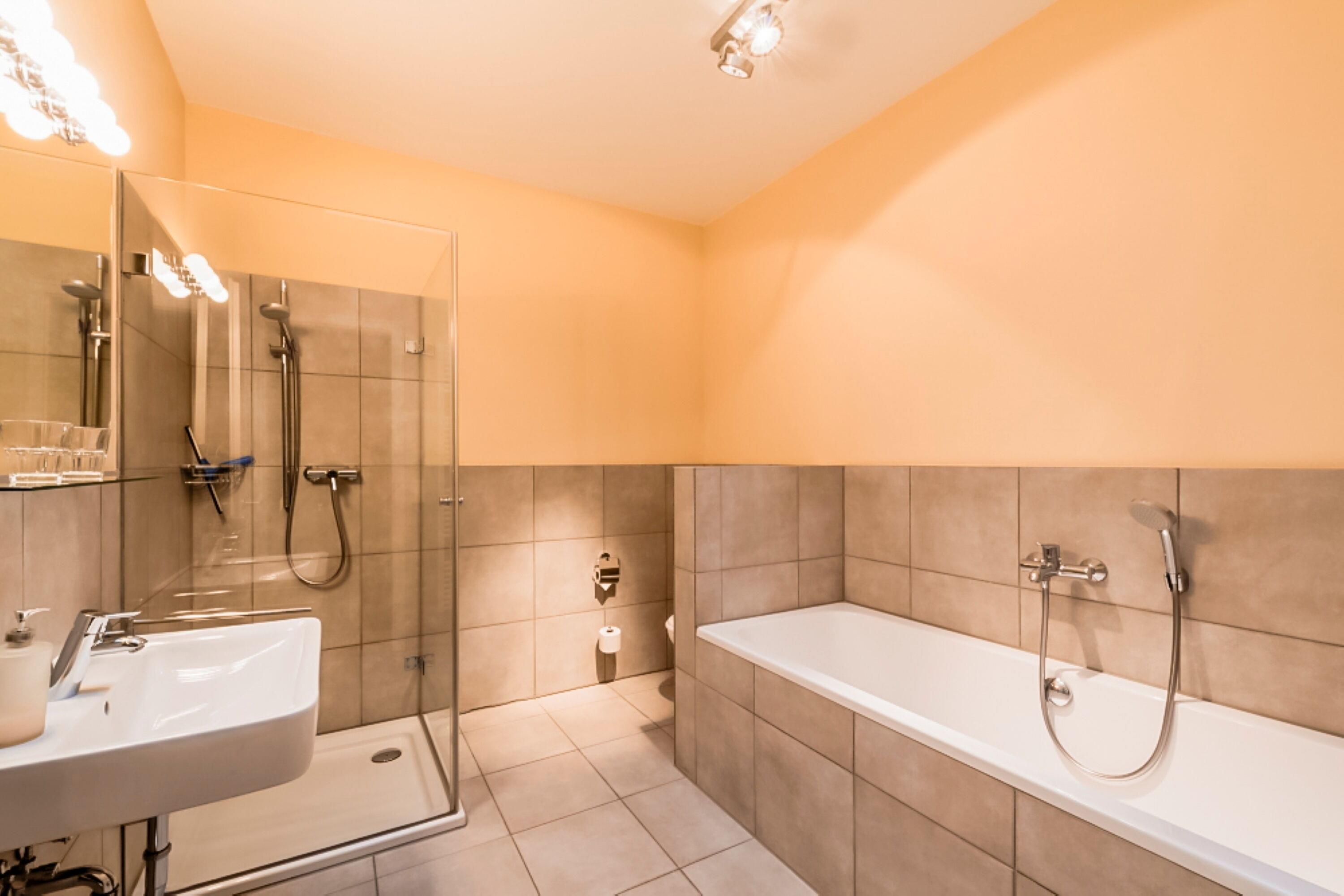 Modernes Badezimmer: Mit Badewanne, Dusche, Waschtisch und WC