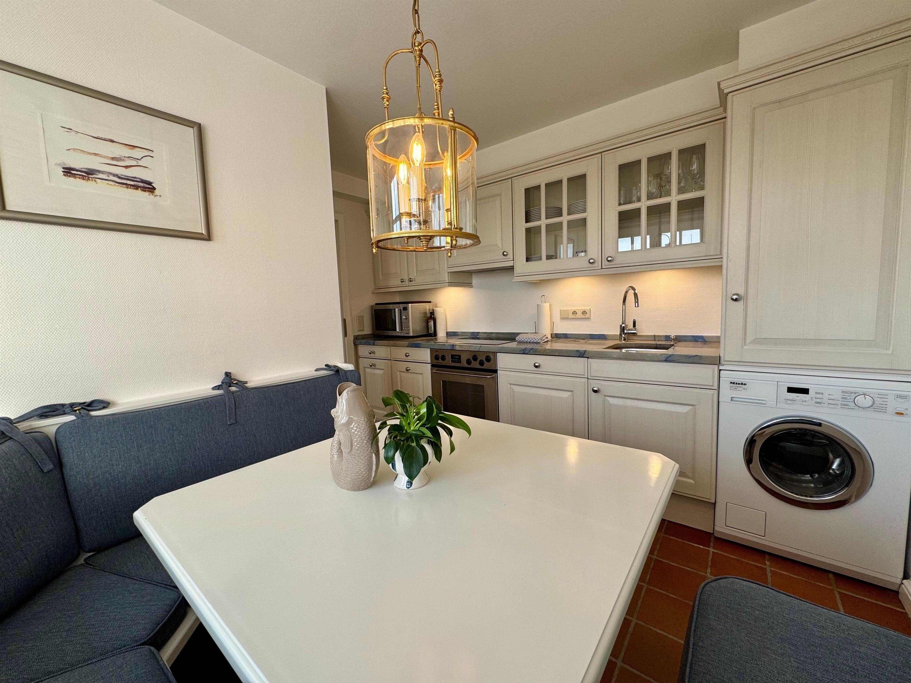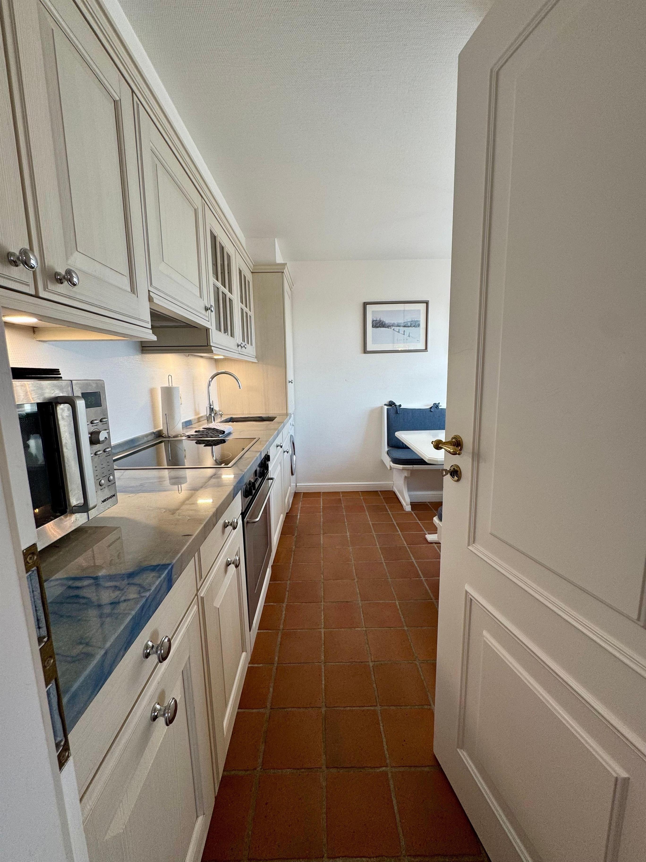 Die Küche im Erdgeschoss bietet eine umfassende Ausstattung: Backofen, 4-Zonen Kochfeld, Natursteinarbeitsplatte, Geschirrspüler, Miele Waschmaschine mit integriertem Trockner und diversen Kleingeräten, wie Filterkaffeemaschine, Nespresso, Toaster und Mikrowelle.