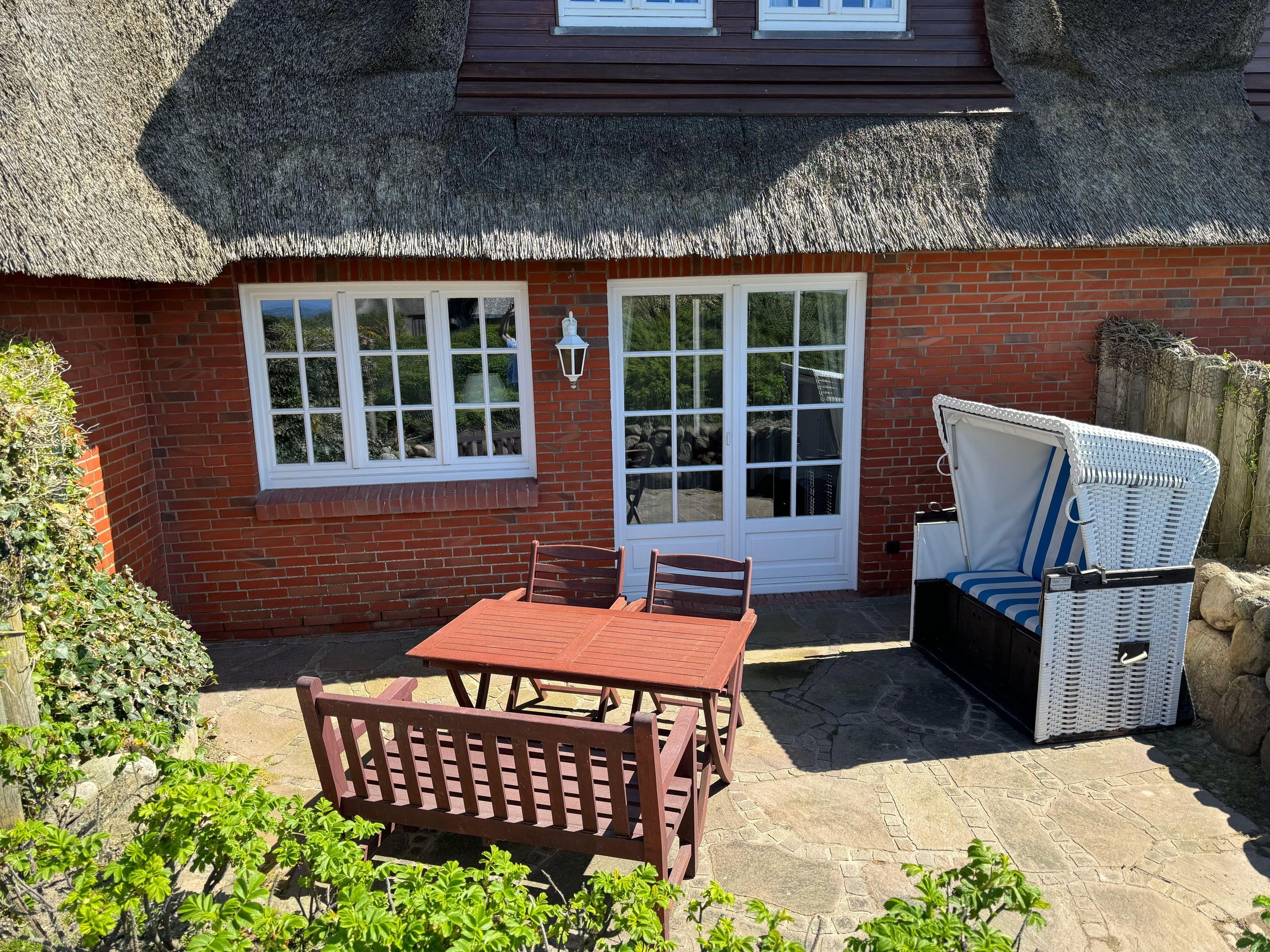 Die mit Sylter Rosen umwachsene Südwestterrasse bietet einen großen Strandkorb mit Tisch und Stühlen.