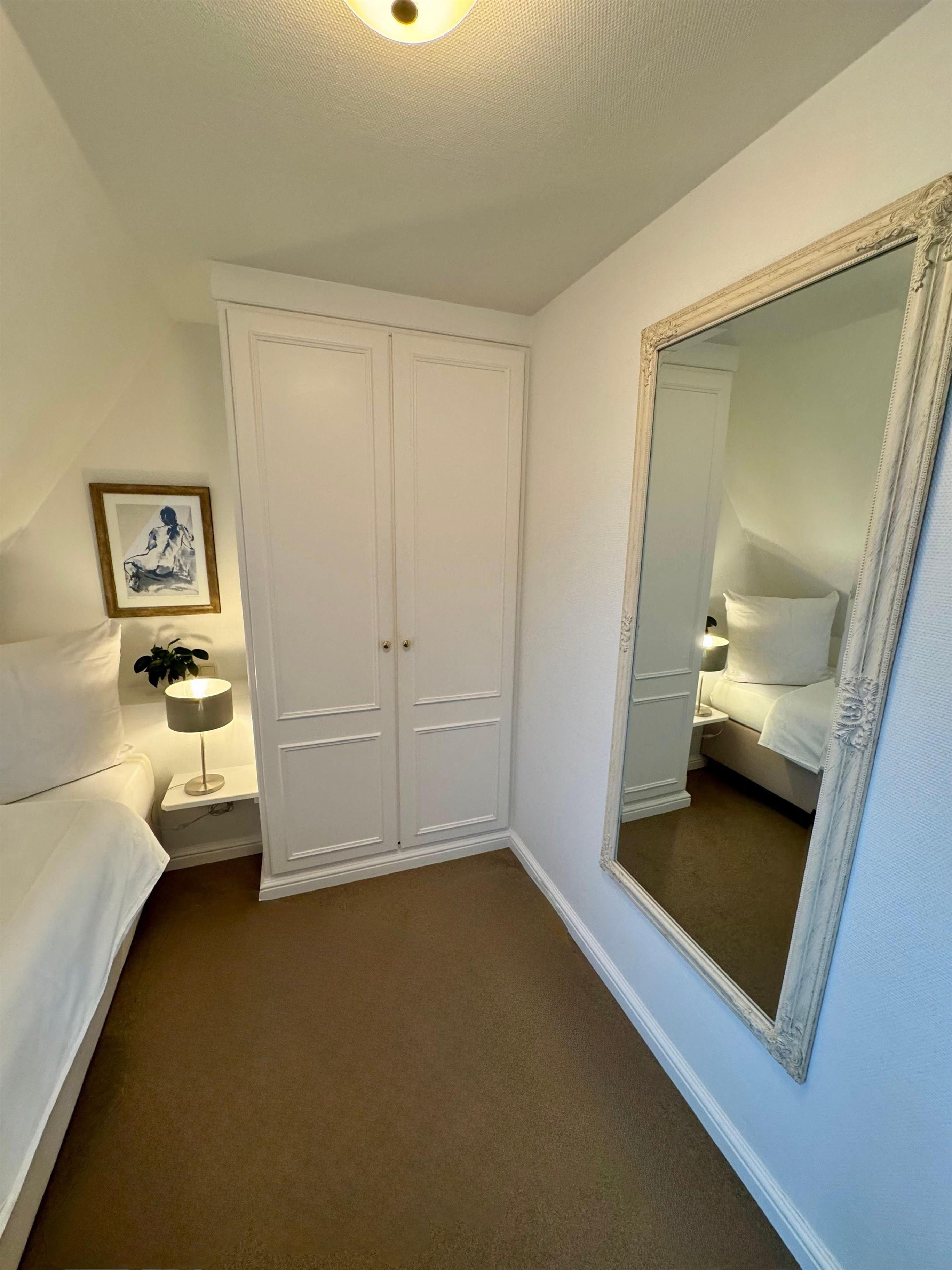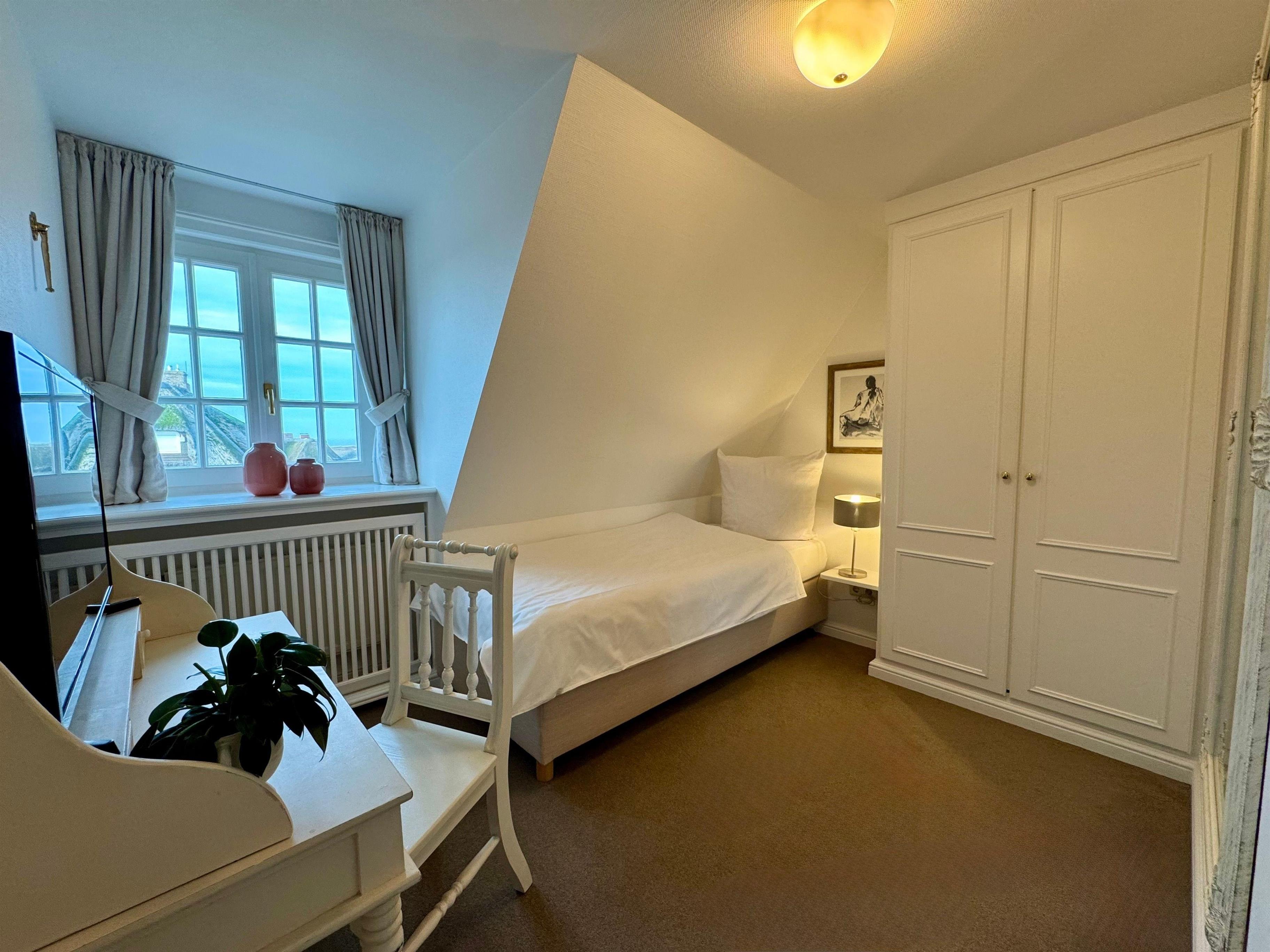 Im hyggeligen Obergeschoss mit Dachschrägen befinden sich ein Schlafzimmer mit Boxspring-Doppelbett (1,80x2,00m) mit Blick auf das Wattenmeer und ein zweites Schlafzimmer mit Blick auf die Nordsee und einem Boxspring-Einzelbett (0,90x2,00). Beide Schlafzimmer sind mit Flachbildfernsehern ausgestattet.