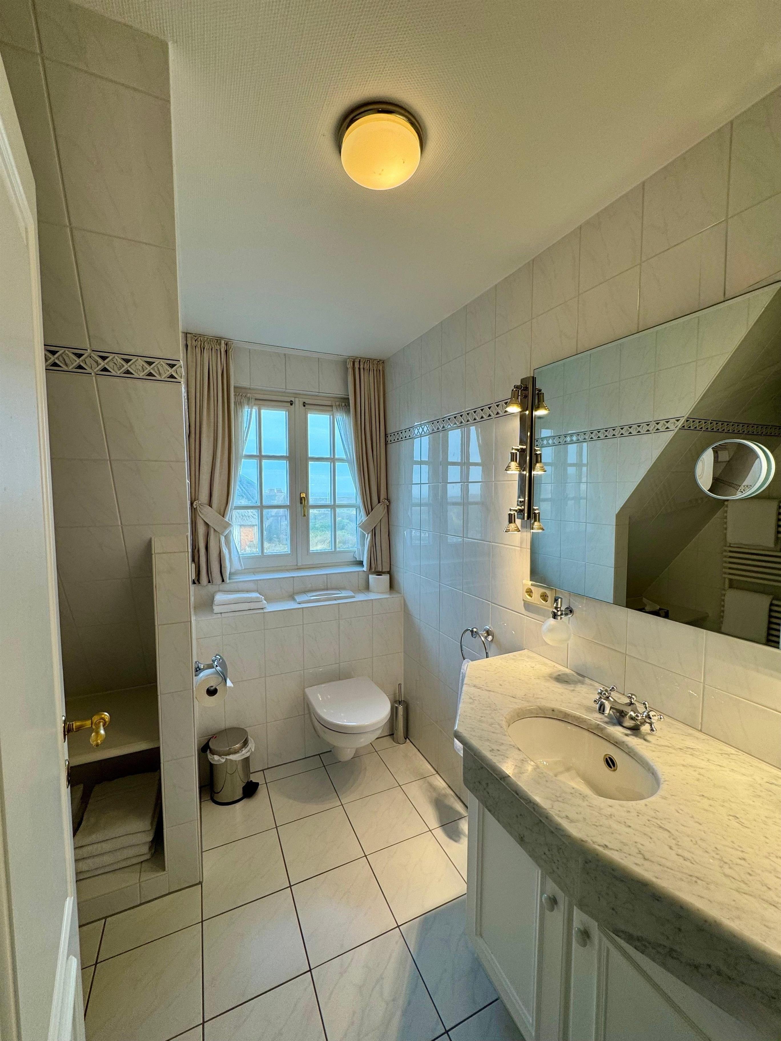Das Badezimmer im Obergeschoss mit Nordseeblick ist mit Marmorwaschtisch, Dusche, Föhn, Handtuchtrockner und Toilette ausgestattet.