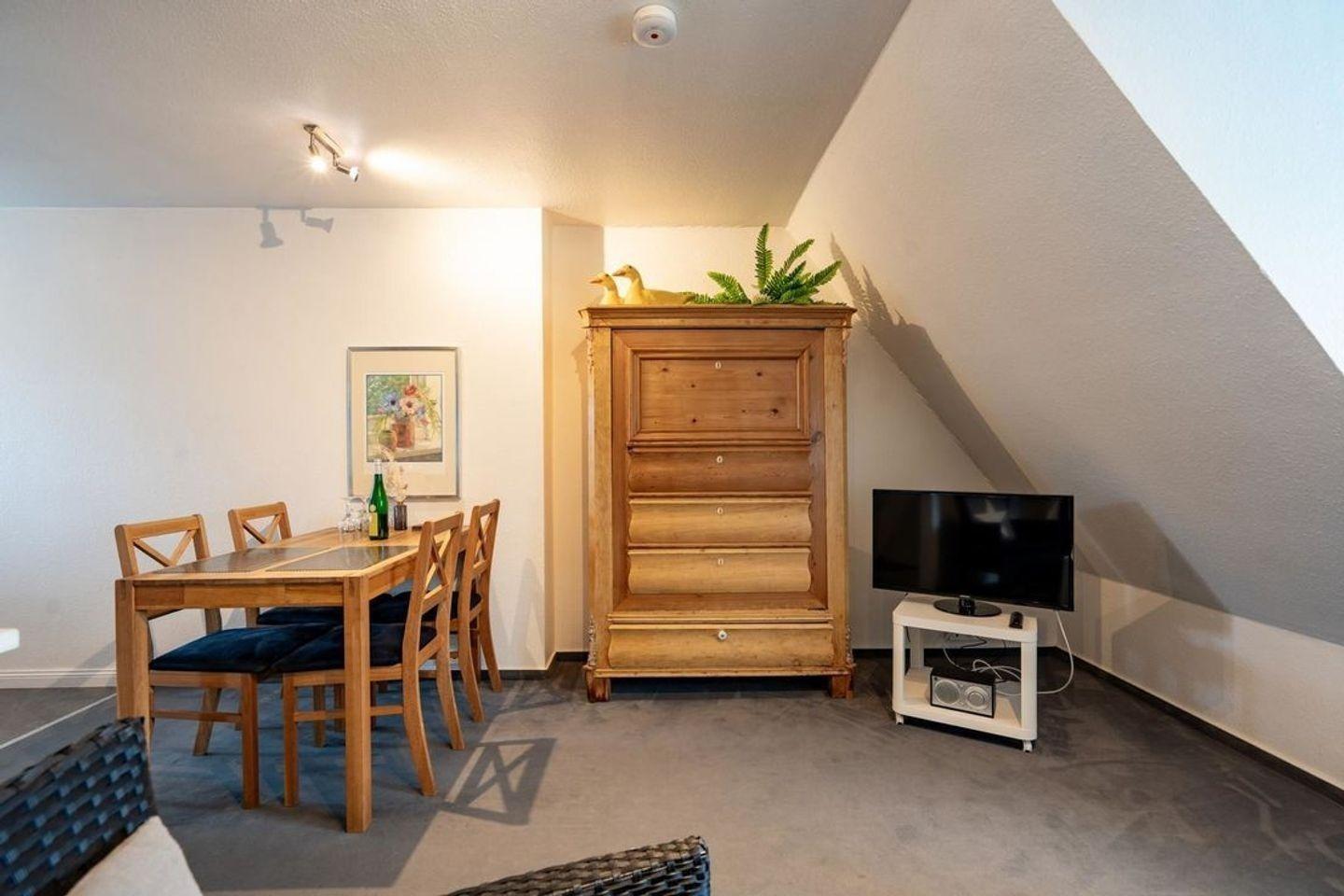 Das Wohnzimmer mit gemütlichem Sofa, 2 bequemen Sesseln, einem Couchtisch, ein Kleiderschrank und ein Esstisch für 4 Personen laden zum Verweilen ein. Für Unterhaltung sorgen TV, Radio, Telefon und WLAN und runden Ihr Wohlbefinden ab.