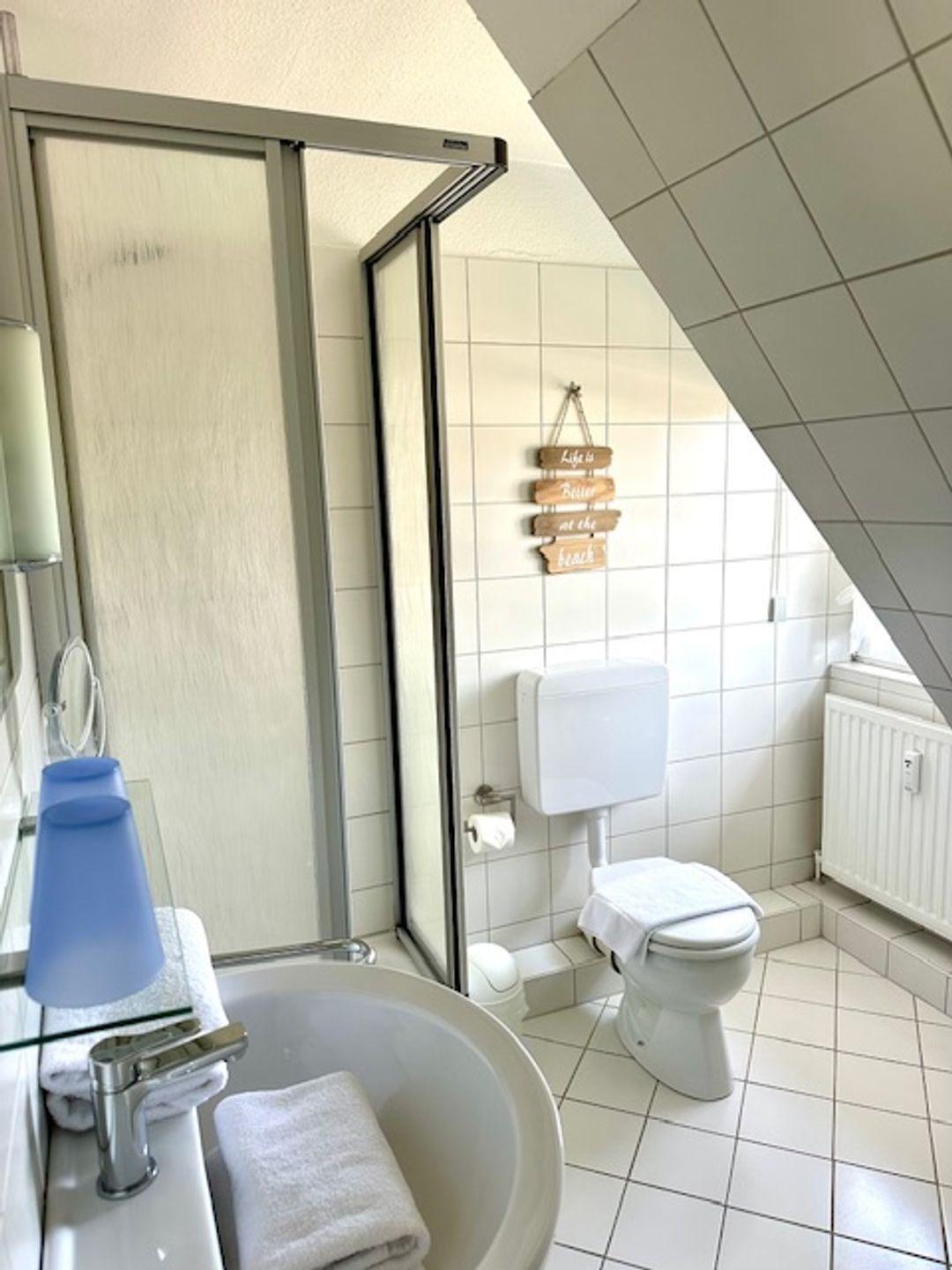 Im hellen Duschbad mit großem Fenster, Waschbecken, WC und Haartrockner befindet sich zusätzlich ein halbhoher Schrank.