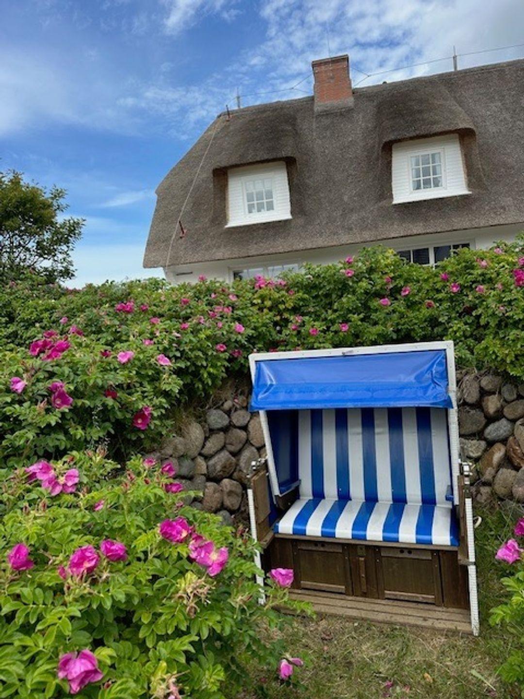 In der ansprechend weitläufigen Gartenanlage steht eine einladende nach Süden ausgerichtete windgeschützte Sonnenkuhle für Sie bereit, ausgestattet mit einem Strandkorb (von Ostern bis Ende September).