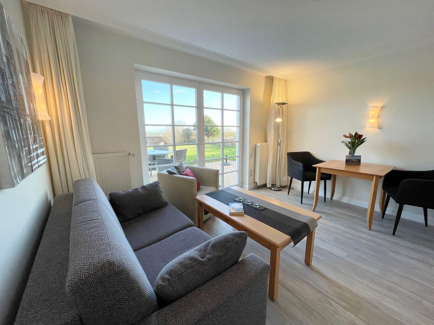 Das Appartement befindet sich im Erdgeschoß. Vom Wohnzimmer haben Sie einen herrlichen Blick aufs Wattenmeer. Die großzügige Terrasse hat eine Süd- Ost- und Westausrichtung. Nur 7 Gehminuten liegt der Strand entfernt. Gute Restaurants und Einkaufsmöglichkeiten sind in unmittelbarer Nähe.