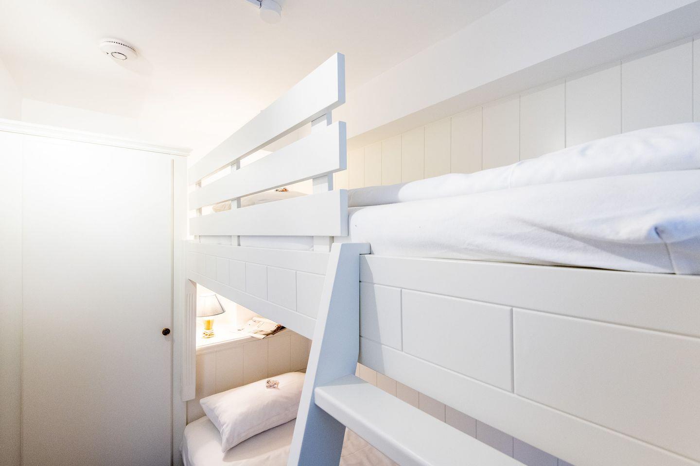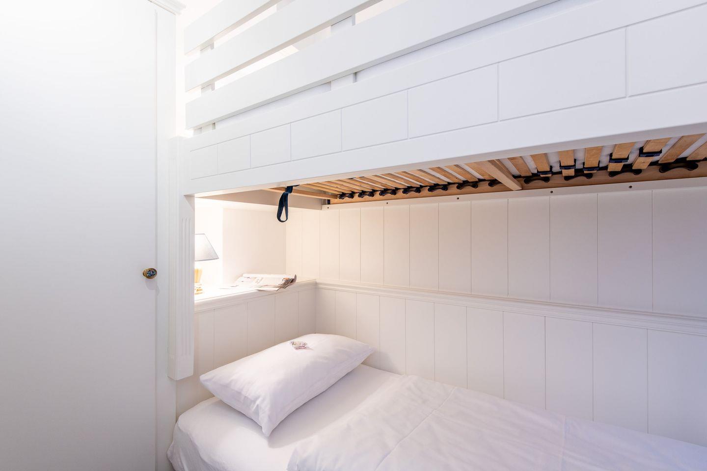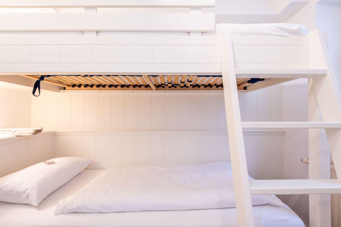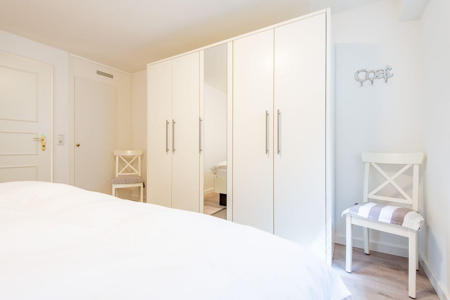 Im Hauptschlafzimmer erwartet Sie ein gemütliches Doppelbett (160 x 200 cm), das erholsamen Schlaf garantiert. Ein großzügiger Kleiderschrank bietet ausreichend Stauraum für Ihre Urlaubsgarderobe. Das zweite Schlafzimmer ist mit einem komfortablen Einzel-Etagenbett (90 x 200 cm) ausgestattet und verfügt über einen kleinen Kleiderschrank. Dieses Zimmer eignet sich perfekt für eine weitere Person oder als ruhiger Rückzugsort.