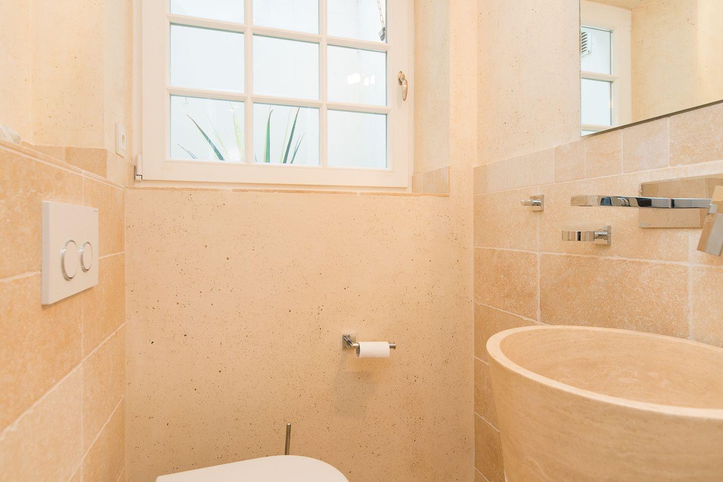 Im gesamten Haus sorgen helle Natursteinfliesen sowie eine Fußbodenheizung in den Wohn- und Badezimmern für angenehmen Komfort.