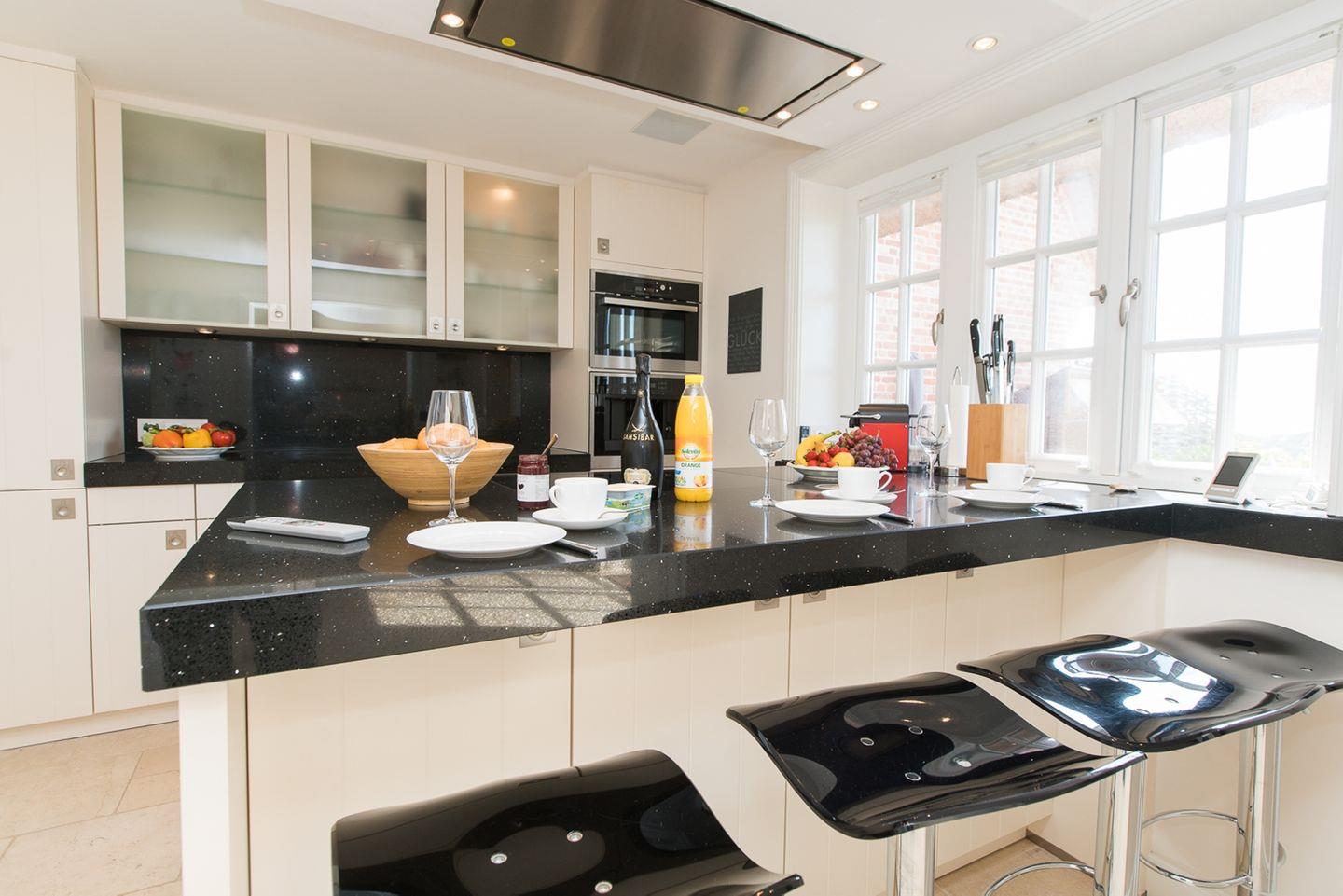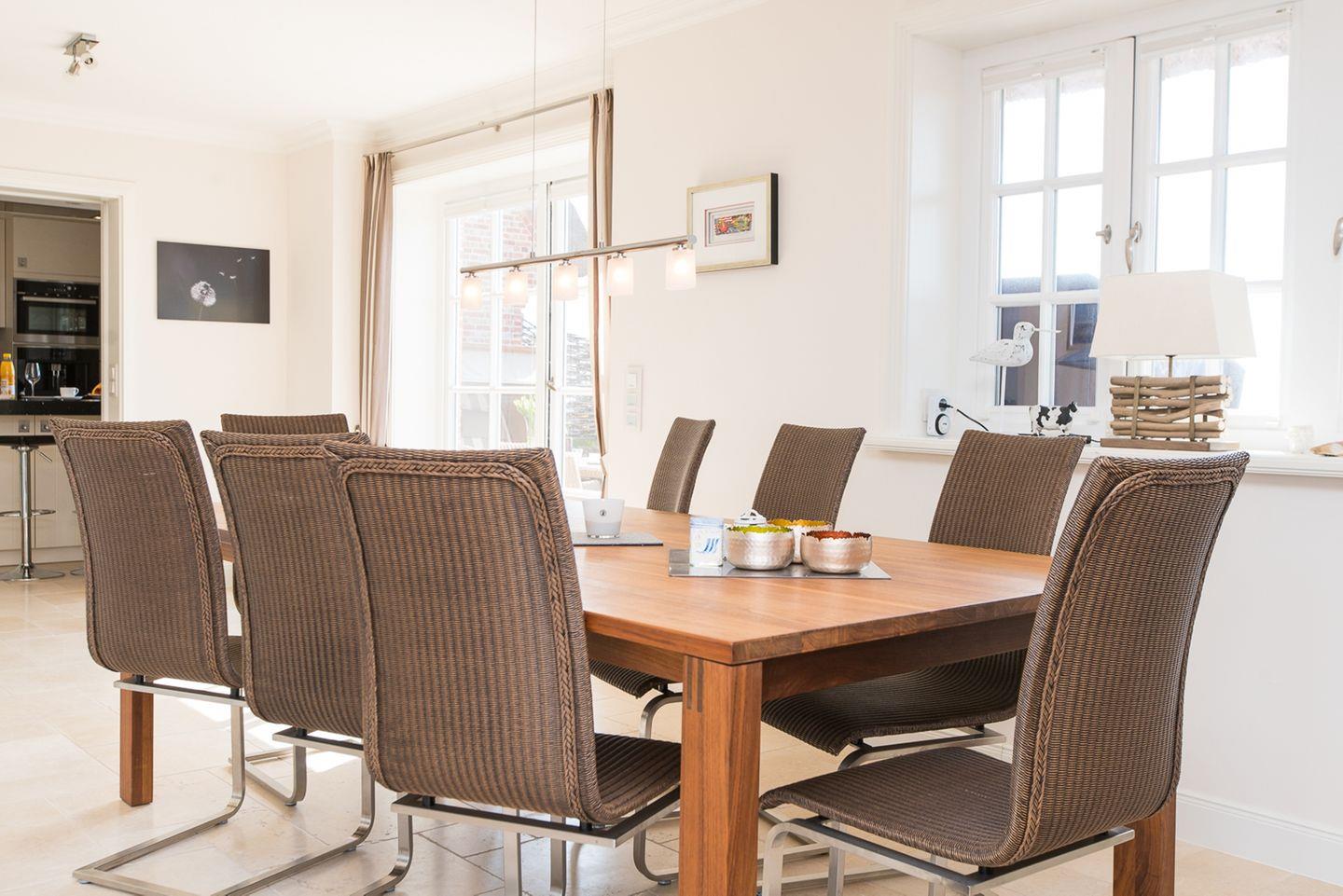 Im Erdgeschoss empfängt Sie eine großzügige Diele mit Zugang zum Gäste-WC sowie zum stilvollen Wohn- und Essbereich mit offener Küche. Der Essbereich bietet Platz für bis zu acht Personen und lädt zu geselligen Abenden ein. Die hochwertige Küche mit Kochinsel und integriertem Esstresen ist vollständig ausgestattet und lässt keine Wünsche offen – ideal für gemeinsames Kochen und Genießen.