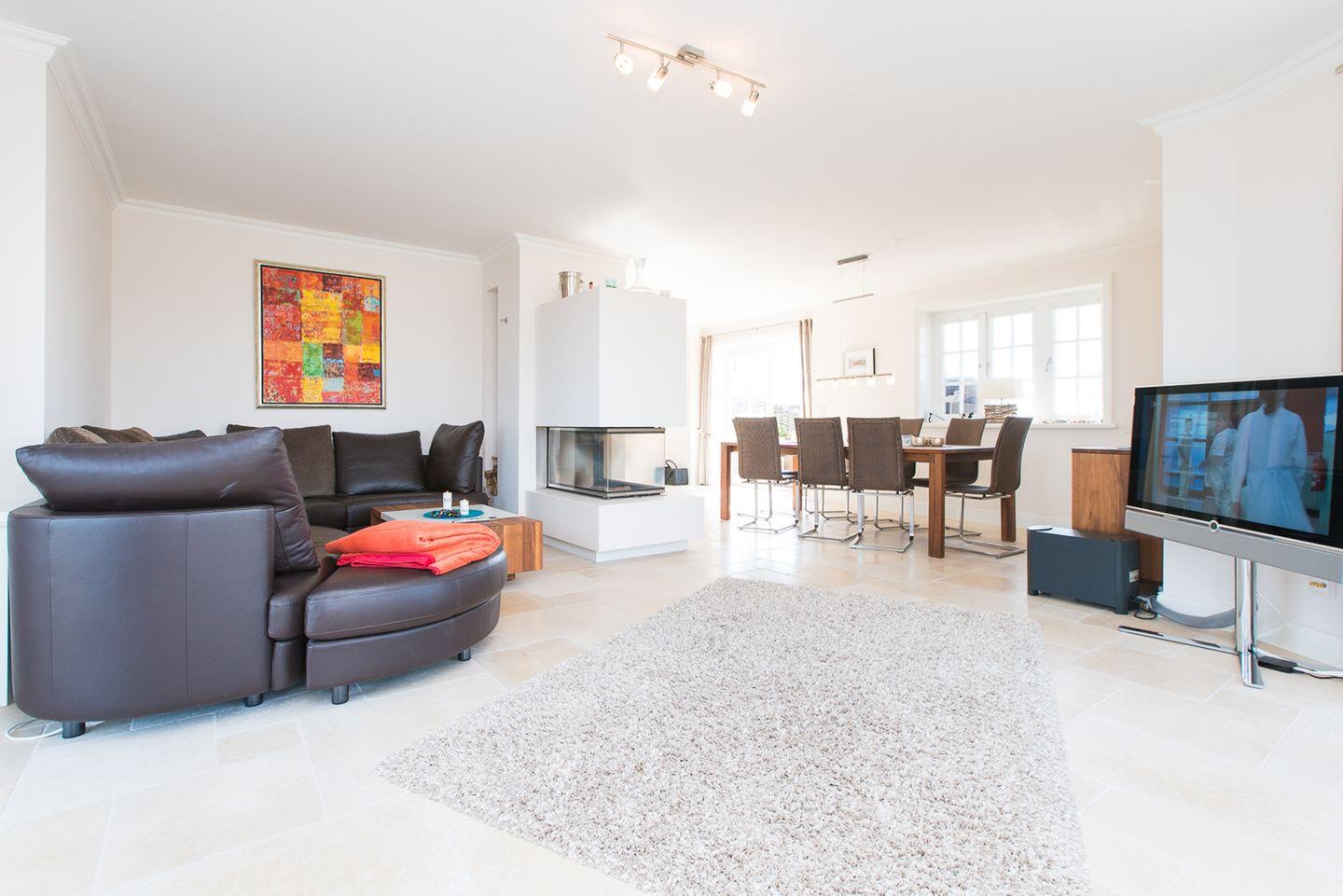 Für besonders stimmungsvolle Abende sorgt der rundum verglaste Kaminofen im Wohnbereich. Sein elegantes Design und das flackernde Feuer schaffen eine warme, gemütliche Atmosphäre – perfekt für entspannte Stunden nach einem erlebnisreichen Tag auf Sylt.