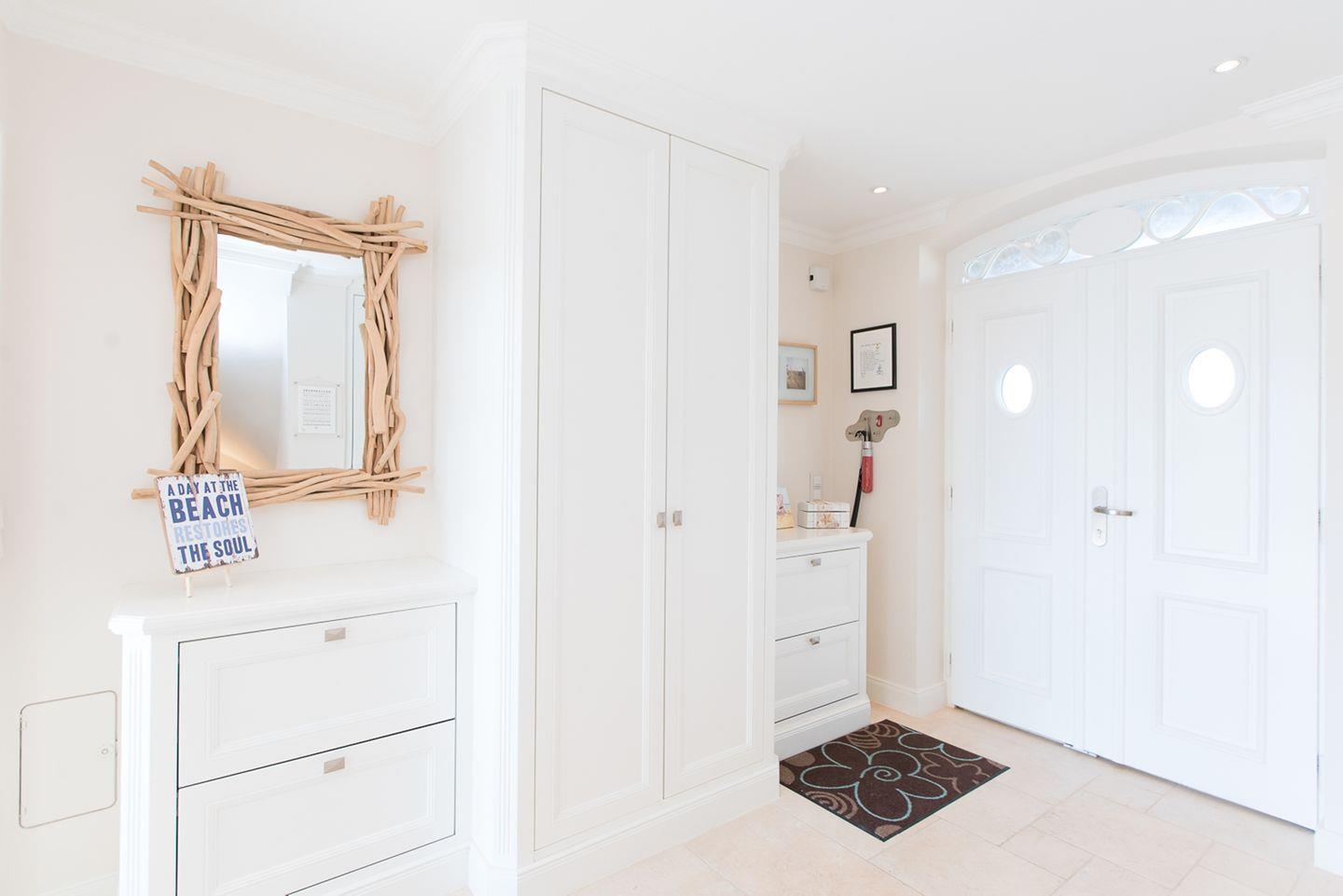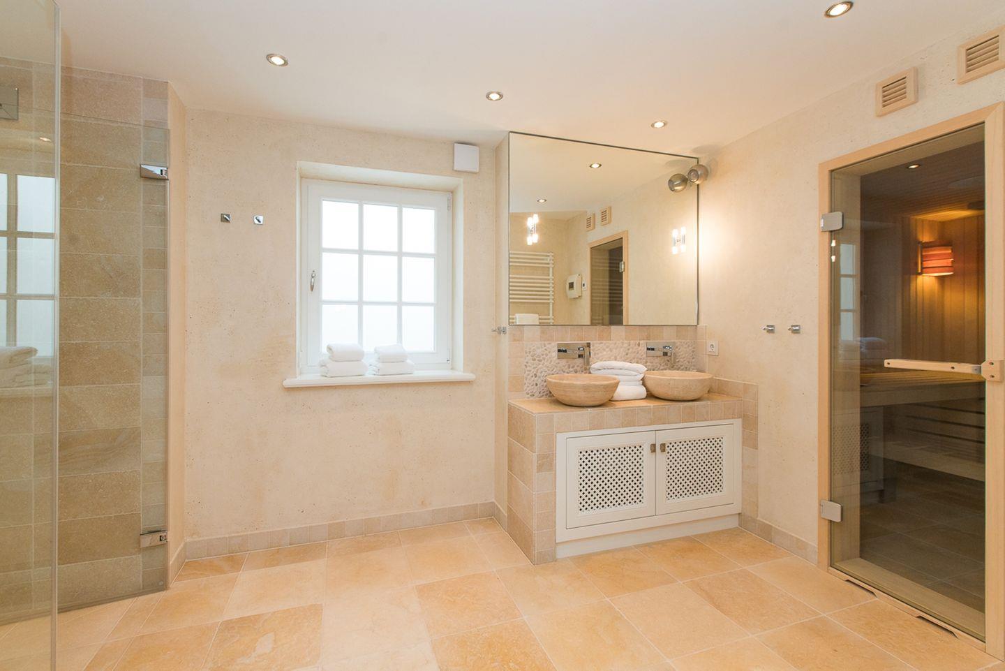 Ein besonderes Highlight ist das großzügige Wellnessbad, das einer privaten Spa-Oase gleicht. Neben einem eleganten Doppelwaschbecken erwartet Sie hier eine große ebenerdige Dusche mit Regen- und Schwallfunktion sowie eine private Sauna, die nach einem langen Strandspaziergang oder einer Fahrradtour durch die Insel zum Entspannen einlädt.