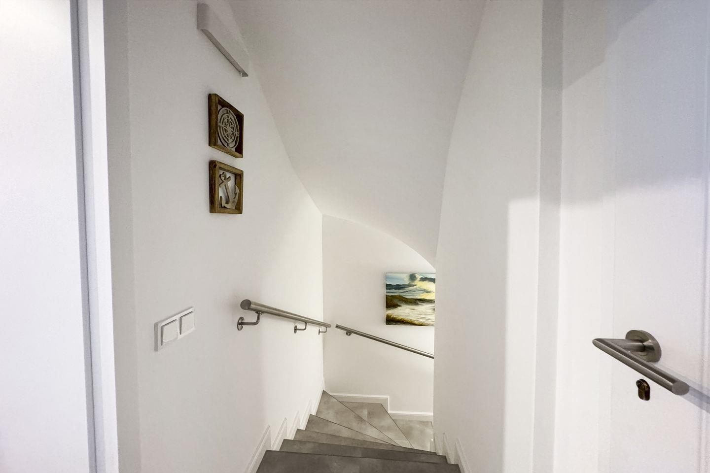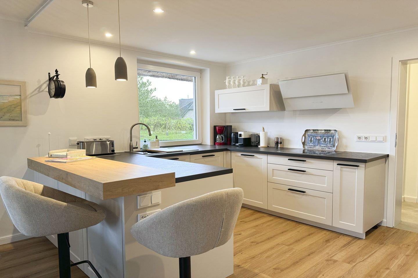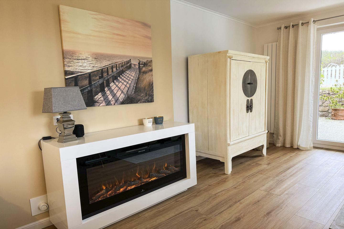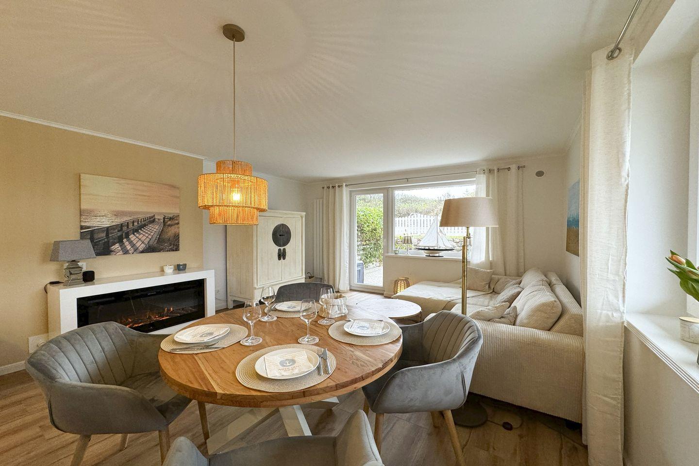 Das offen gestaltete Erdgeschoss bildet das Herzstück der Wohnung und ist perfekt für entspannte Stunden nach einem Tag am Meer oder bei Erkundungen der einzigartigen Natur Rantums. Eine topmoderne Küche mit Backofen, Herd, Geschirrspüler und einer eleganten Theke mit Barhockern lädt zum Kochen und Verweilen ein. Der angrenzende Essbereich und die bequeme Sofalandschaft ergänzen diesen Bereich ideal, abgerundet durch einen elektrischen Kamin, der nicht nur optisch durch sein flackerndes Feuer besticht, sondern auch wärmt und angenehme Knistertöne verbreitet.