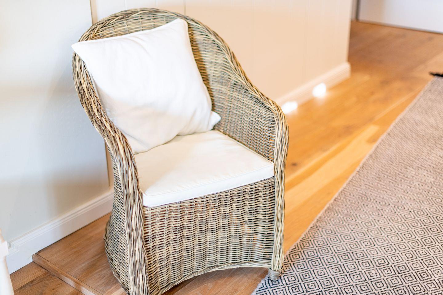 Der helle Wohn- und Schlafbereich ist optisch raffiniert voneinander getrennt und schafft so eine angenehme Balance zwischen Rückzug und Geselligkeit. Machen Sie es sich auf dem Sofa gemütlich, lehnen Sie sich im Sessel zurück und lassen Sie den Tag Revue passieren. Abends sinken Sie entspannt ins Bett und lauschen vielleicht noch dem fernen Rauschen der Nordsee, bevor Sie sanft einschlafen.