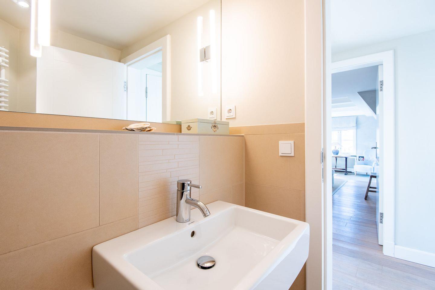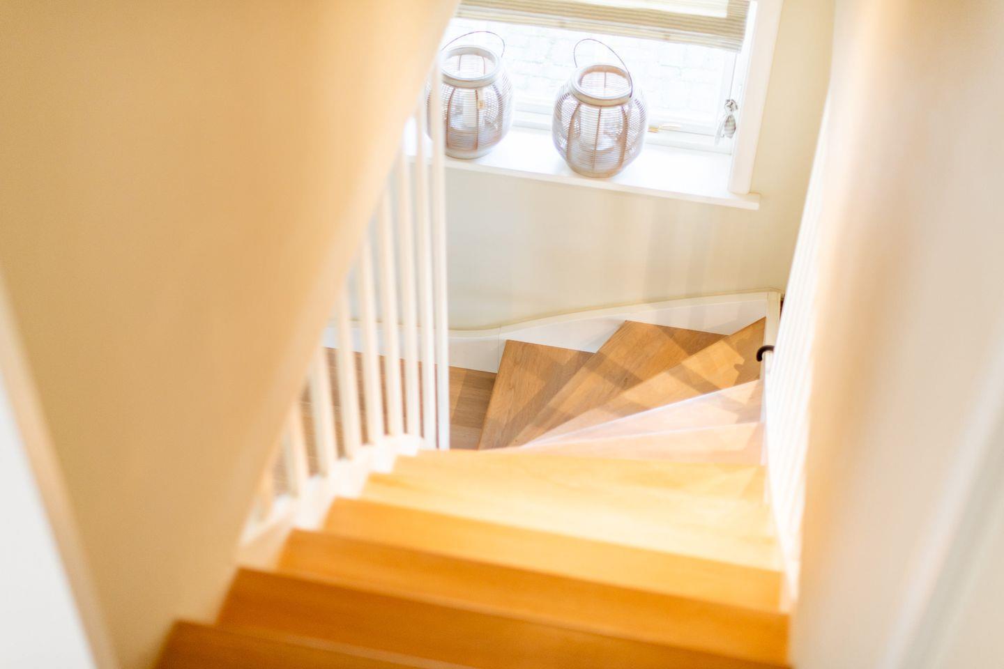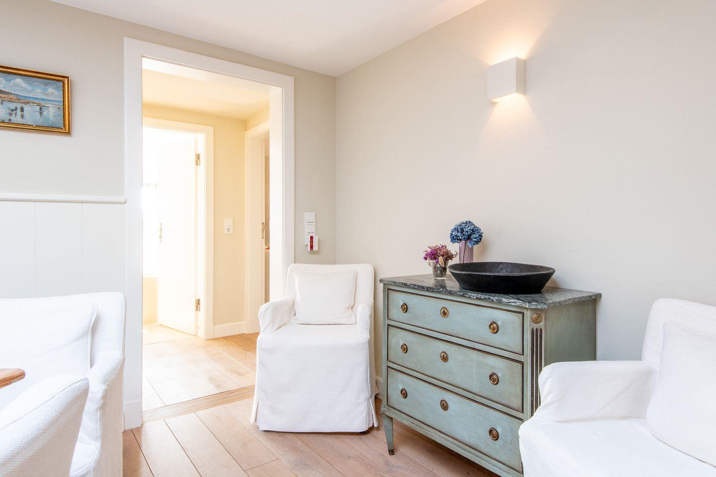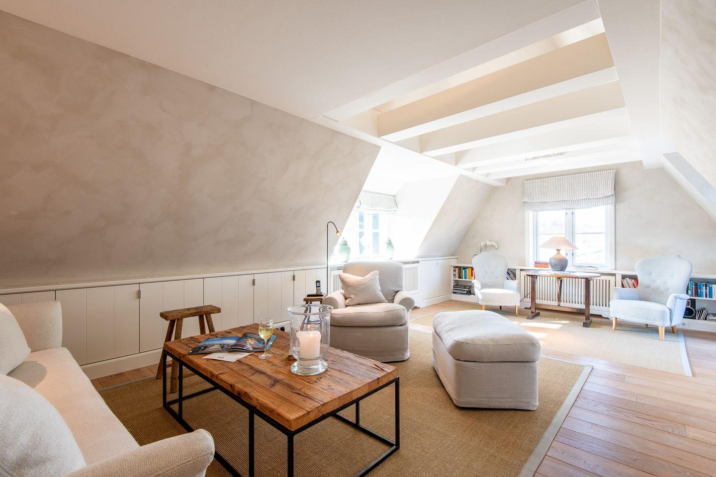 Der helle Wohnbereich lädt dazu ein, sich fallen zu lassen. Machen Sie es sich auf der gemütlichen Sofaecke bequem, lehnen Sie sich im Sessel zurück und lassen Sie den Blick schweifen. Durch den direkten Zugang zur möblierten Dachterrasse erweitern Sie Ihren Wohnraum nach draußen. Genießen Sie hier laue Abende bei einem Glas Wein, spüren Sie die frische Nordseebrise und lassen Sie den Tag entspannt ausklingen.