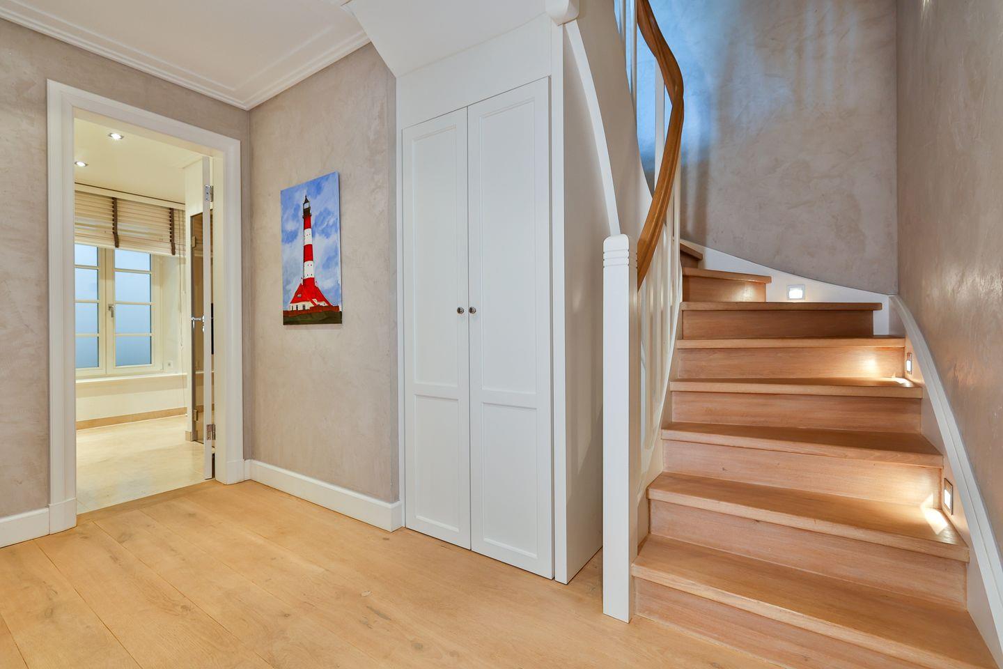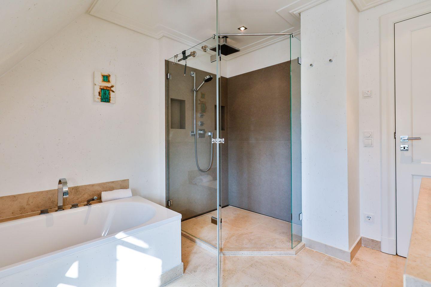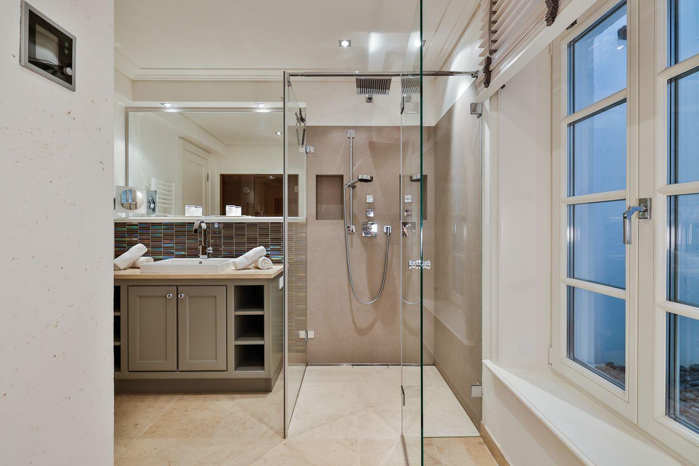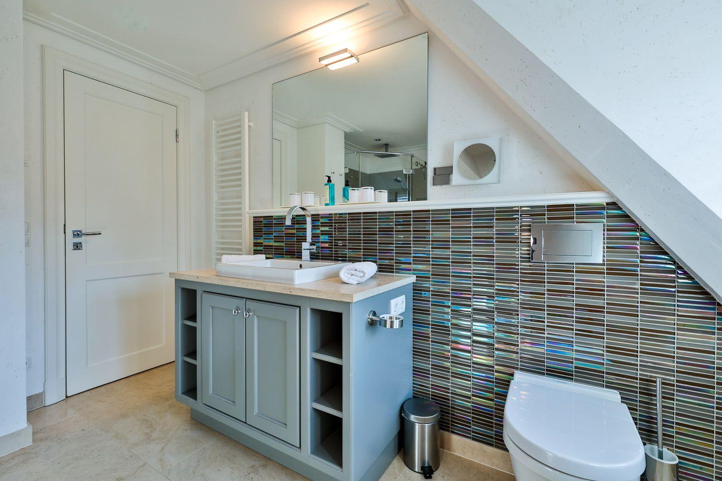 Über eine Treppe gelangen Sie in das erste Obergeschoss des Ferienhaus. Hier befinden sich zwei komfortable Schlafzimmer, die jeweils mit einem Doppelbett und Fernseher ausgestattet sind. Ebenfalls auf dieser Etage stehen Ihnen zwei moderne Badezimmer zur Verfügung. Eines der Bäder ist mit Dusche und Badewanne ausgestattet und bietet damit sowohl die Möglichkeit für eine schnelle Erfrischung als auch für ein entspanntes Bad. Das zweite Badezimmer verfügt über eine Dusche und sorgt so für zusätzliche Komfort, besonders wenn mehrere Gäste im Ferienhaus wohnen.