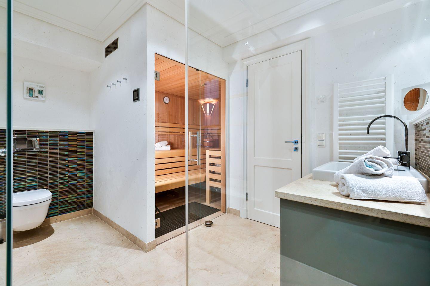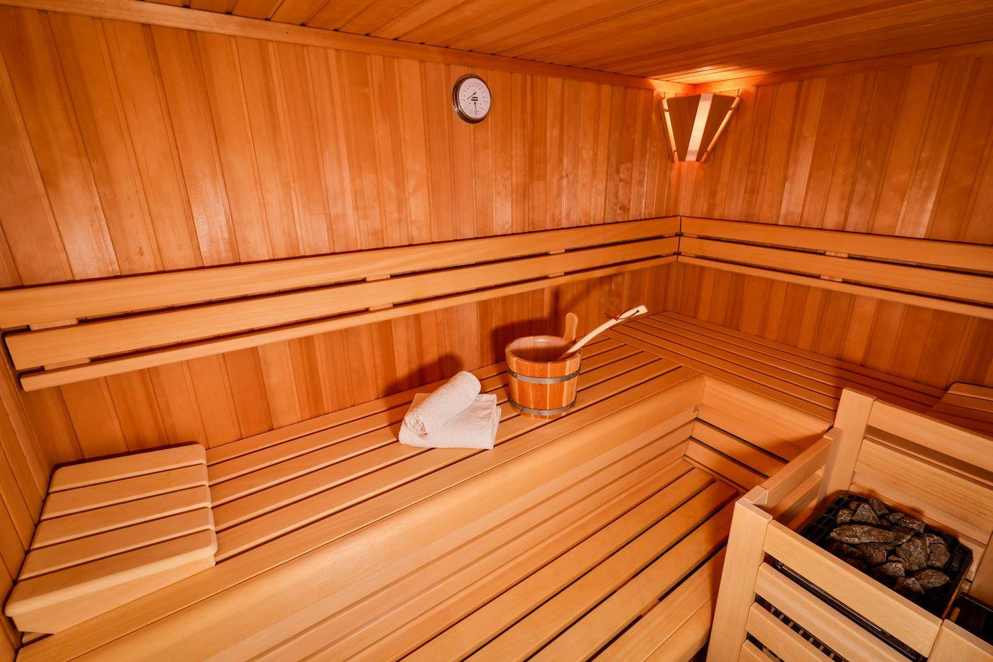 Im Untergeschoss des Ferienhauses befinden sich zwei weitere Schlafzimmer, die jeweils mit Doppelbett und Fernseher ausgestattet sind und somit ebenfalls komfortable Rückzugsorte für erholsame Nächte bieten. Darüber hinaus steht Ihnen auf dieser Ebene ein Badezimmer mit Dusche und Sauna zur Verfügung. - der perfekte Ort, um nach einem aktiven Urlaubstag zu entspannen. In einem weiteren separaten Raum befindet sich außerdem eine Waschmaschine und ein Trockner, die Ihnen während Ihres Aufenthalts zur Verfügung stehen.