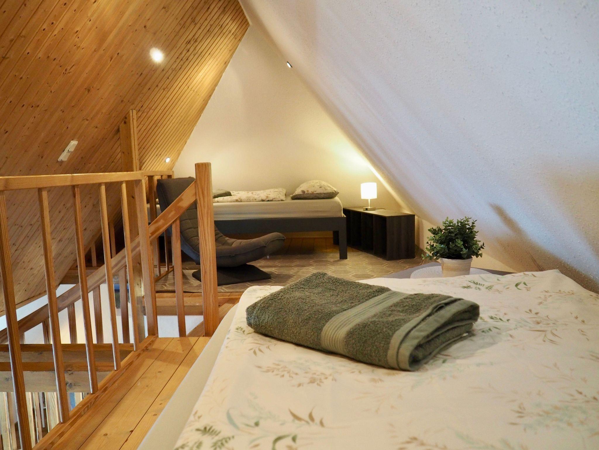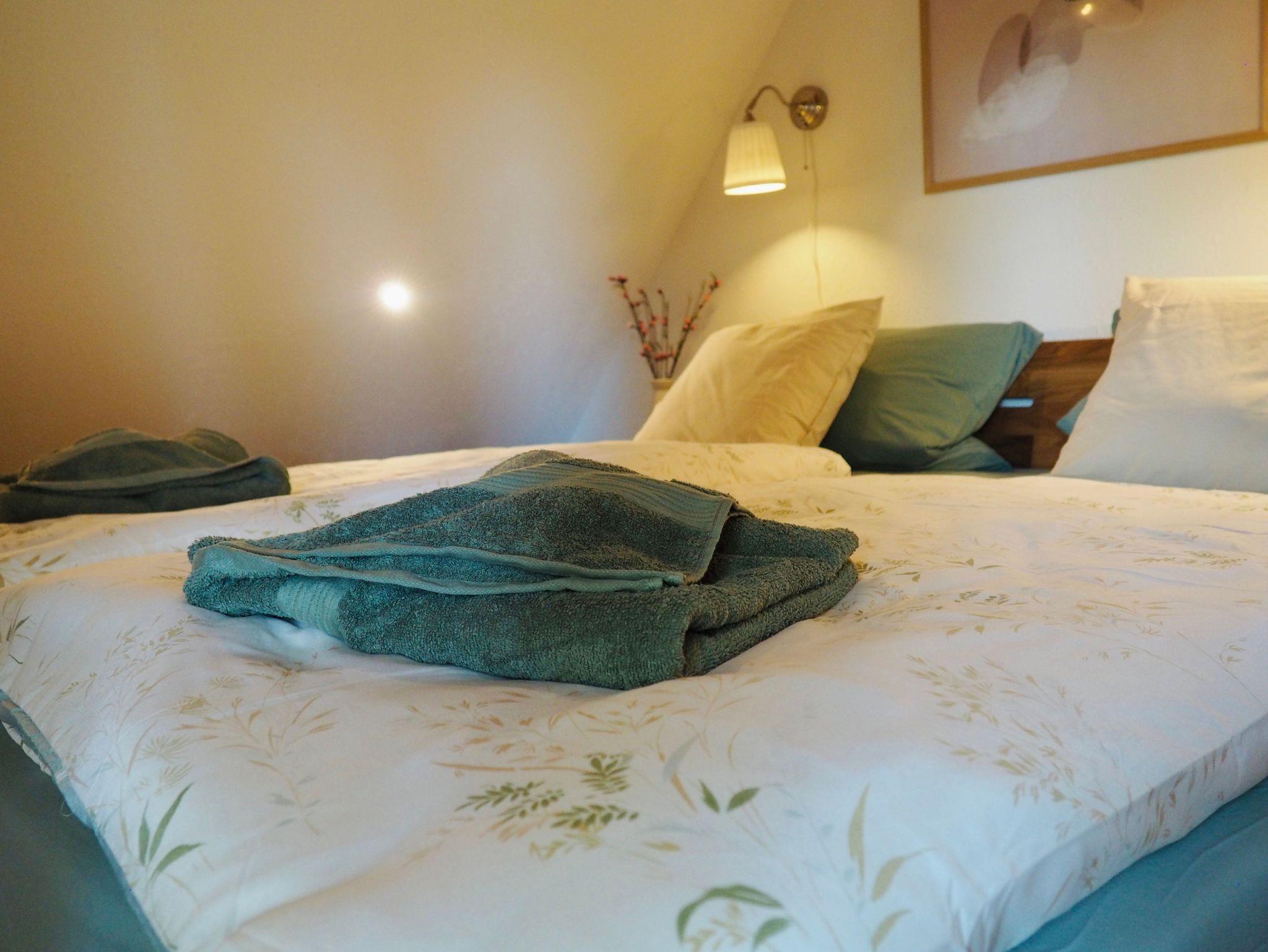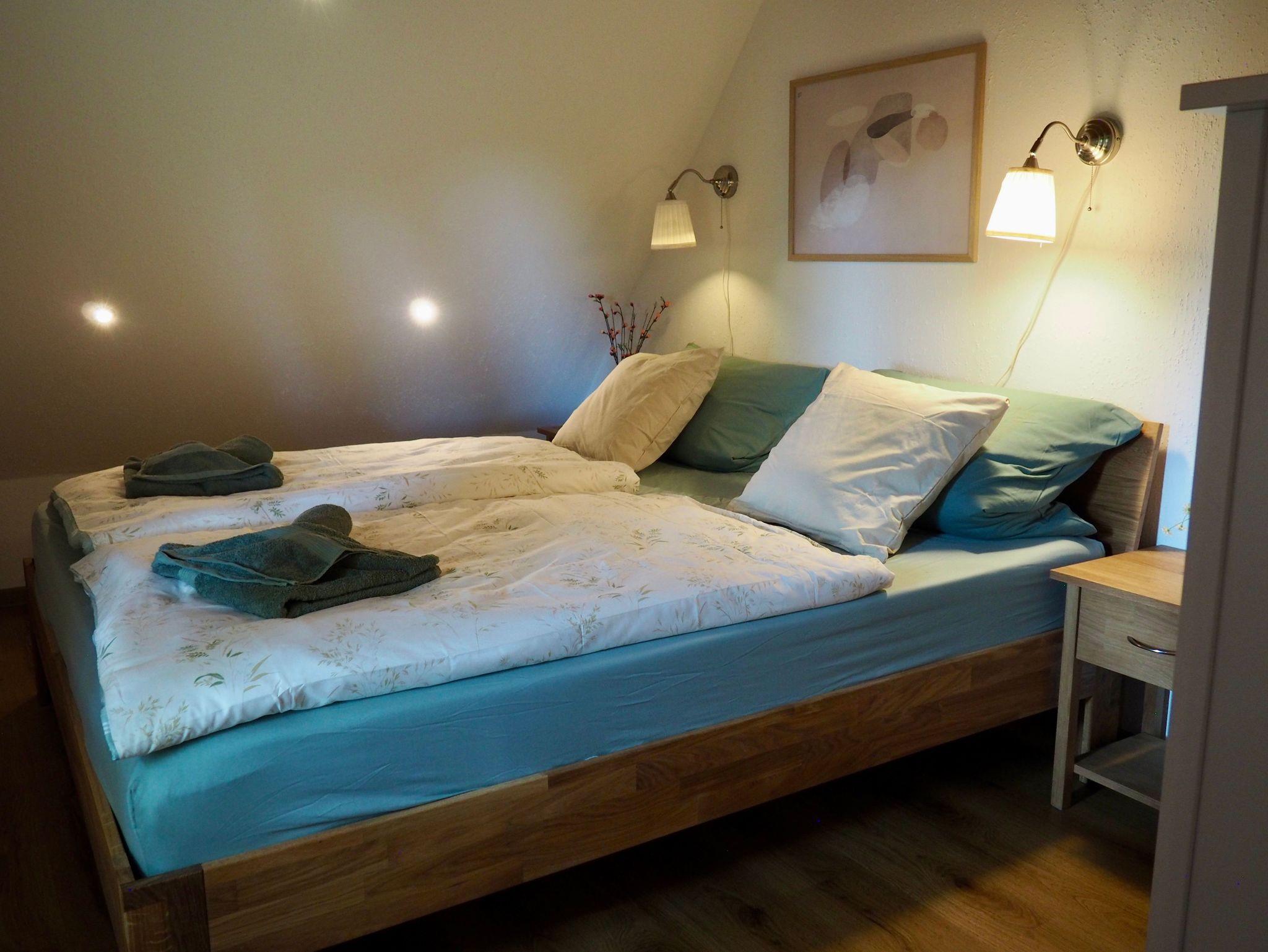 Ein behagliches Schlafzimmer mit komfortablem Doppelbett sorgt für erholsame Nächte. In der offenen Galerie im Dachgeschoss befinden sich zwei weitere Einzelbetten ein Lieblingsplatz besonders für Kinder oder junge Gäste.