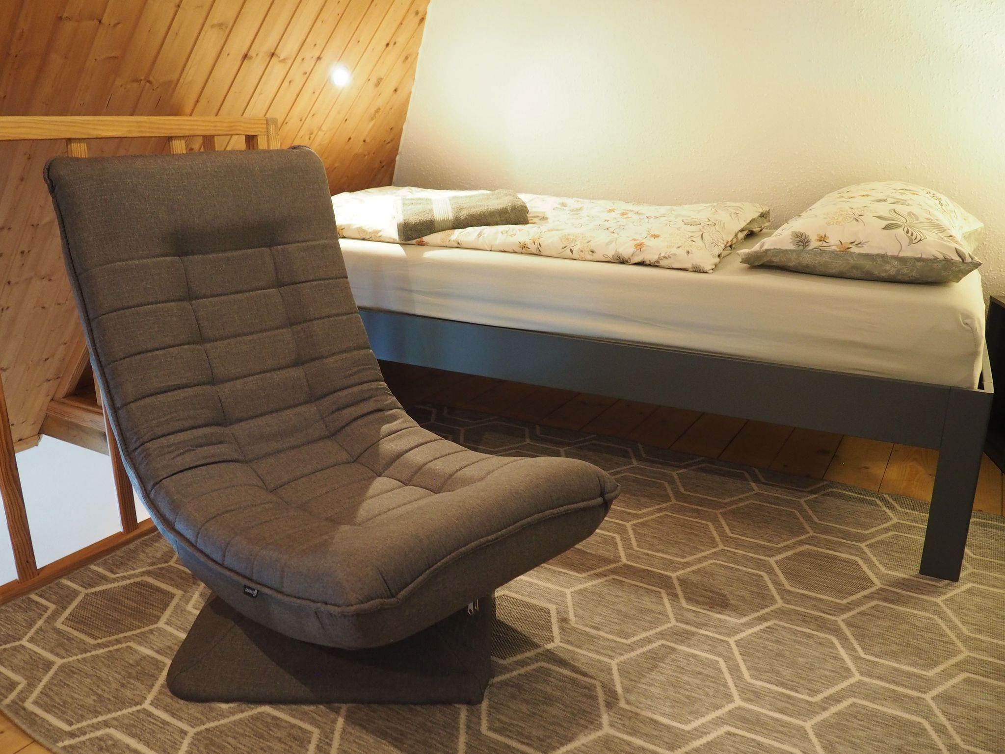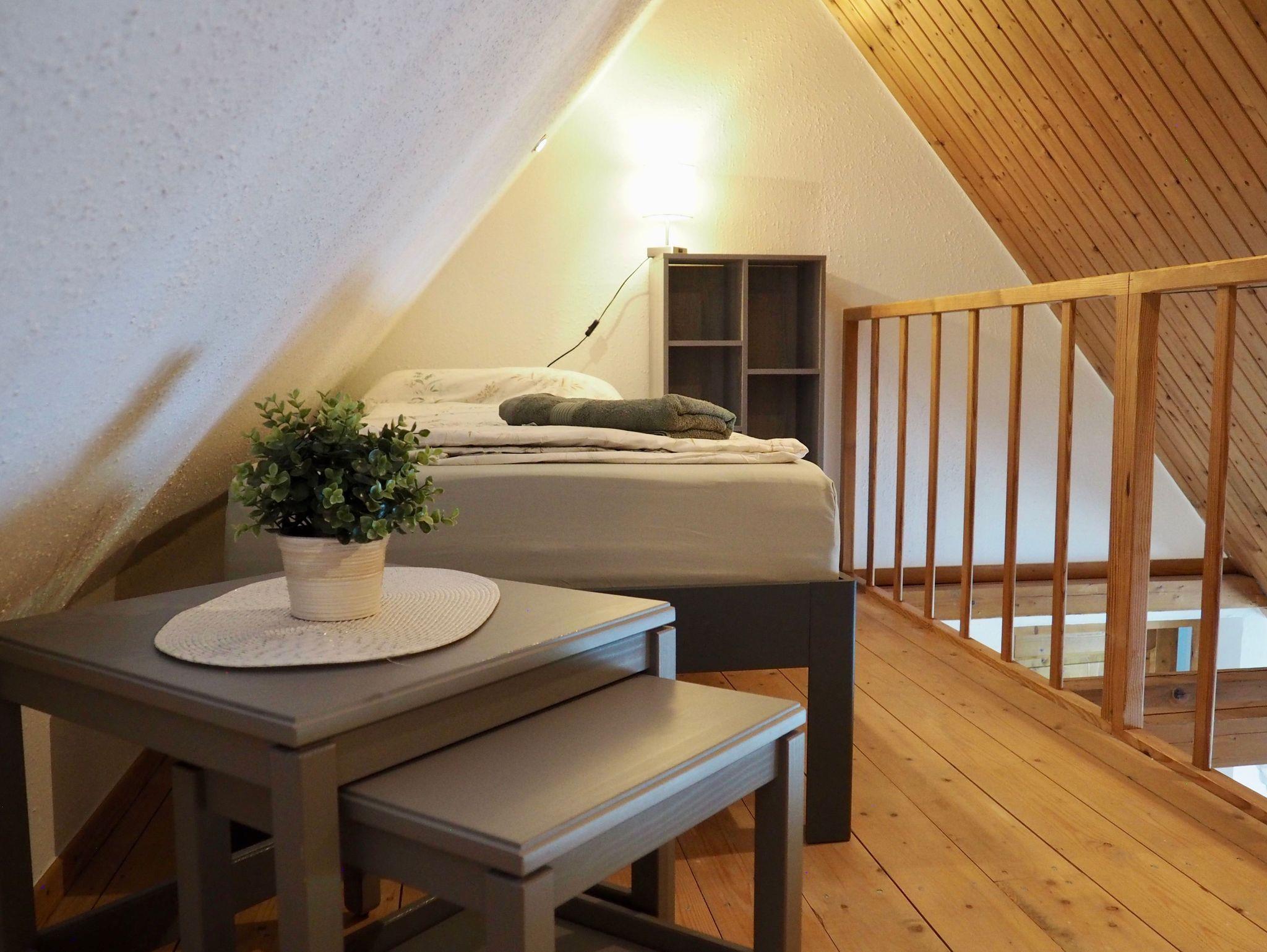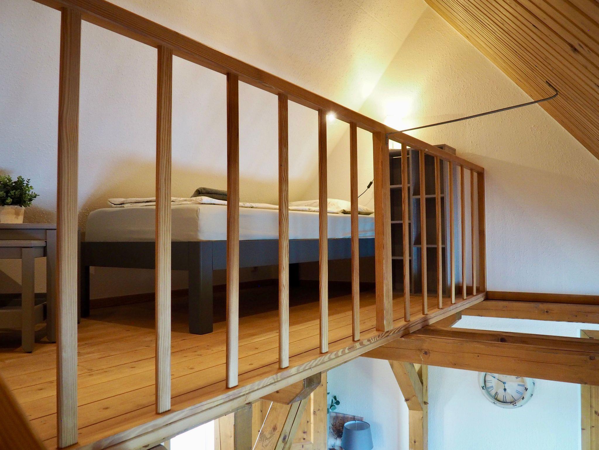 Ein behagliches Schlafzimmer mit komfortablem Doppelbett sorgt für erholsame Nächte. In der offenen Galerie im Dachgeschoss befinden sich zwei weitere Einzelbetten ein Lieblingsplatz besonders für Kinder oder junge Gäste.