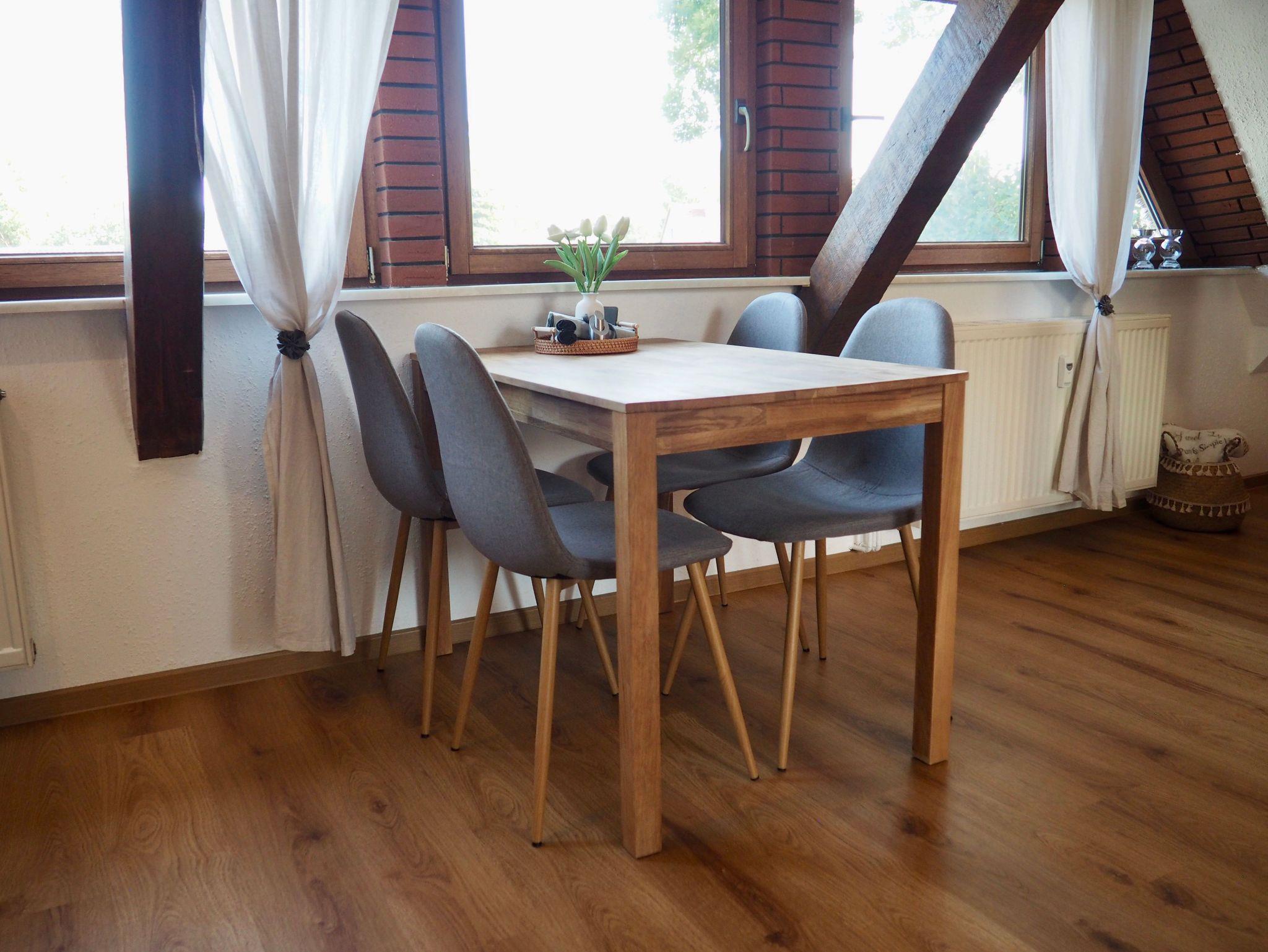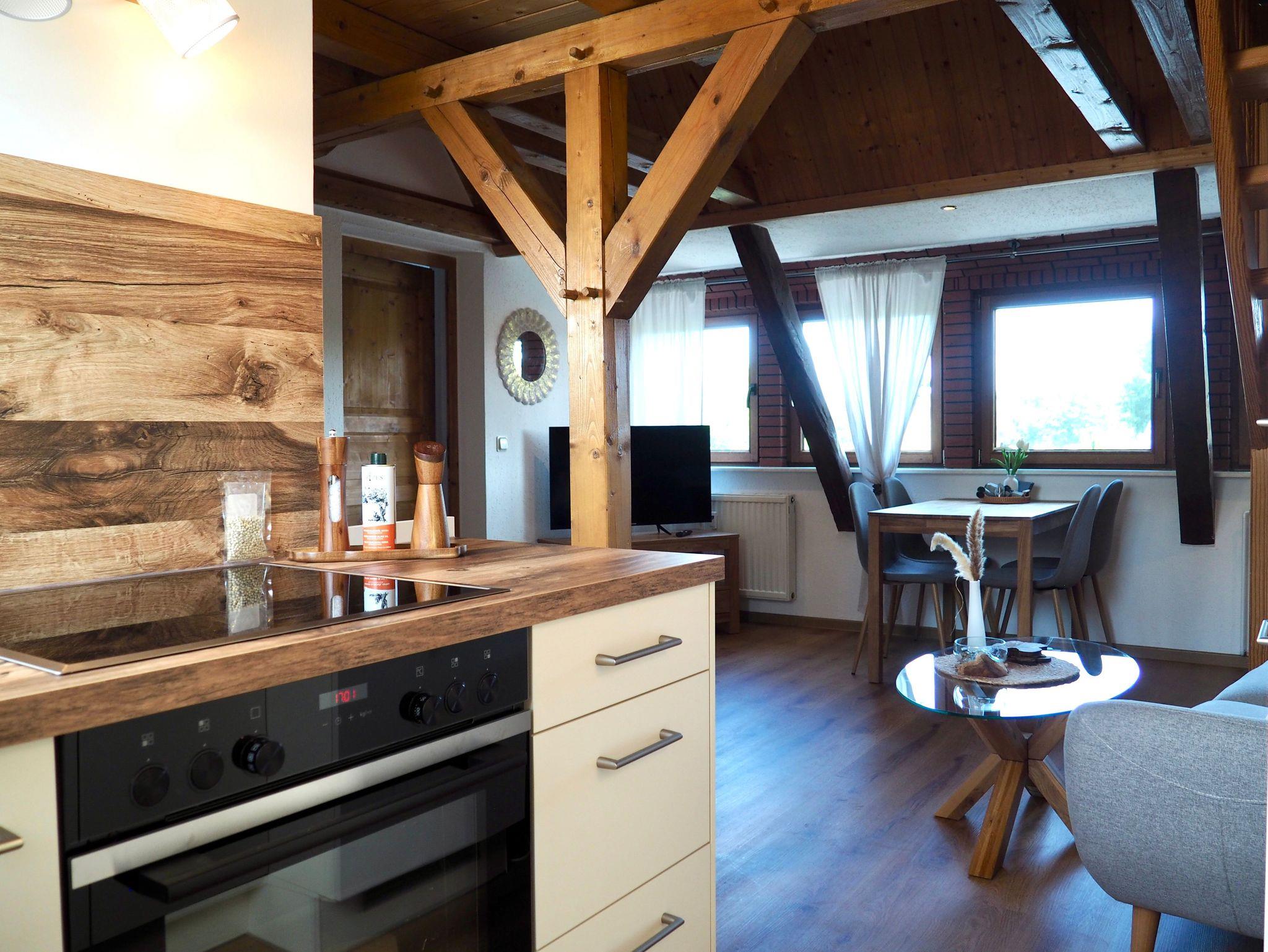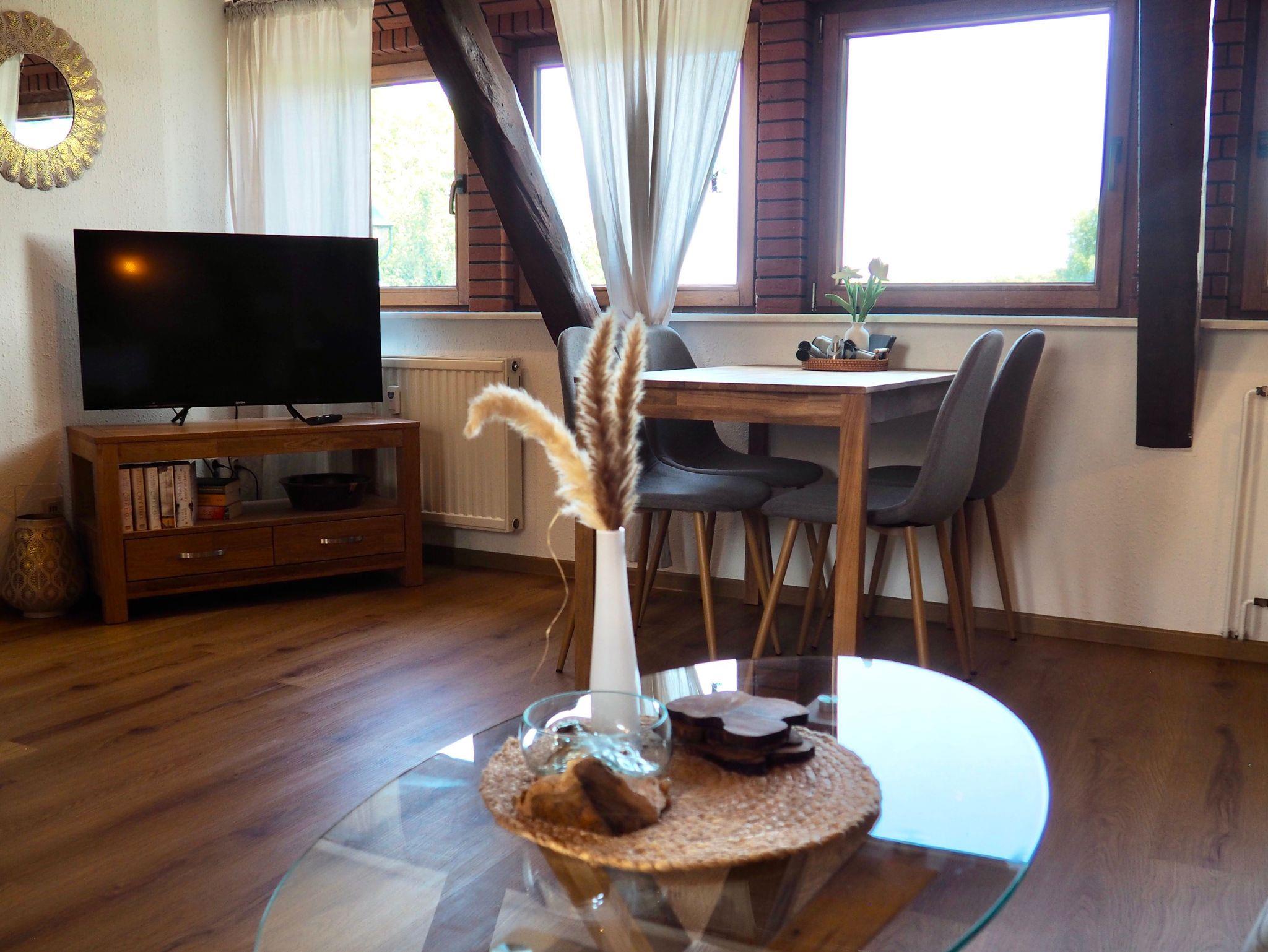 Freuen Sie sich auf ein gemütliches Wohnzimmer mit offener, gut ausgestatteter Küche und einem einladenden Essbereich für bis zu vier Personen ideal für gemeinsame Mahlzeiten und entspannte Abende.
