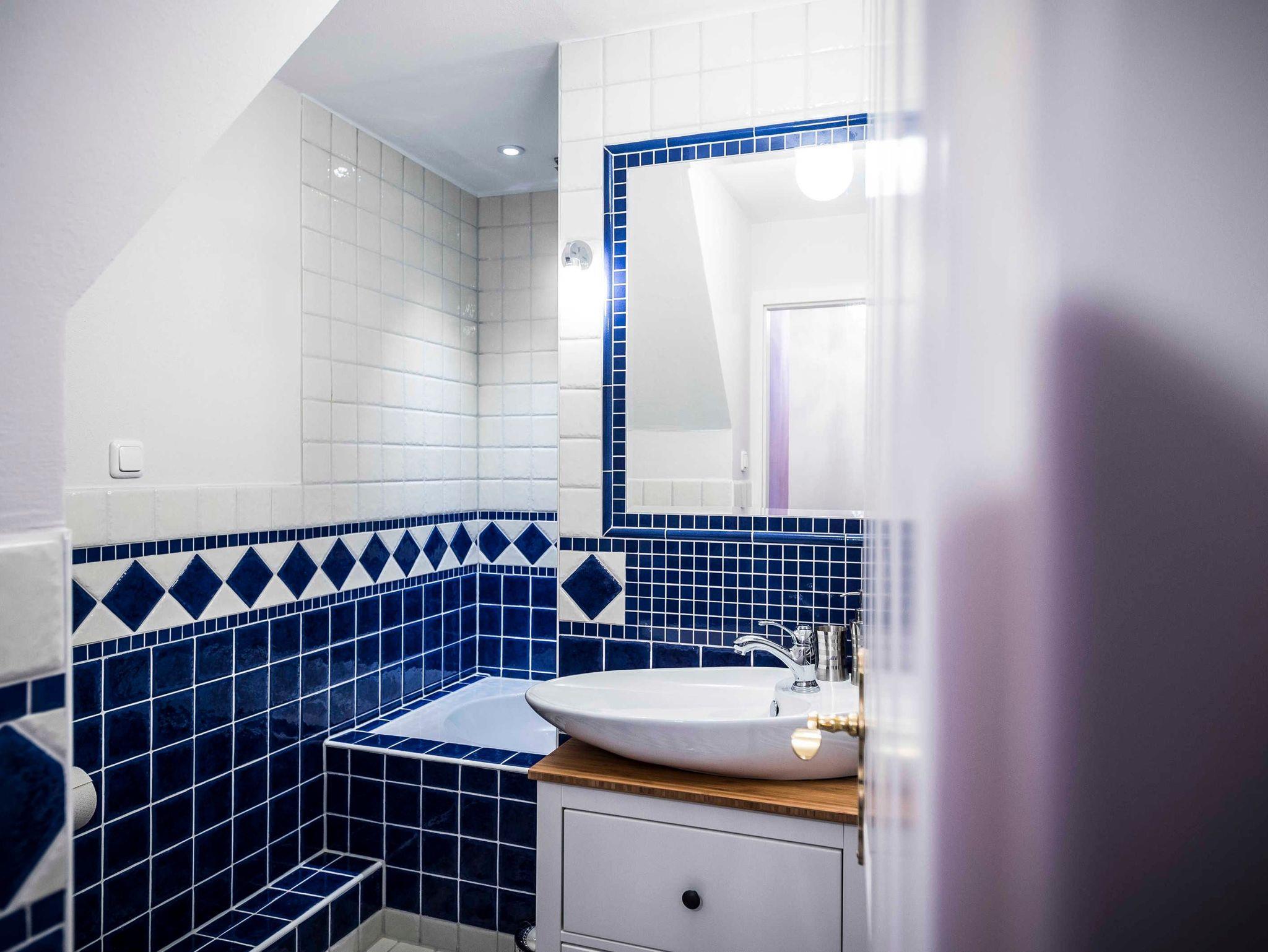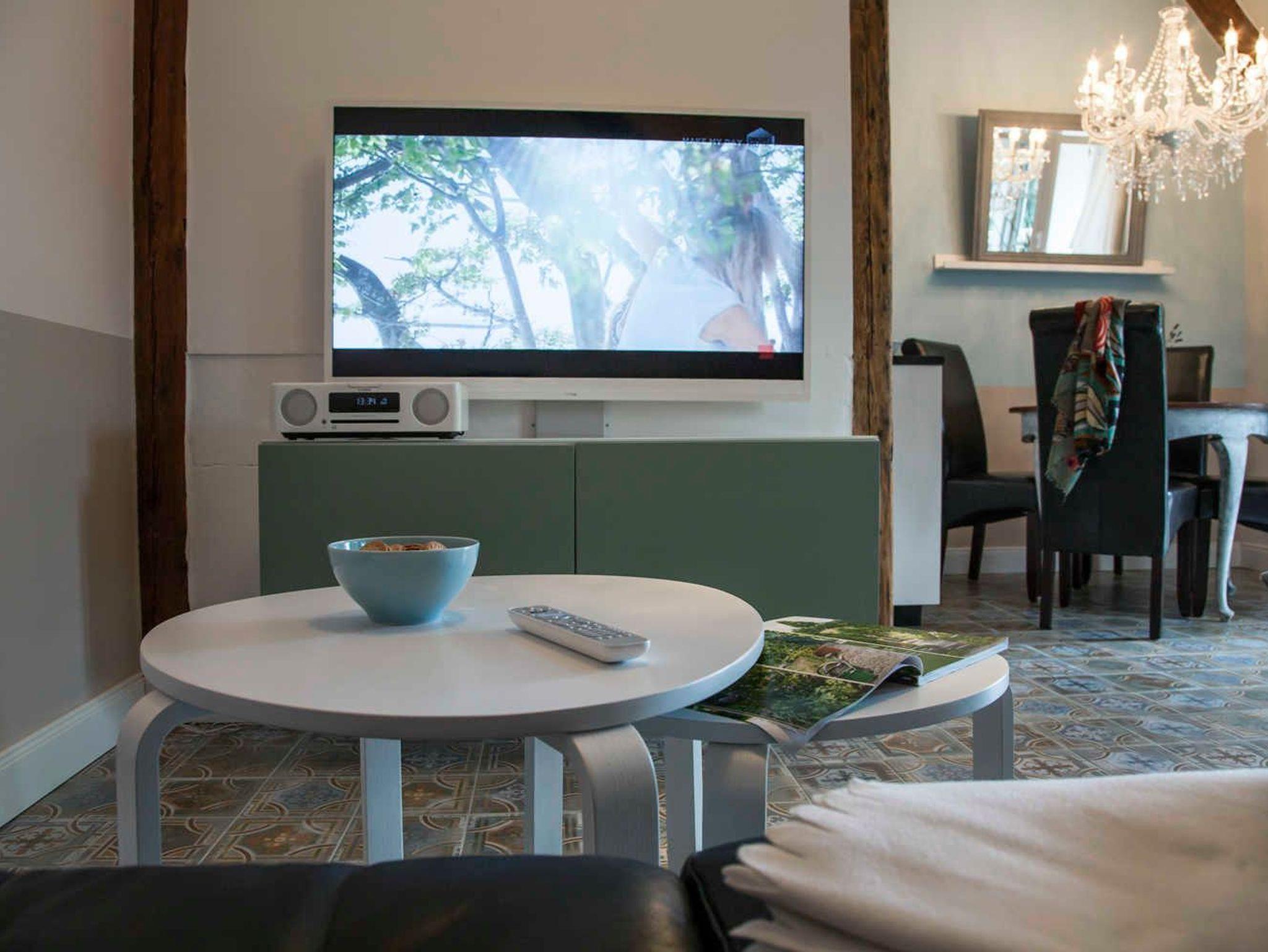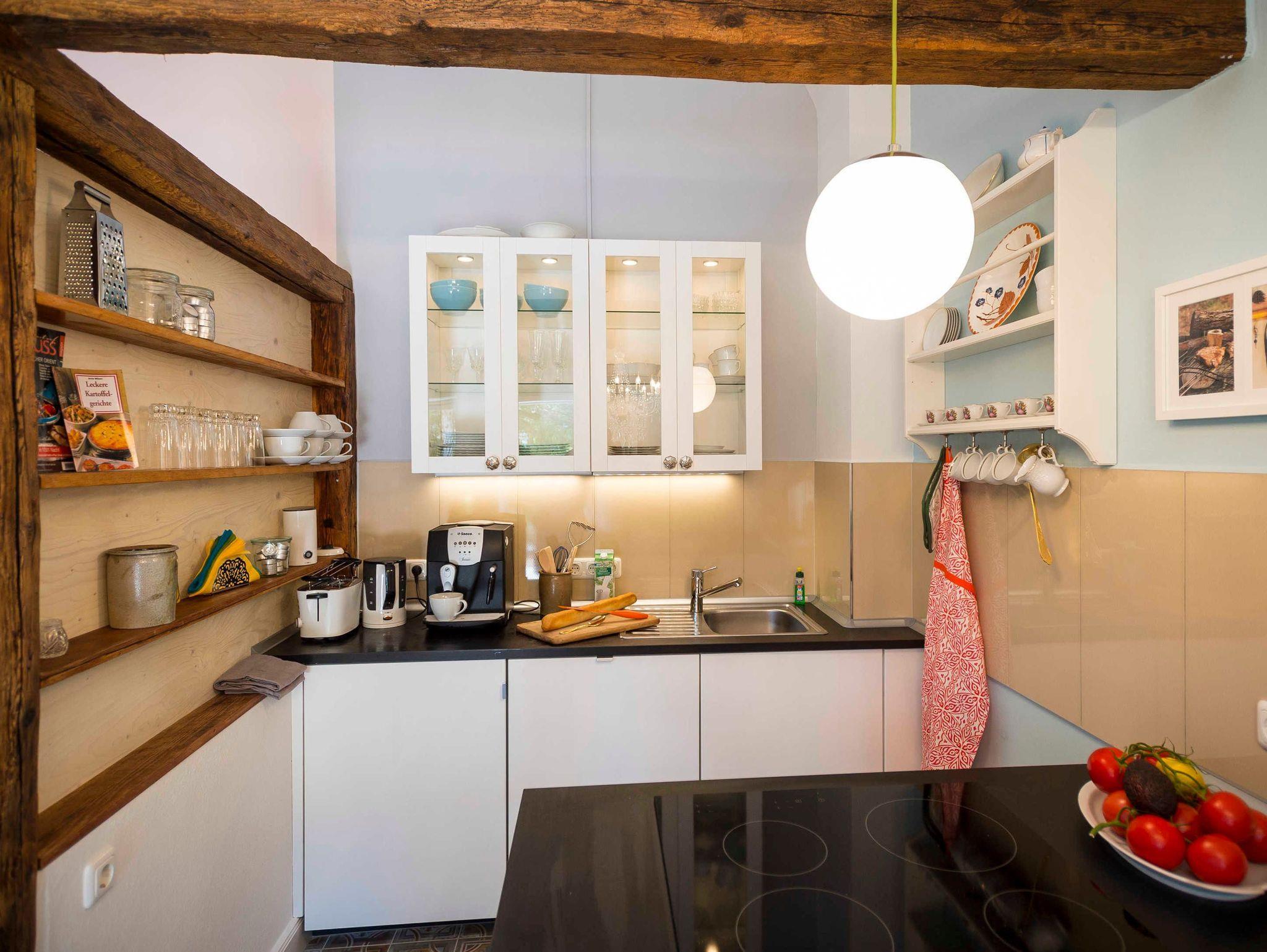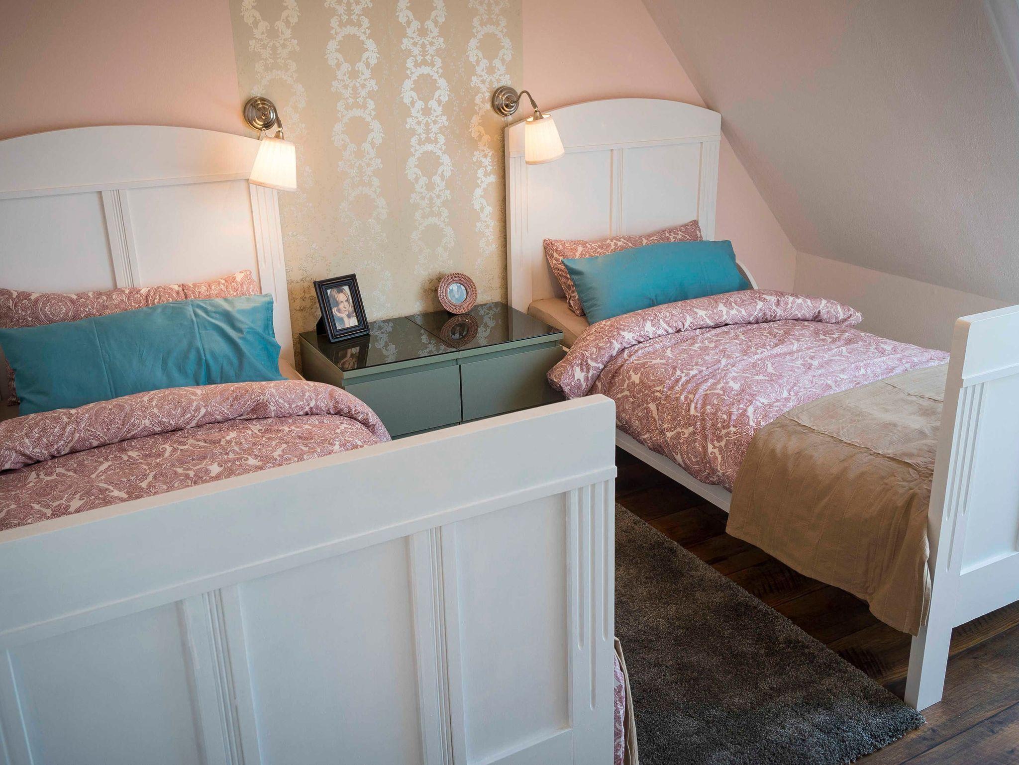Der Parkplatz der Wohnung liegt unmittelbar vor der 43 m² großen umzäunten Terrasse die mit Holzmöbeln und Kissen ausgestattet ist. Die ca. 75 m² große Wohnung erstreckt sich über 3 Etagen. Im Erdgeschoß der Wohnung befindet sich der Wohnraum mit Küche und Esstisch. Der Wohnraum hat einen abgetrennten Bereich für ein gemütliches Sofa mit Blick auf den 48 Flachbildfernseher. Eine Musikanlage mit CD-Player und USB-Anschluss sorgen für Unterhaltung und gemütliche Entspannung. Die Hochglanzeinbauküche ist zweizeilig mit Kochinsel. Kühlschrank inkl. Gefrierfach, Spüle und Geschirrspüler befinden sich auf einer Seite und darüber erstrahlt die beleuchtete Vitrine mit Geschirr und Gläsern. Der Herd mit Cerankochfeld und Tastbedienung, einem Backofen sowie zwei Unterschränke mit Schubladen bilden die Kochinsel. Der Essbereich grenzt an die Kochinsel. Über dem antiken Holztisch mit 4 bequemen Stühlen thront ein wunderschöner Kronleuchter mit 12 Leuchten, der stufenlos gedimmt werden kann. In die 1. Etage führt eine Holztreppe in einen kleinen Flur von dem das Bad und das erste Schlafzimmer erreicht werden. Das Badezimmer mit nostalgischen blau-weißen Fliesen ist ausgestattet mit einer Badewanne mit Regendusche, einem Waschtisch mit zwei Schubladen, einem großen Spiegel mit zwei zusätzlichen Leuchten und einem Handtuchheizkörper. Es liegt ein Föhn mit Diffuser bereit sowie pro Person ein Bade- und ein Handtuch. Das erste Schlafzimmer ist ausgestattet mit zwei antiken Einzelbetten. Jedes Bett hat einen Nachttisch mit einer Leselampe und davor einen flauschigen Teppich. Ein verspiegelter Kleiderschrank mit Innenbeleuchtung und eine Kommode mit 4 Schubladen bieten viel Stauraum. Eine zusätzliche Tischlampe mit gedimmten Licht und ein antikes Bild sorgen für eine nostalgische Atmosphäre. Durch eine Tür führt eine Holztreppe in die 2. Etage direkt in das 36 m² große und bis in die hohe Dachspitze offene zweite Schlafzimmer. Das Schlafzimmer ist ausgestattet mit einem XXL Boxspringbett mit einer traumhaft weichen Matratze. An jeder Seite stehen antike Nachttische mit einer Leselampe und davor liegen flauschige Lammfelle. Zwei hohe Kleiderschränke mit Innenbeleuchtung bieten viel Stauraum. Davor steht eine Kommode mit 4 Schubladen und einem antiken Flügelspiegel darüber. Ein antiker Sessel mit Beistelltisch und Leselampe laden zum gemütlichen Lesen ein. Direkt vom Bett aus fällt der Blick auf den 55 Flachbildfernseher und auf der Hochglanzanrichte mit beleuchteter Vitrine stehen antike Sektgläser bereit