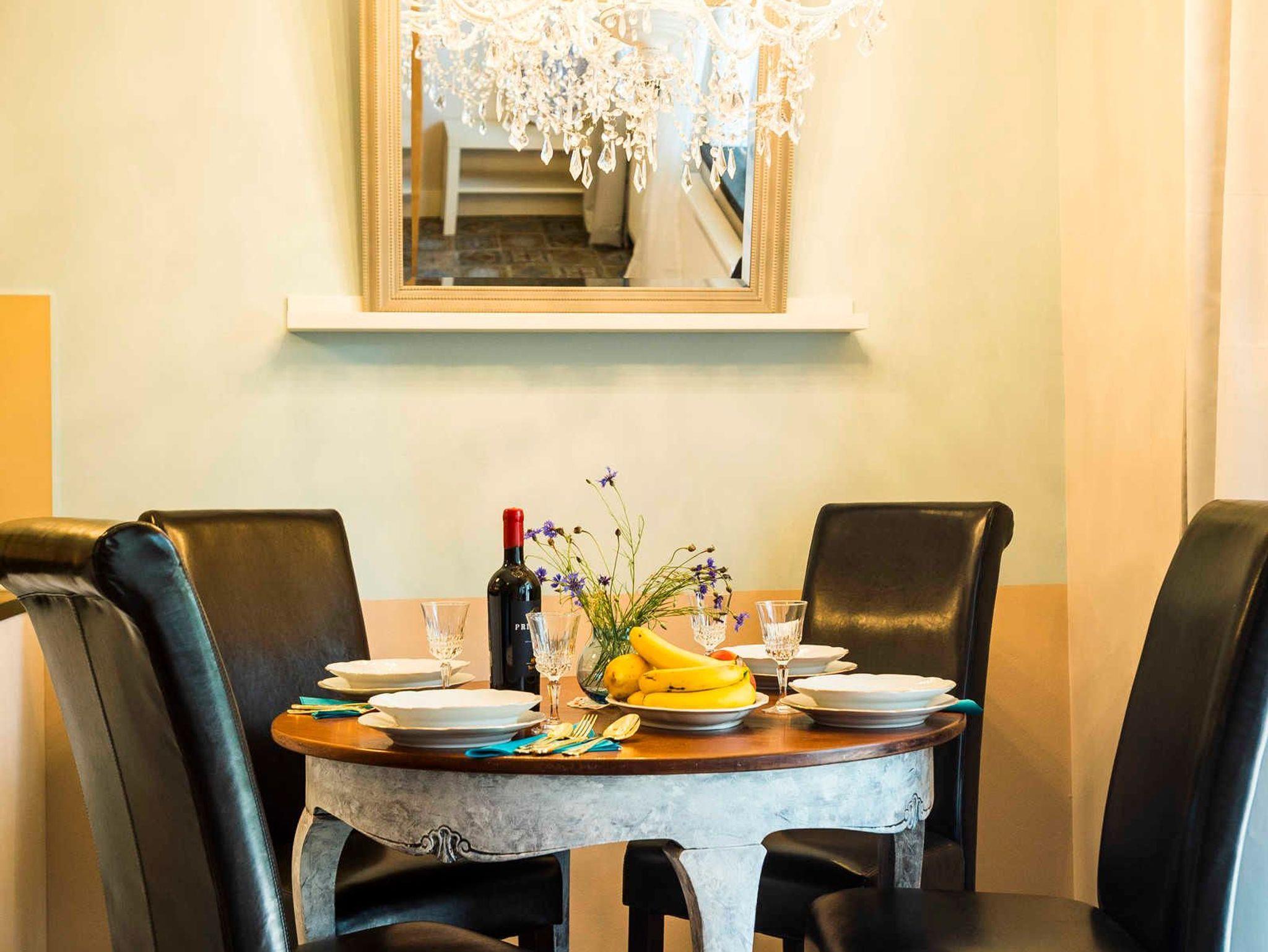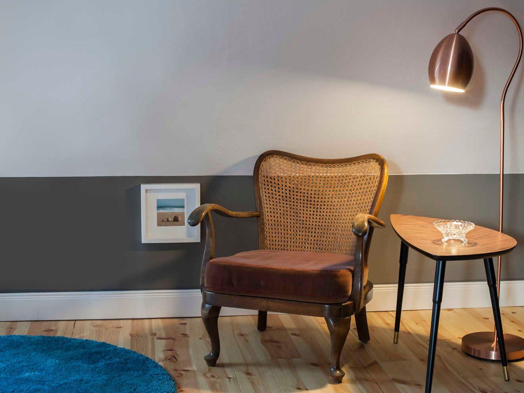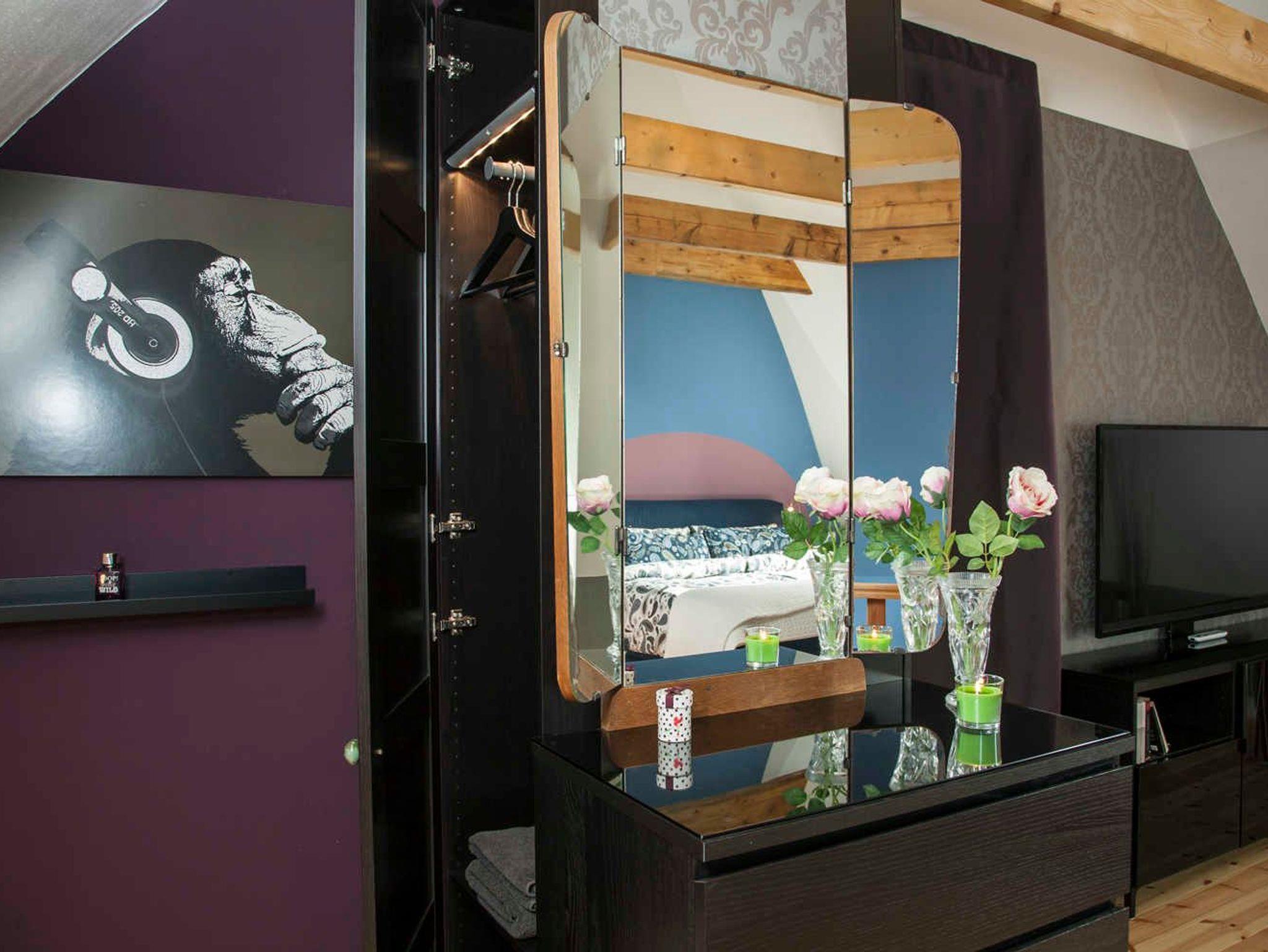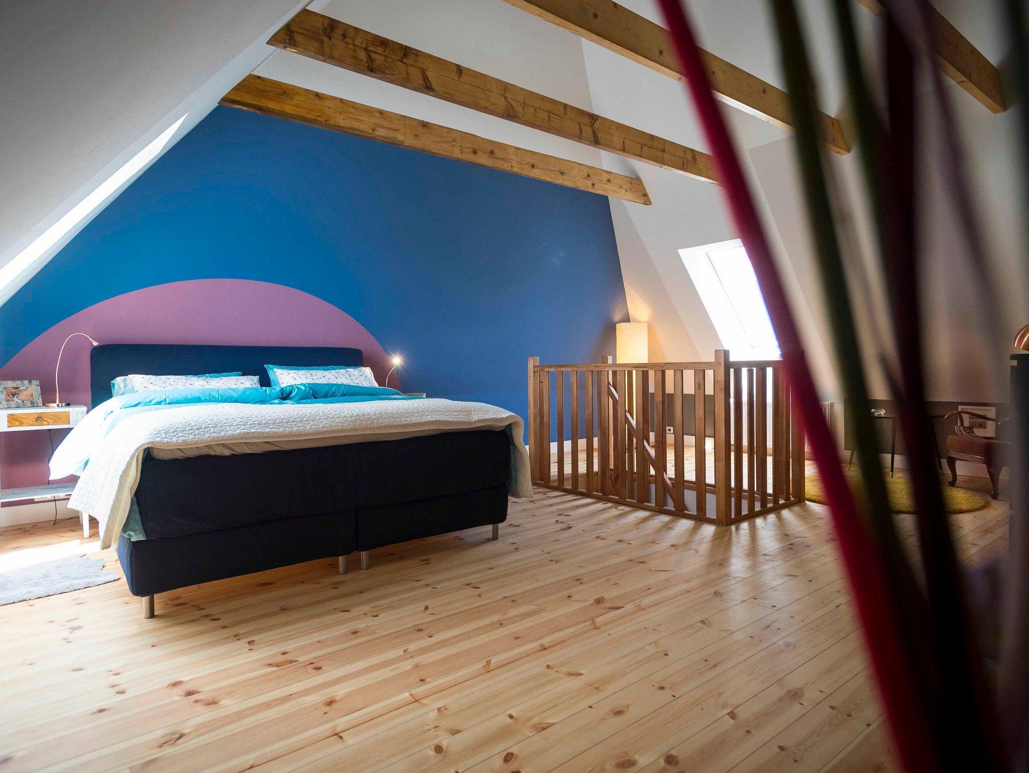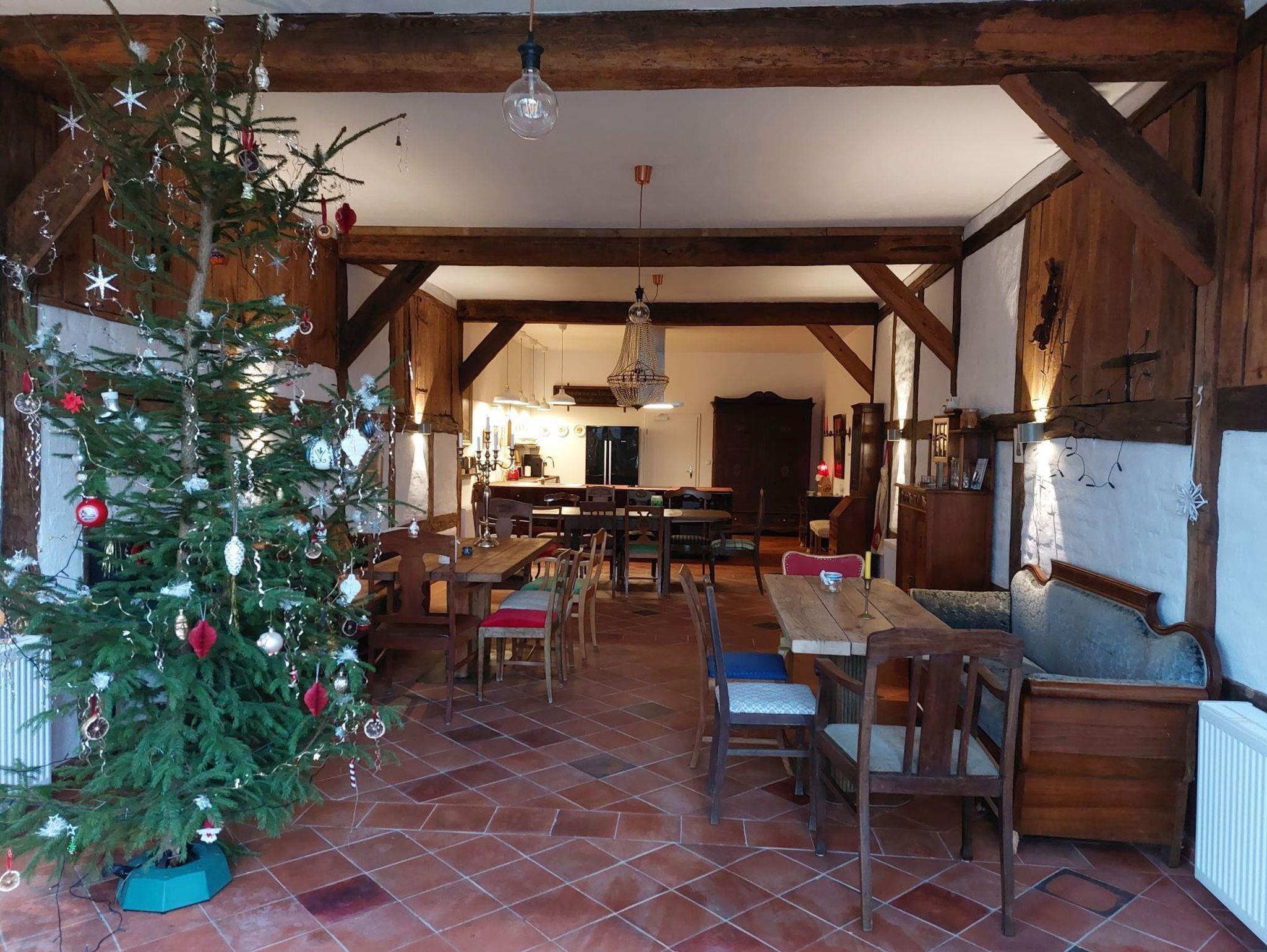Der Parkplatz der Wohnung liegt unmittelbar vor der 43 m² großen umzäunten Terrasse die mit Holzmöbeln und Kissen ausgestattet ist. Die ca. 75 m² große Wohnung erstreckt sich über 3 Etagen. Im Erdgeschoß der Wohnung befindet sich der Wohnraum mit Küche und Esstisch. Der Wohnraum hat einen abgetrennten Bereich für ein gemütliches Sofa mit Blick auf den 48 Flachbildfernseher. Eine Musikanlage mit CD-Player und USB-Anschluss sorgen für Unterhaltung und gemütliche Entspannung. Die Hochglanzeinbauküche ist zweizeilig mit Kochinsel. Kühlschrank inkl. Gefrierfach, Spüle und Geschirrspüler befinden sich auf einer Seite und darüber erstrahlt die beleuchtete Vitrine mit Geschirr und Gläsern. Der Herd mit Cerankochfeld und Tastbedienung, einem Backofen sowie zwei Unterschränke mit Schubladen bilden die Kochinsel. Der Essbereich grenzt an die Kochinsel. Über dem antiken Holztisch mit 4 bequemen Stühlen thront ein wunderschöner Kronleuchter mit 12 Leuchten, der stufenlos gedimmt werden kann. In die 1. Etage führt eine Holztreppe in einen kleinen Flur von dem das Bad und das erste Schlafzimmer erreicht werden. Das Badezimmer mit nostalgischen blau-weißen Fliesen ist ausgestattet mit einer Badewanne mit Regendusche, einem Waschtisch mit zwei Schubladen, einem großen Spiegel mit zwei zusätzlichen Leuchten und einem Handtuchheizkörper. Es liegt ein Föhn mit Diffuser bereit sowie pro Person ein Bade- und ein Handtuch. Das erste Schlafzimmer ist ausgestattet mit zwei antiken Einzelbetten. Jedes Bett hat einen Nachttisch mit einer Leselampe und davor einen flauschigen Teppich. Ein verspiegelter Kleiderschrank mit Innenbeleuchtung und eine Kommode mit 4 Schubladen bieten viel Stauraum. Eine zusätzliche Tischlampe mit gedimmten Licht und ein antikes Bild sorgen für eine nostalgische Atmosphäre. Durch eine Tür führt eine Holztreppe in die 2. Etage direkt in das 36 m² große und bis in die hohe Dachspitze offene zweite Schlafzimmer. Das Schlafzimmer ist ausgestattet mit einem XXL Boxspringbett mit einer traumhaft weichen Matratze. An jeder Seite stehen antike Nachttische mit einer Leselampe und davor liegen flauschige Lammfelle. Zwei hohe Kleiderschränke mit Innenbeleuchtung bieten viel Stauraum. Davor steht eine Kommode mit 4 Schubladen und einem antiken Flügelspiegel darüber. Ein antiker Sessel mit Beistelltisch und Leselampe laden zum gemütlichen Lesen ein. Direkt vom Bett aus fällt der Blick auf den 55 Flachbildfernseher und auf der Hochglanzanrichte mit beleuchteter Vitrine stehen antike Sektgläser bereit
