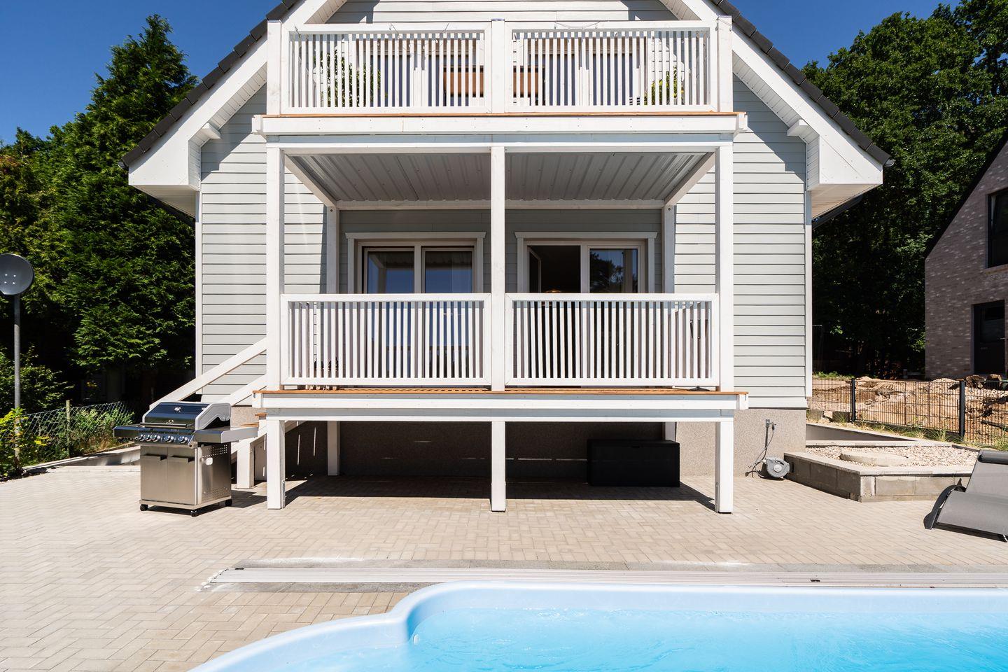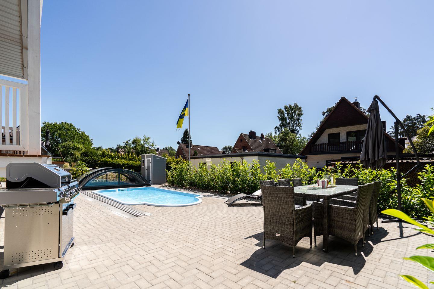 Der Außenbereich bietet besondere Highlights für einen erholsamen Urlaub: Vom Balkon aus blicken Sie auf die Terrasse mit dem beheizten Salzwasser-Pool (23°C von Mai - September), der auf einem abgeschlossenen, kinder- und hundesicheren Grundstück liegt. Die Poolüberdachung kann man nach Bedarf auf- oder zuschieben, so dass sich auch kleine Kinder problemlos unbeaufsichtigt auf dem Grundstück bewegen können. Und selbst bei kühlen Außentemperaturen kann man den Pool wie ein Hallenbad nutzen. Im Untergeschoss befindet sich zudem eine Sauna für 2 Personen. Für gemeinsame Stunden im Freien stehen Gartenmöbel, Sonnenliegen, Sonnenschirm und ein großer Gasgrill zur Verfügung. Der beheizte Outdoor-Pool zur Eigennutzung lädt zum Schwimmen und Entspannen ein – ein exklusives Extra, das das Urlaubsgefühl abrundet.
