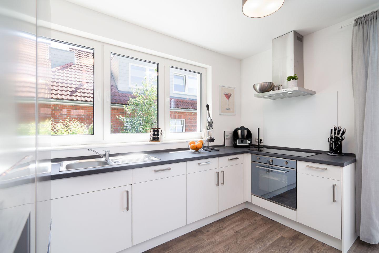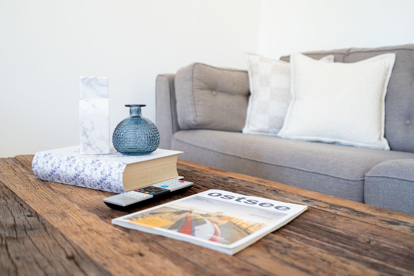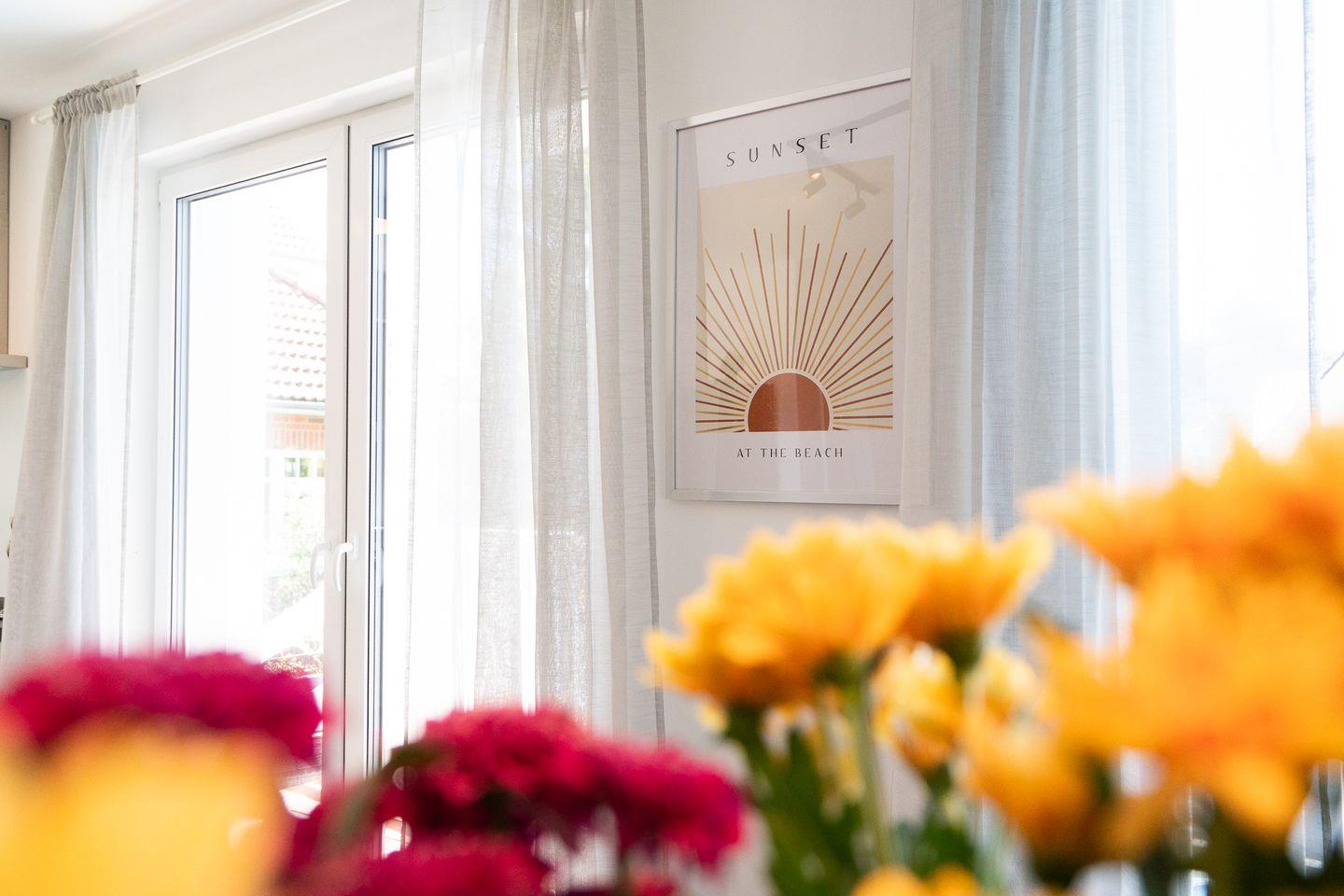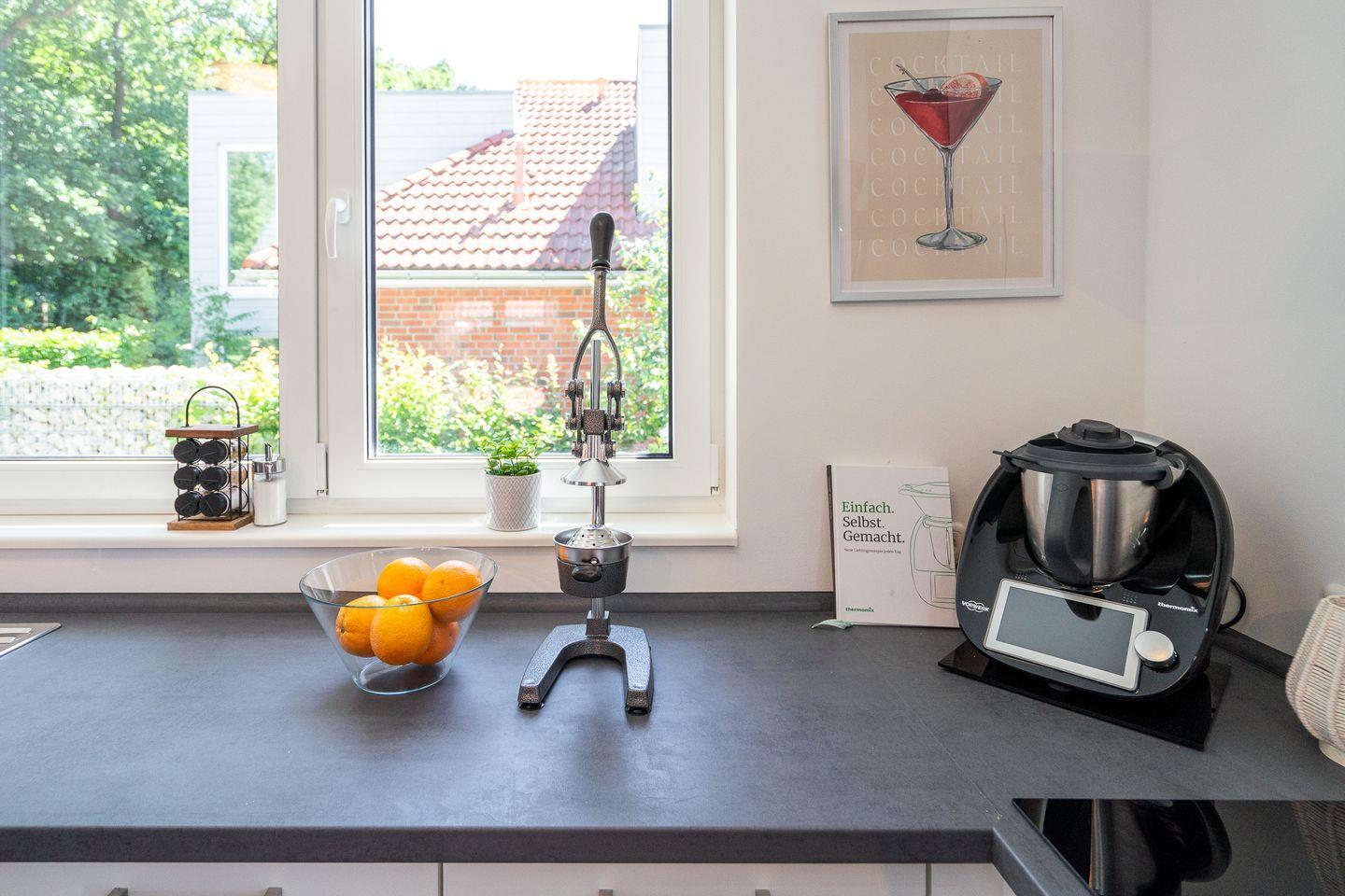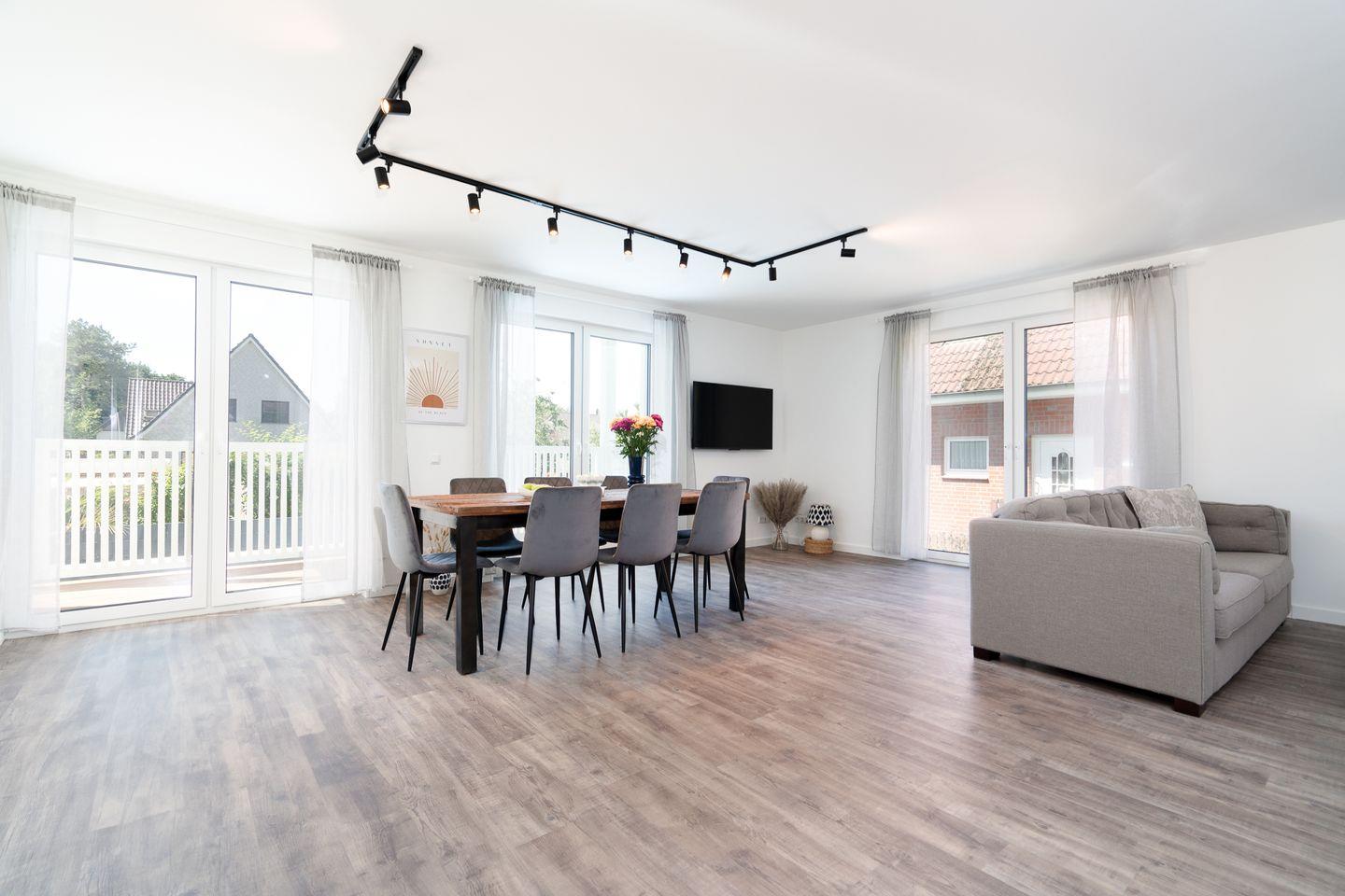 Das Ferienobjekt ist perfekt auf die Bedürfnisse von Familien und Gruppen zugeschnitten. Vier separate Schlafzimmer bieten ausreichend Platz und Rückzugmöglichkeiten. Drei Schlafzimmer sind mit Doppelbetten ausgestattet (jeweils 2x 90 cm x 200 cm), ein Schlafzimmer hat ein Etagenbett. Die zwei Badezimmer sind jeweils mit Dusche, Waschbecken, Kosmetikspiegel, WC und Fenstern ausgestattet, eine Waschmaschine steht ebenfalls zur Verfügung. Die Betten sind bei Ihrer Ankunft frisch bezogen, Handtücher in ausreichender Menge vorhanden. Die offene Küche grenzt direkt an den großzügigen Ess- und Wohnbereich und neben einer exklusiv ausgestatteten Küche mit Backofen, Herd, Heißluftfritteuse, Kühlschrank mit Eiswürfelspender, Gefrierschrank, Spülmaschine, Kaffeemaschine, Wasserkocher und Toaster, ist der neue Thermomix ein besonderes Highlight, mit dem Sie kurzerhand und ganz unkompliziert leckere Mahlzeiten zaubern können. Für die morgendliche Dosis Vitamine sorgt die elektrische Saftpresse. Am Esstisch können alle Gäste zusammenkommen, während in der Sofaecke mit bequemen Sesseln und Sofa Entspannung garantiert ist.