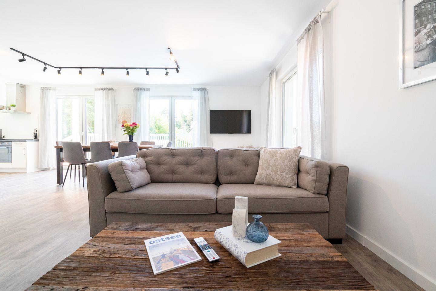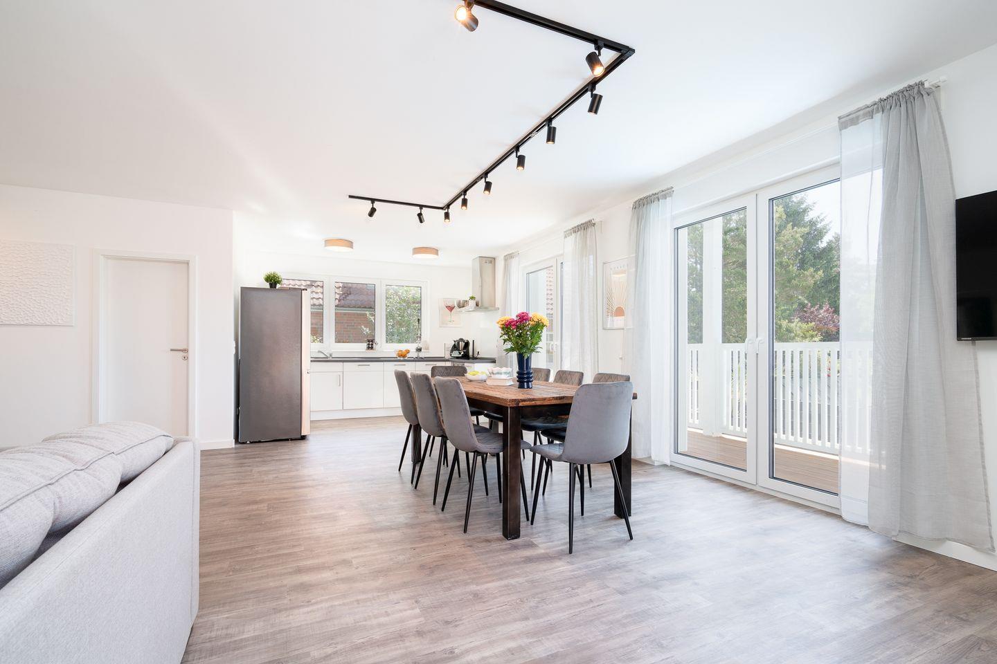 Die moderne Ferienwohnung Nele in Ratekau bietet Platz für bis zu acht Gäste in vier Schlafzimmern. Ausgestattet mit offenem Wohn- und Essbereich, zwei Bädern, Balkon, Terrasse sowie beheiztem Außenpool und Sauna eignet sich das Nichtraucherhaus ideal für Familien. Ein großes, eingezäuntes Grundstück, kostenfreie Parkplätze und WLAN sorgen für Komfort.