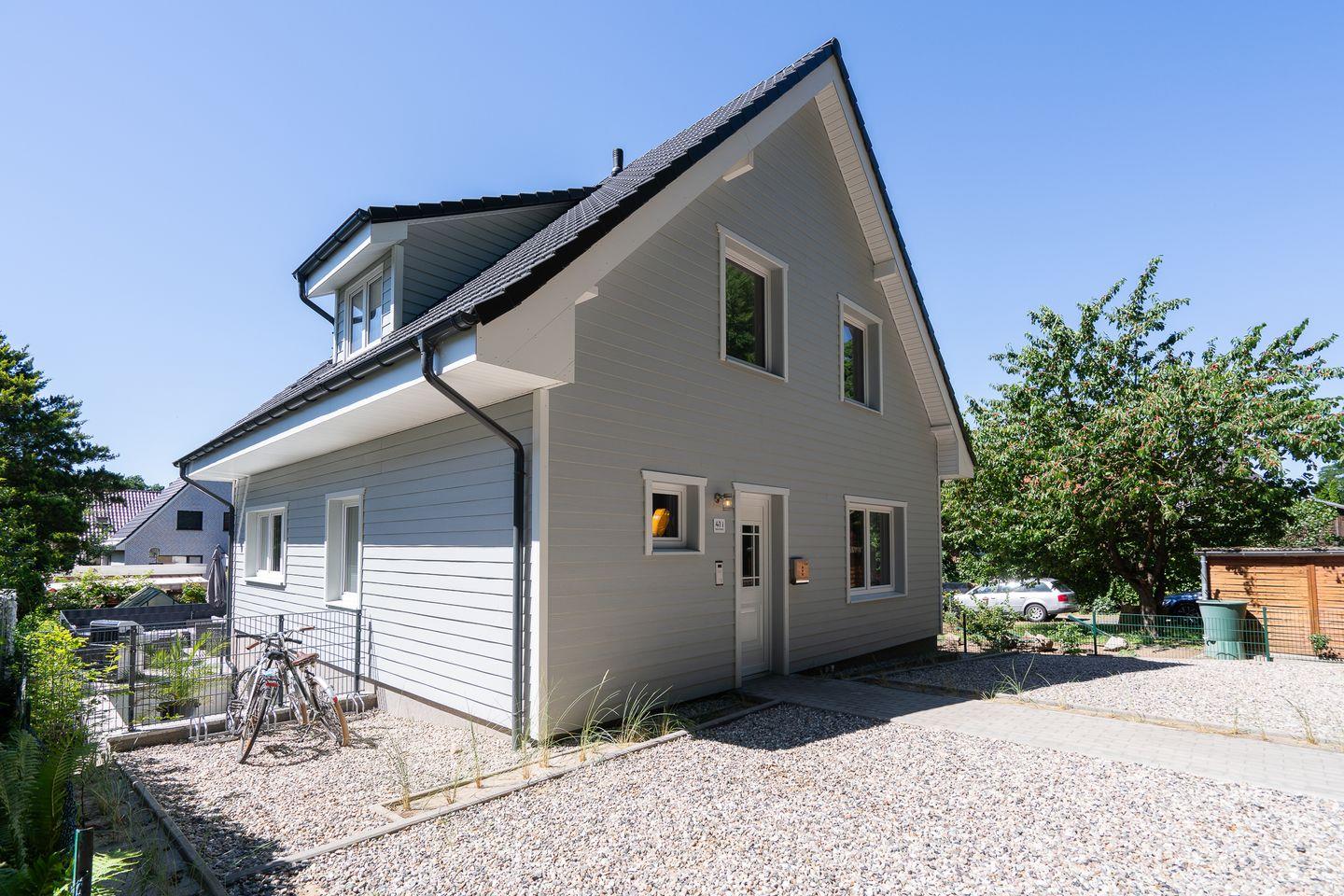 Das Ferienhaus "Nele" befindet sich im Umland von Ratekau in Ostseenähe und bietet auf einem abgeschlossenen Grundstück eine moderne und komfortable Unterkunft für bis zu 8 Personen. Das Haus wurde im Jahr 2025 erbaut und erfüllt höchste Ansprüche an Ausstattung, Funktionalität und Wohlfühlambiente. Die ruhige, ländliche Umgebung mit direkter Nähe zum Wald lädt zu ausgedehnten Spaziergängen, Wanderungen und Radtouren ein. Auch Aktivitäten wie Angeln, Golfen, Mountainbiking, Joggen sowie verschiedene Wassersportarten sind problemlos möglich. Der nächstgelegene See ist lediglich 600 Meter entfernt. Der schöne Sandstrand der Lübecker Bucht befindet sich etwa 10 bis 11 Kilometer entfernt und ist schnell mit dem Auto oder Fahrrad zu erreichen. Einkaufsmöglichkeiten, Restaurants, ein Supermarkt sowie medizinische Versorgung sind in einem Radius von wenigen Kilometern vorhanden.