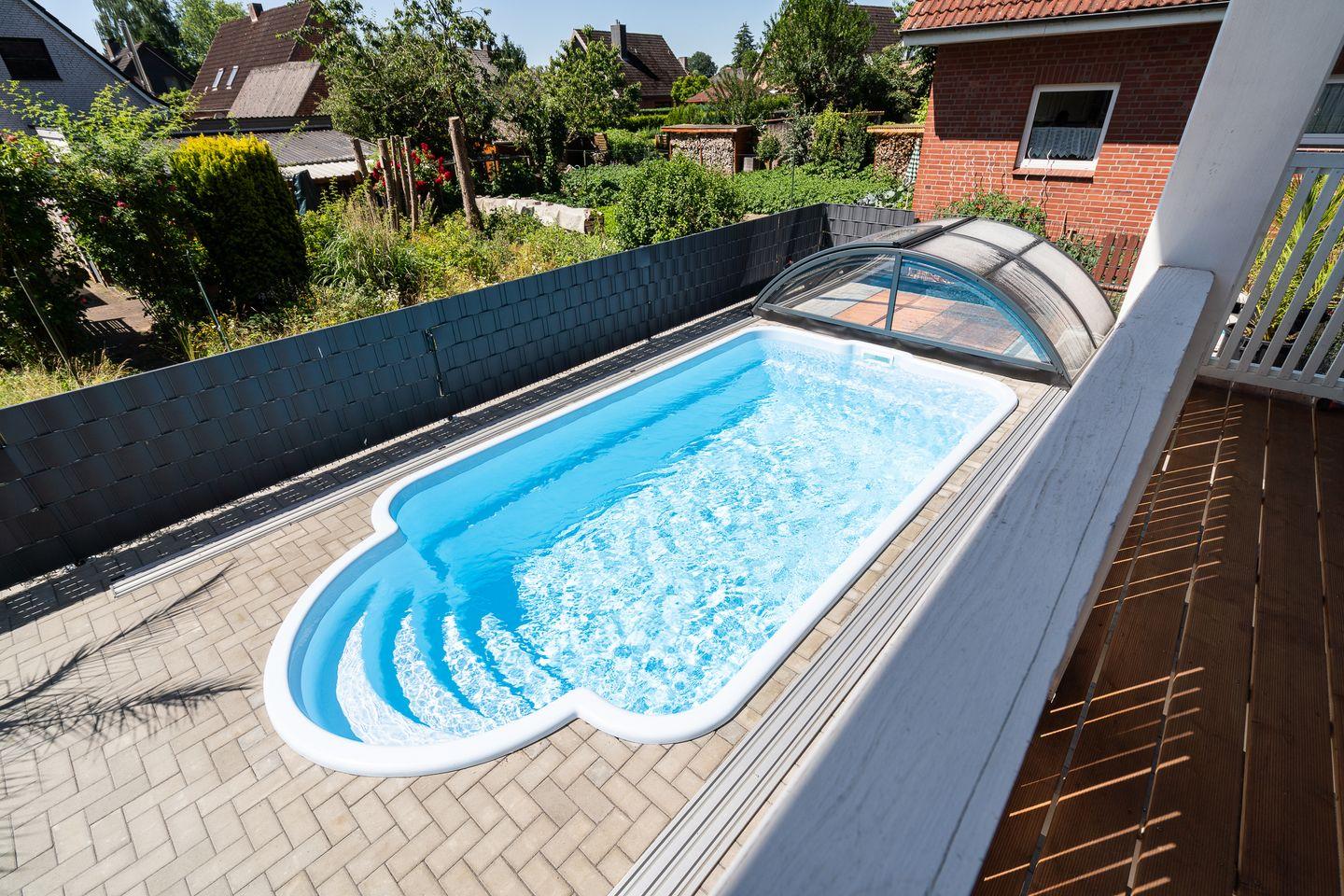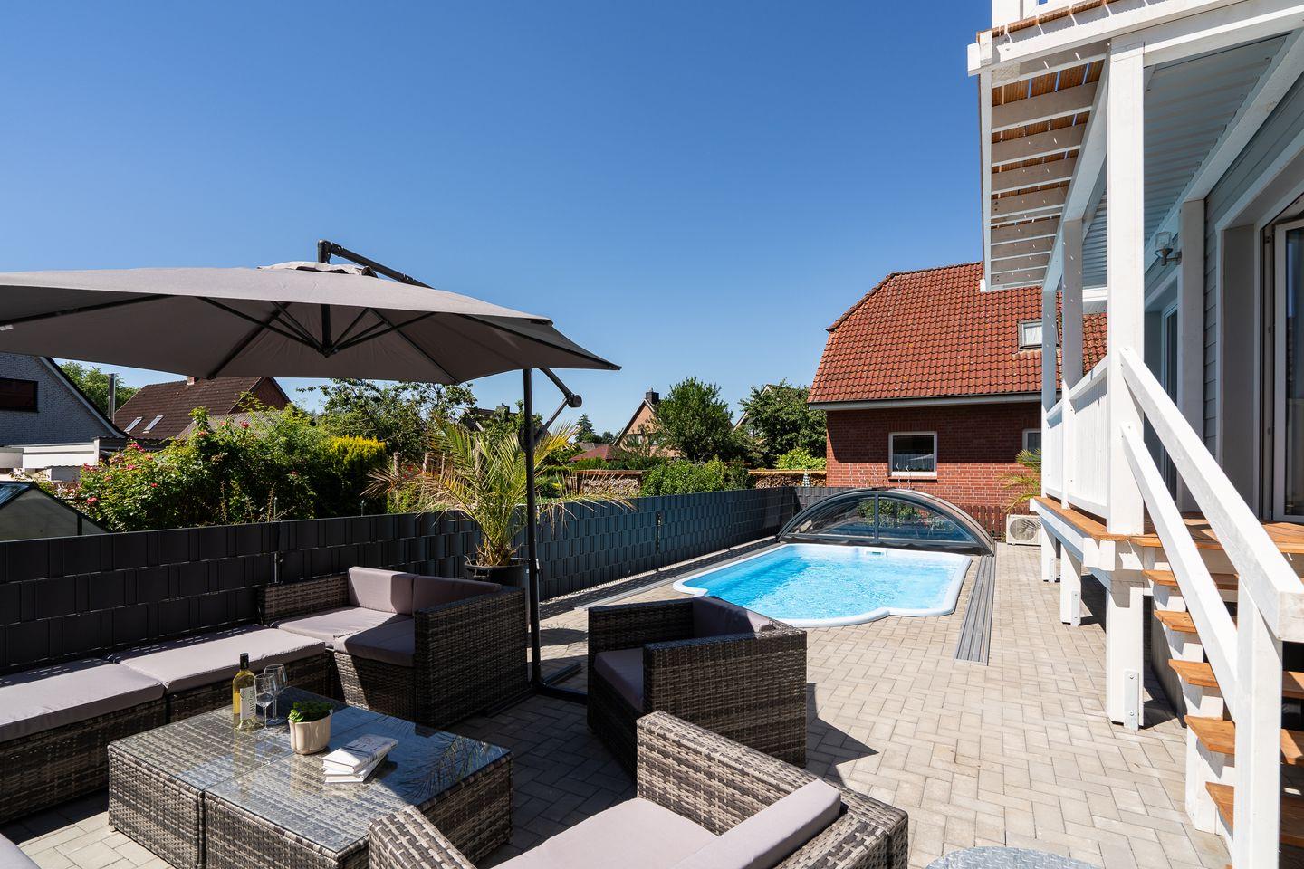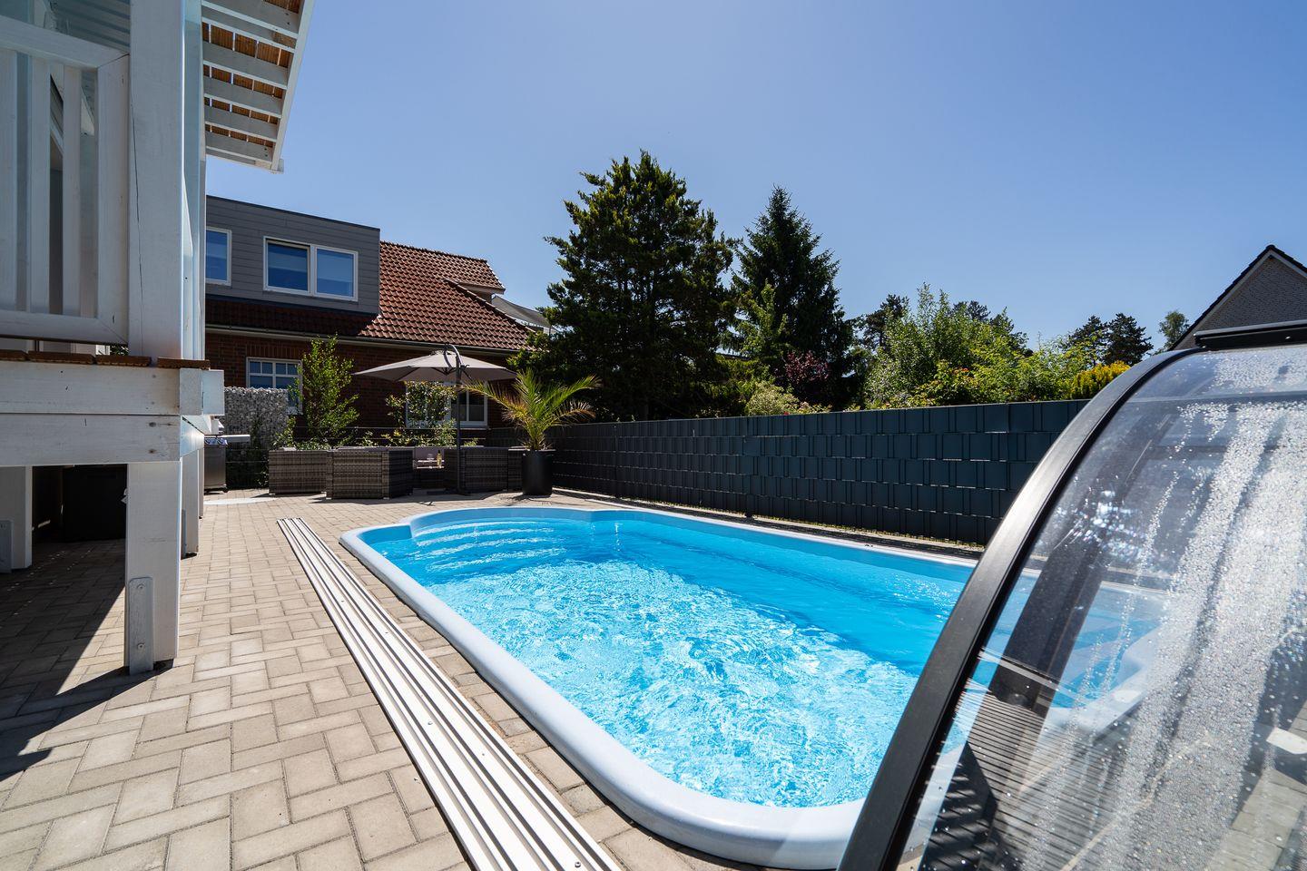 Ein besonderes Highlight ist der beheizte, zur Eigennutzung verfügbare, Outdoor-Salzwasser-Pool (24°C von Ostern - Oktober), der gemeinsam mit Sonnenliegen, Sonnenschirmen und Gartenmöbeln den Aufenthalt im Freien zu einem besonderen Erlebnis werden lässt. Die Poolüberdachung kann man nach Bedarf auf- oder zuschieben, so dass sich auch kleine Kinder problemlos unbeaufsichtigt auf dem Grundstück bewegen können. Und selbst bei kühlen Außentemperaturen kann man den Pool wie ein Hallenbad nutzen. Im Untergeschoss befindet sich zudem eine Infrarotsauna für 2 Personen. Für gesellige Grillabende steht ein moderner Gasgrill bereit. Das eingezäunte, kinder- sowie hundesichere Grundstück bietet Familien mit Kindern oder Haustieren maximale Sicherheit. Bis zu zwei Haustiere sind willkommen.