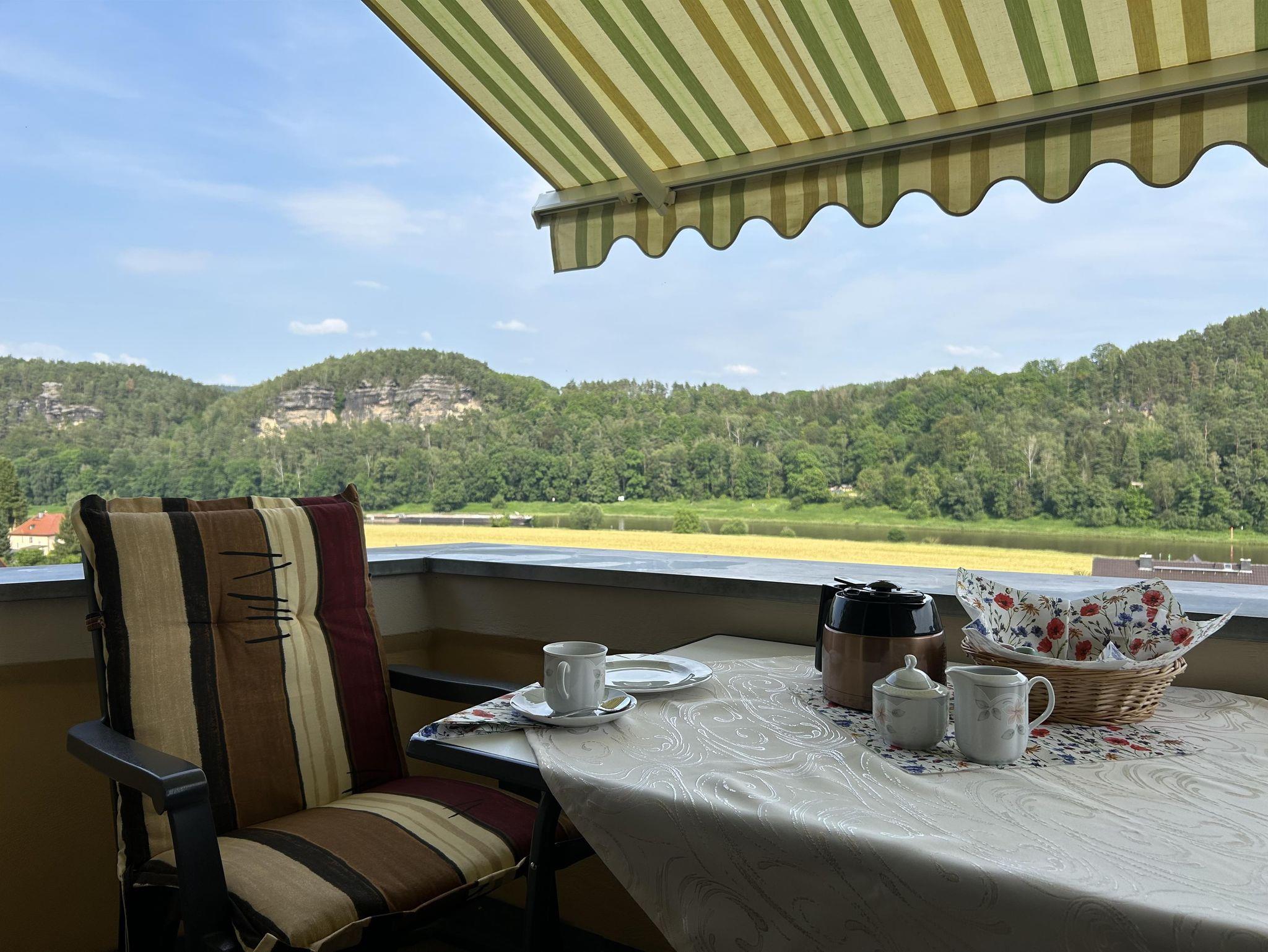 Der Balkon mit Gartenmöbel bietet einen wunderbaren Ausblick auf die Elbe und den Lilienstein.