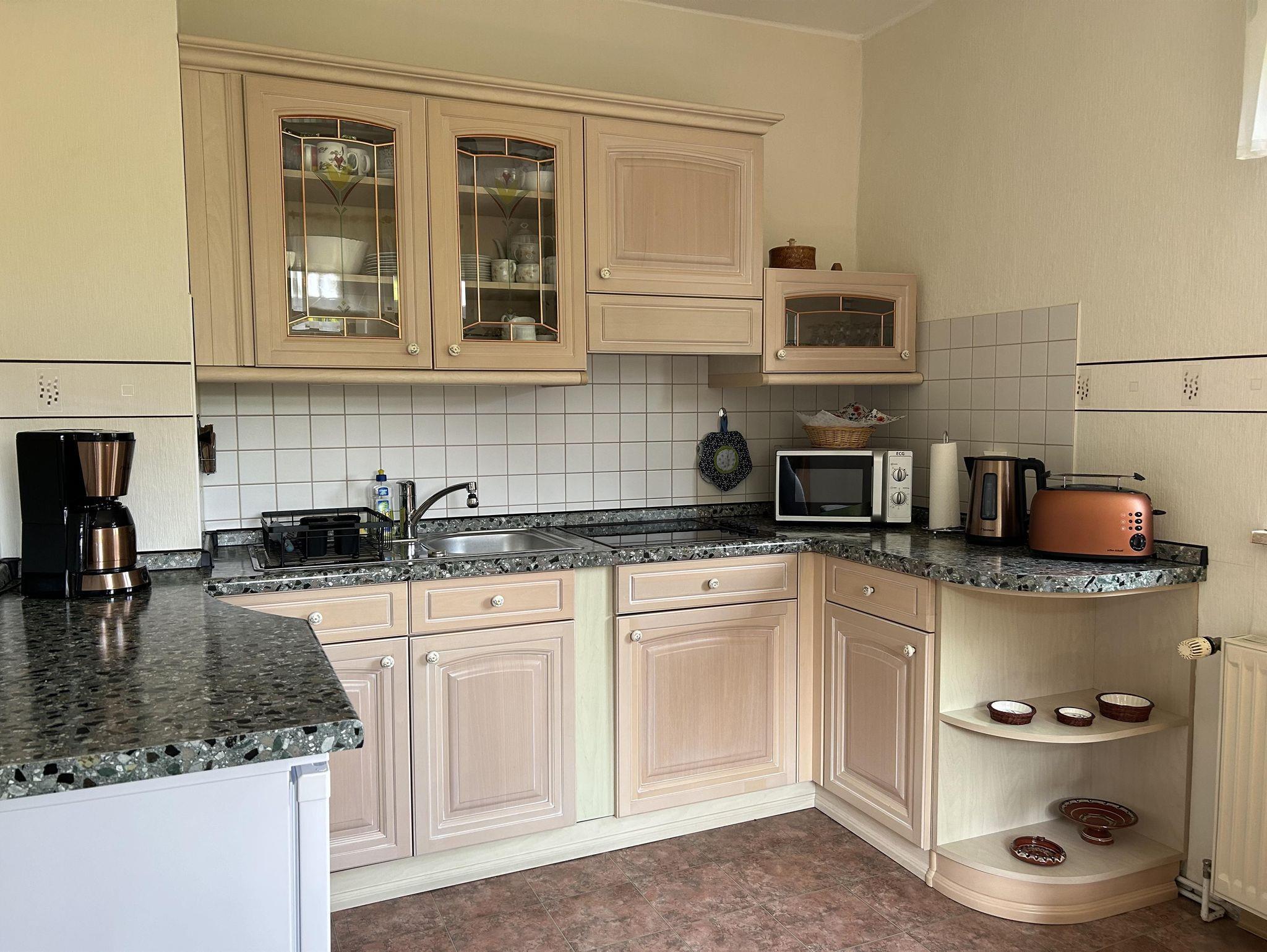 Die Ferienwohnung liegt in der 1. Etage und verfügt über einen separaten Schlafraum mit Doppelbett, einen Wohnraum, Küche sowie ein Bademzimmer mit ebenerdiger Dusche und WC. Der Wohnraum ist mit einer gemütlichen Couch, auf der zwei weitere Schlafmöglichkeiten bestehen und TV eingerichtet. Die separate Küche ist mit einer Essecke für 4 Personen und einer Küchenzeile mit Cerankochfeld, Kühlschrank, Kaffeemaschine, Wasserkocher und Mikrowelle ausgestattet.