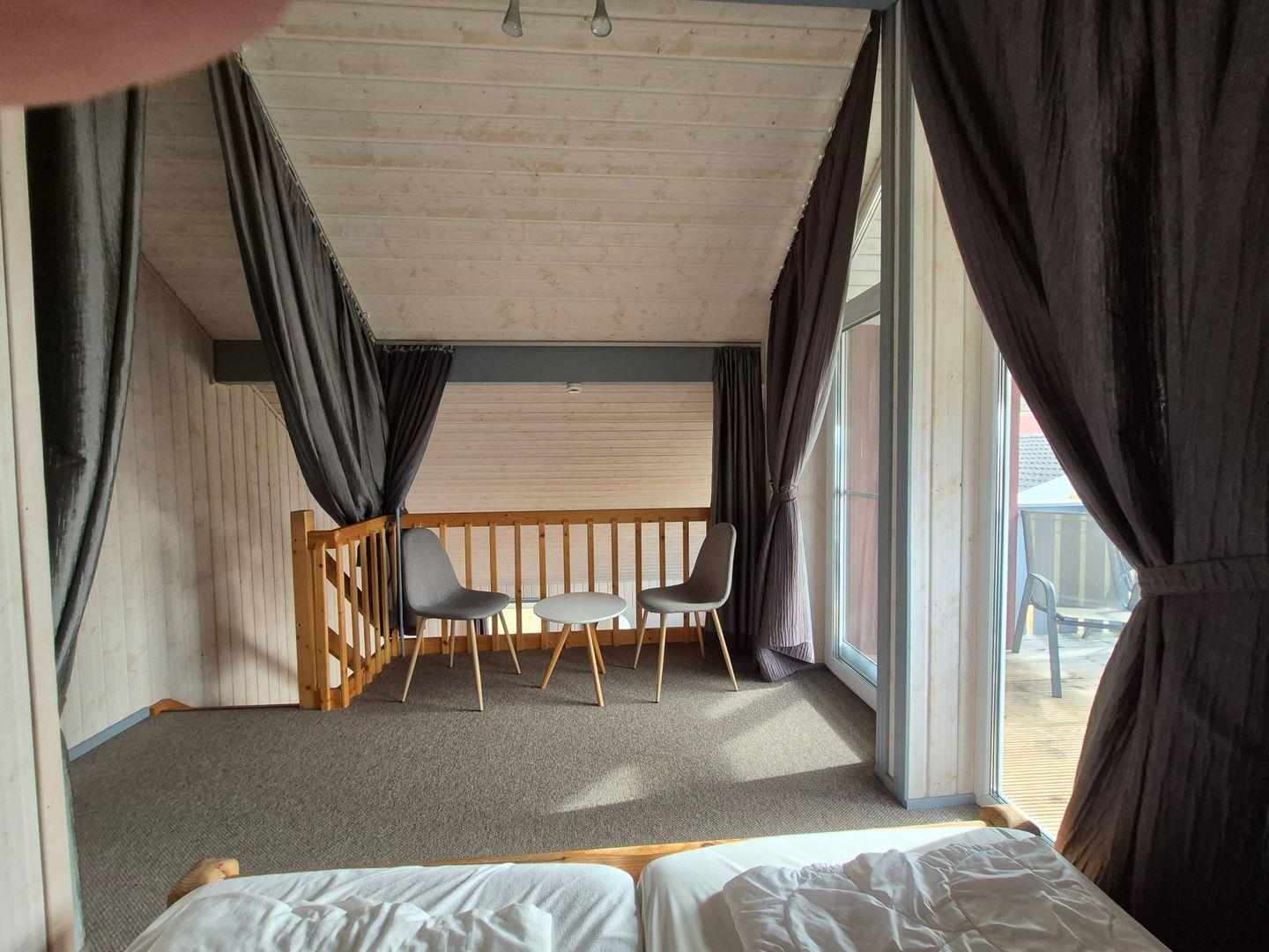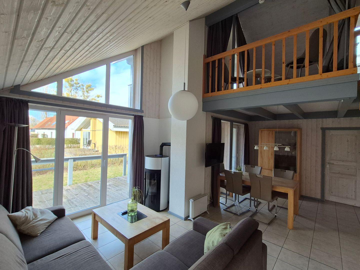 Das Ferienhaus im skandinavischen Stil bietet Platz für bis zu 6 Personen auf 2 Etagen mit 2 Schlafzimmern und offener Schlafgalerie, Wohn-/Essbereich, Einbauküche, Badezimmer mit Sauna und Whirlpool, Pkw-Stellplatz und Terrasse.