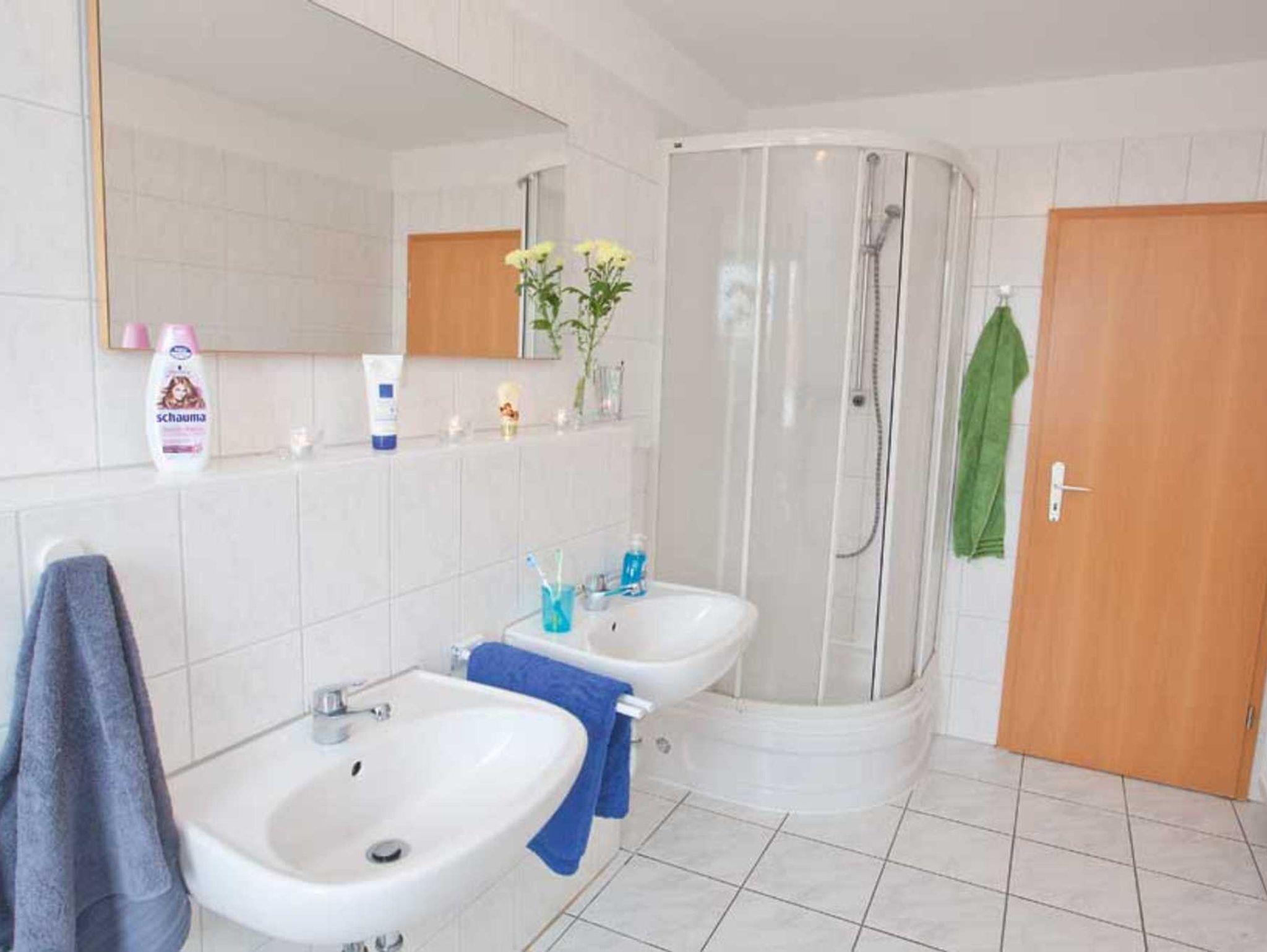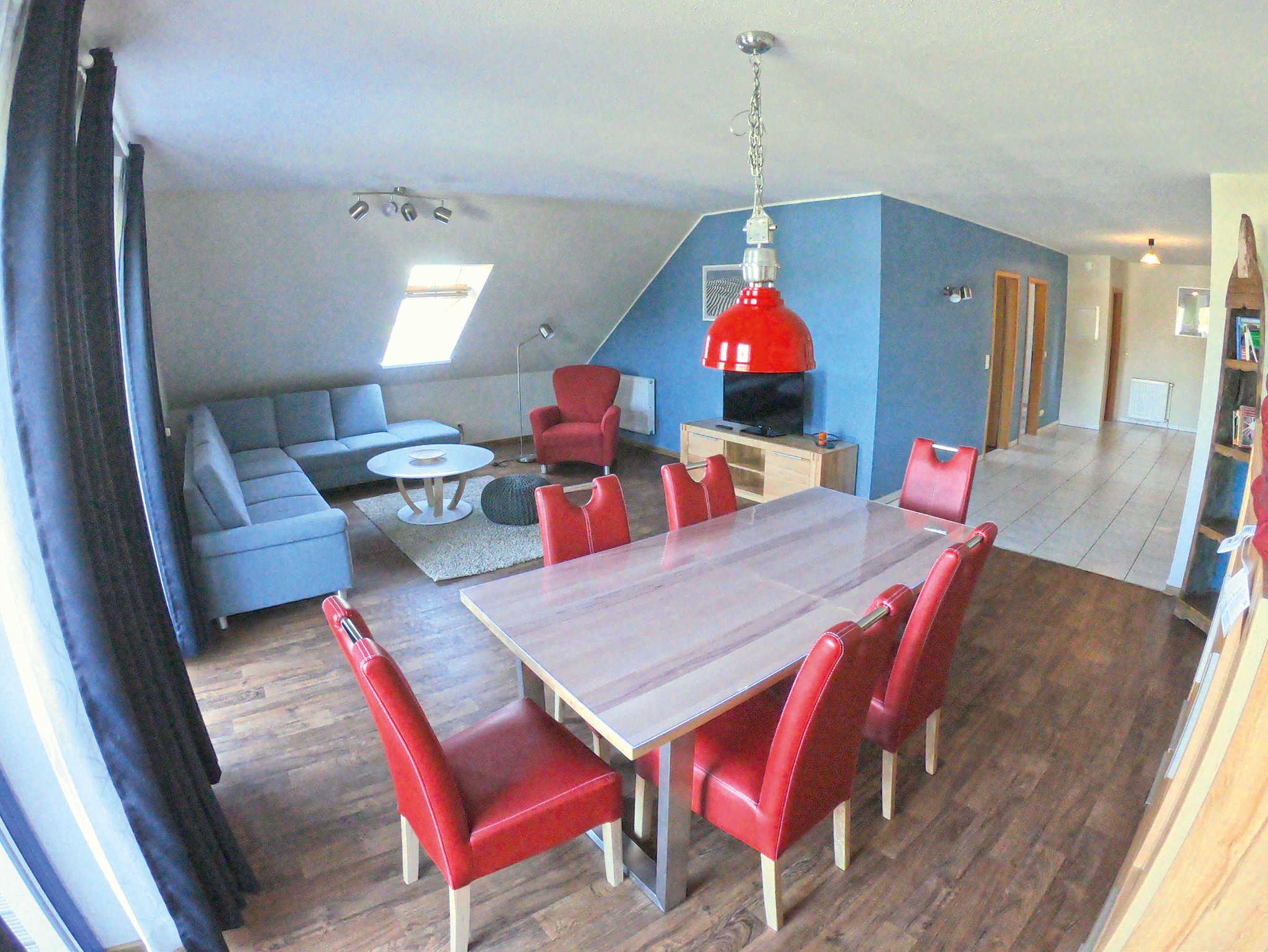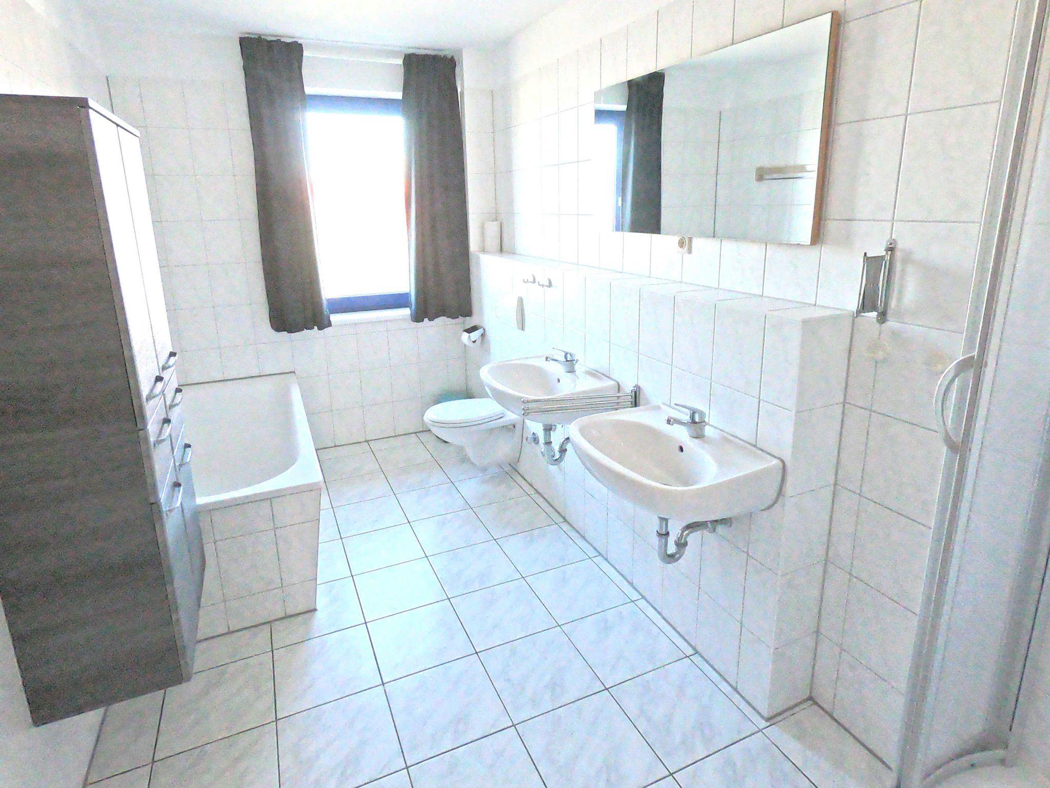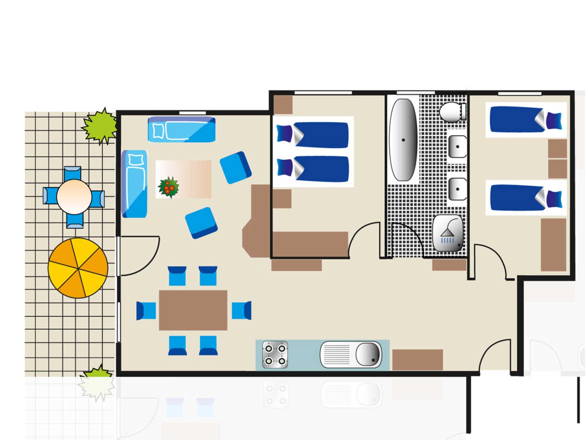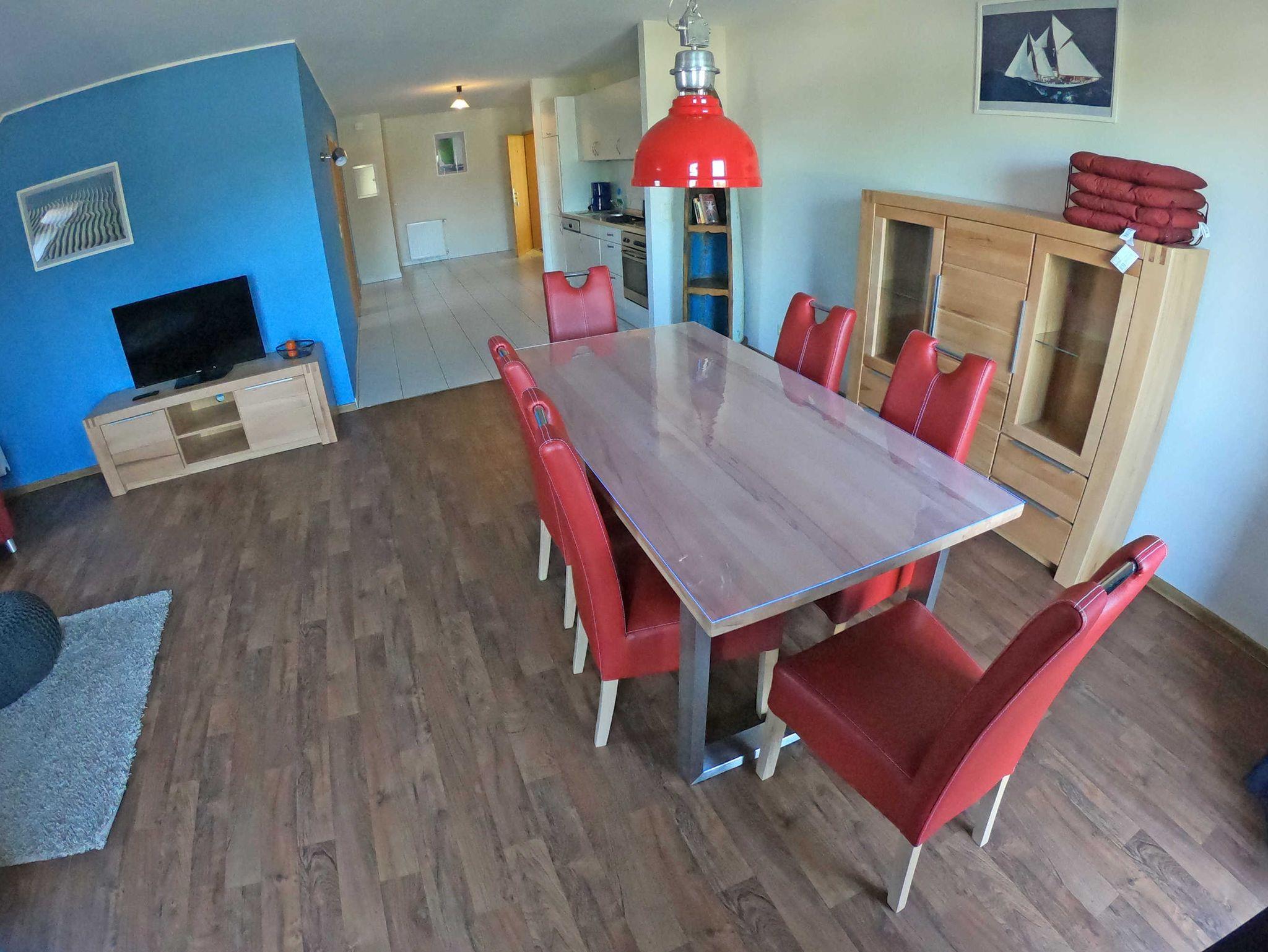 Große, offene Diele mit Küchenzeile (Spülmaschine), Wohnzimmer mit Schlafsofa und direktem Zugang zum Sonnenbalkon. Ein Schlaffzimmer mit Doppelbett, ein Schlafzimmer mit Twinbetten und ein Bad mit Badewanne, Dusche und 2 Waschbecken. Vom Wohnzimmer schaut man auf die Marina Müritz.