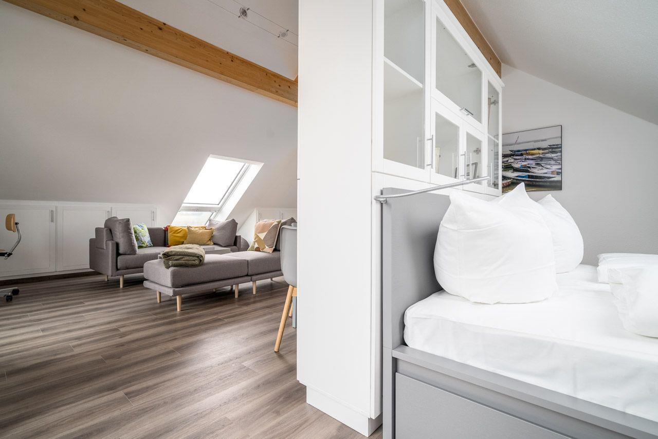 Gemütliches und modernes Ferienappartement und Platz für 2-3 Pers, offener Wohn- und Schlafbereich, große Küche mit Essbereich, Kamin, Waschmaschine, Sauna, Badewanne und Balkon mit Wiesen- und seitlichem Seeblick