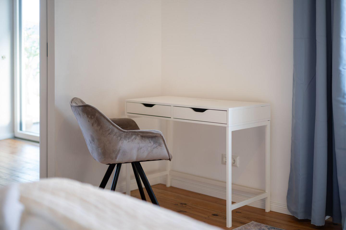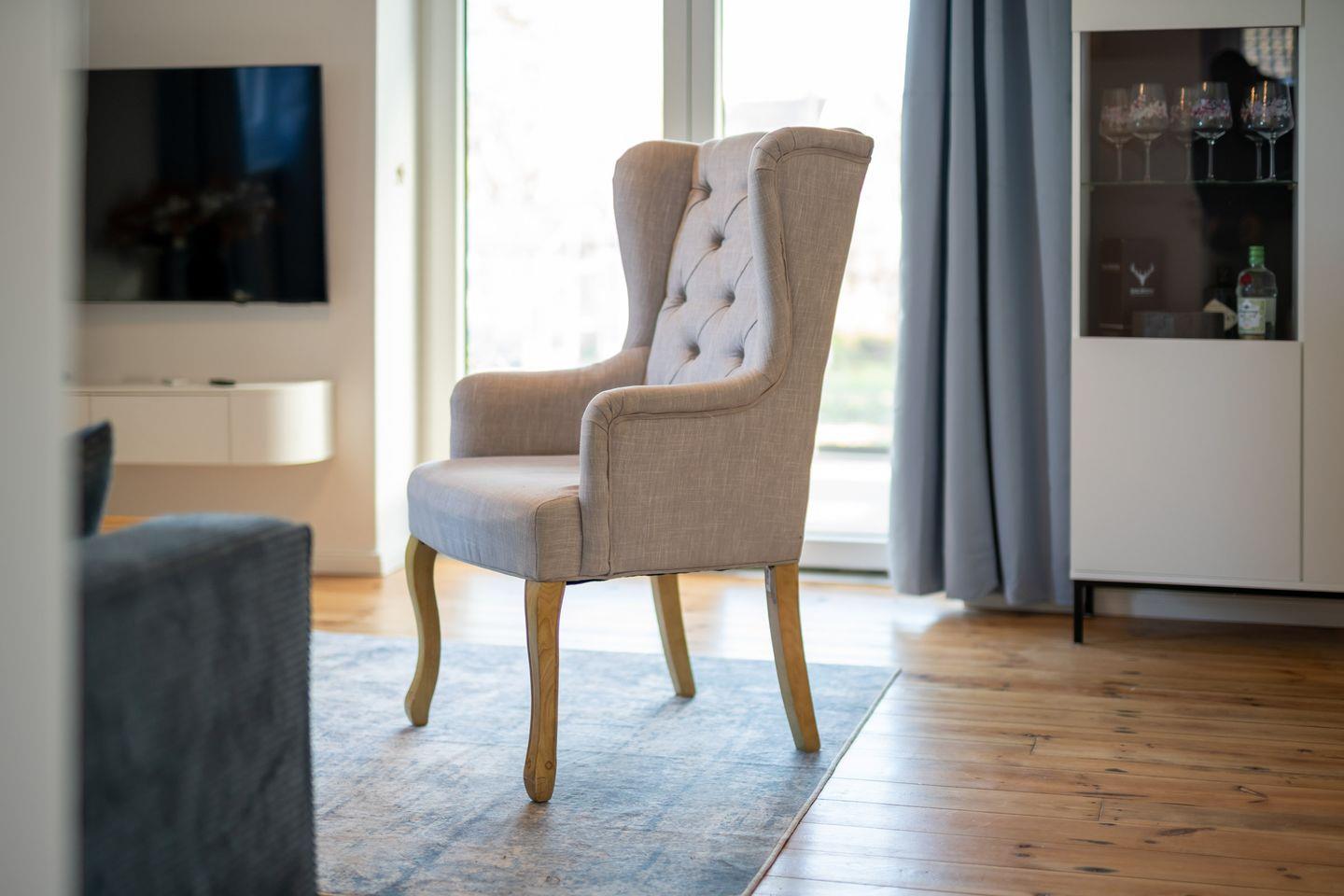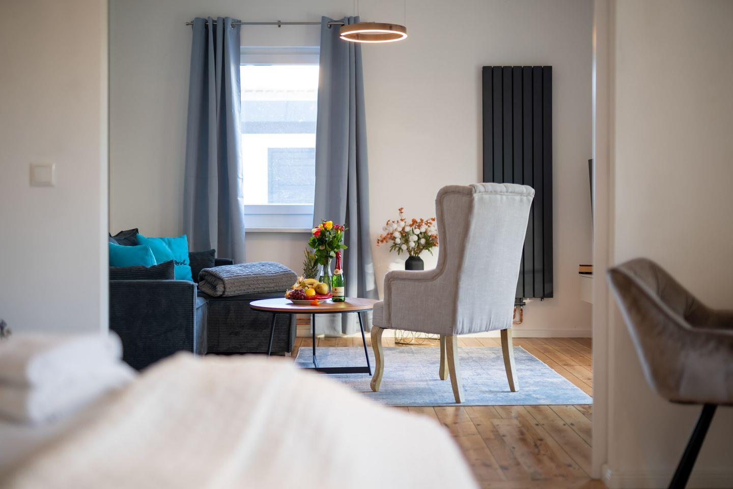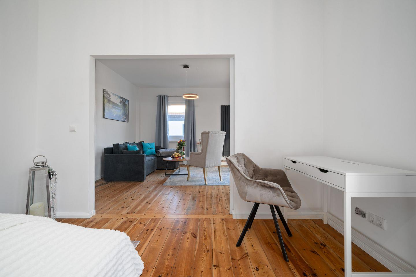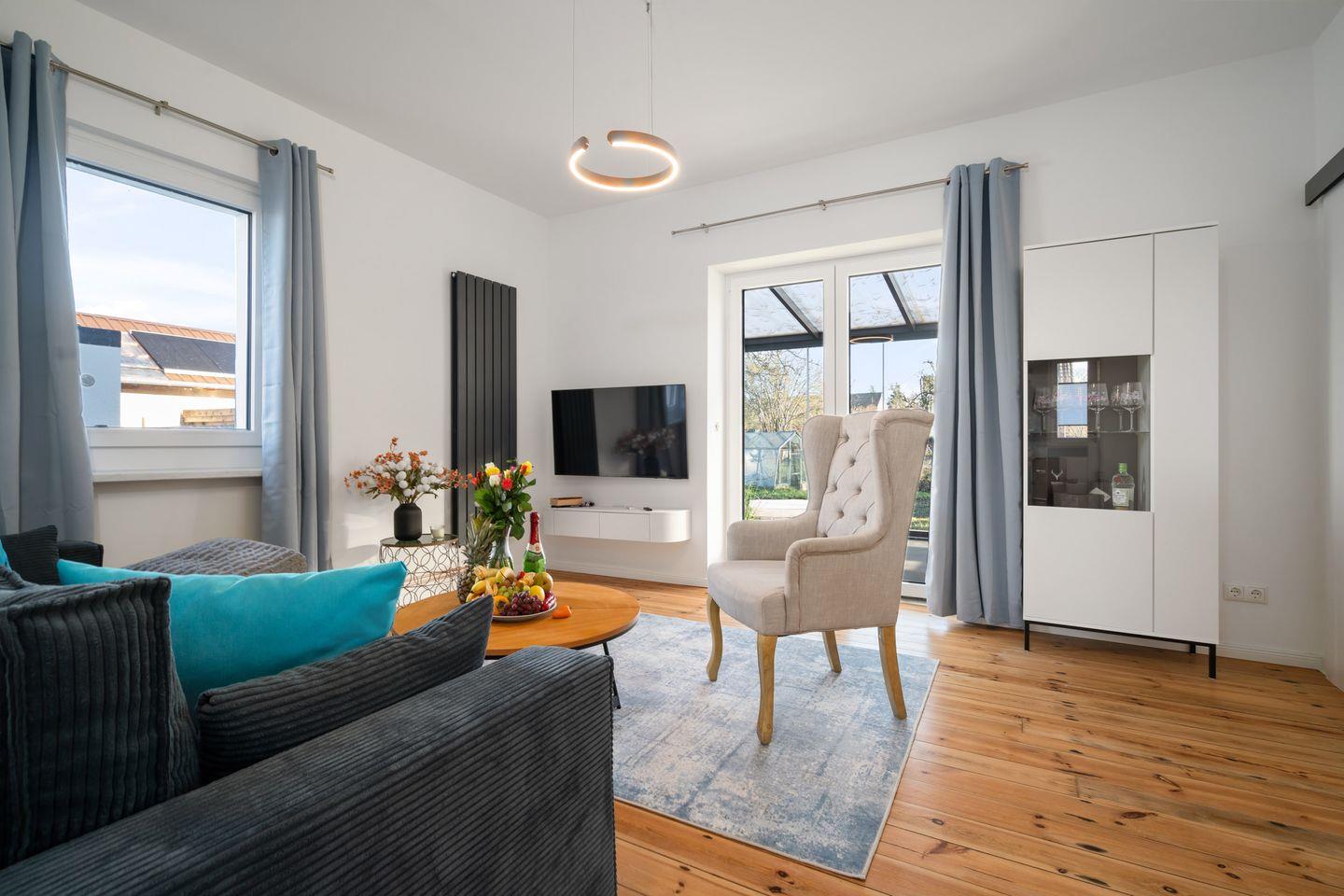 Die Wohnung präsentiert sich offen und freundlich gestaltet, mit funktionalem Grundriss, insgesamt zwei Zimmern und einem separaten Schlafzimmer. Im gemütlichen Wohnzimmer laden hochwertige Dielenböden, eine komfortable Sofaecke, Sessel und eine TV-Landschaft mit 44 bis 55 Zoll großem Smart-TV (inklusive internationaler Kanäle via Satellit) zum Ausspannen ein. Für Arbeitsaufgaben steht ein Schreibtisch bereit; zuverlässiges WLAN mit mindestens 100 Mbit/s ermöglicht ein ungestörtes Arbeiten oder Streaming.