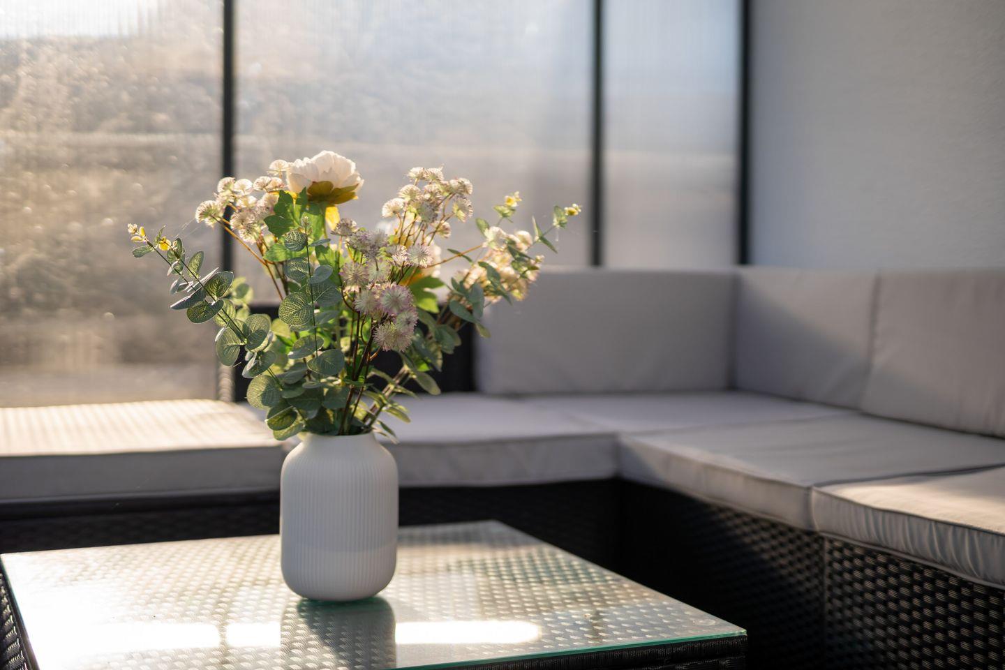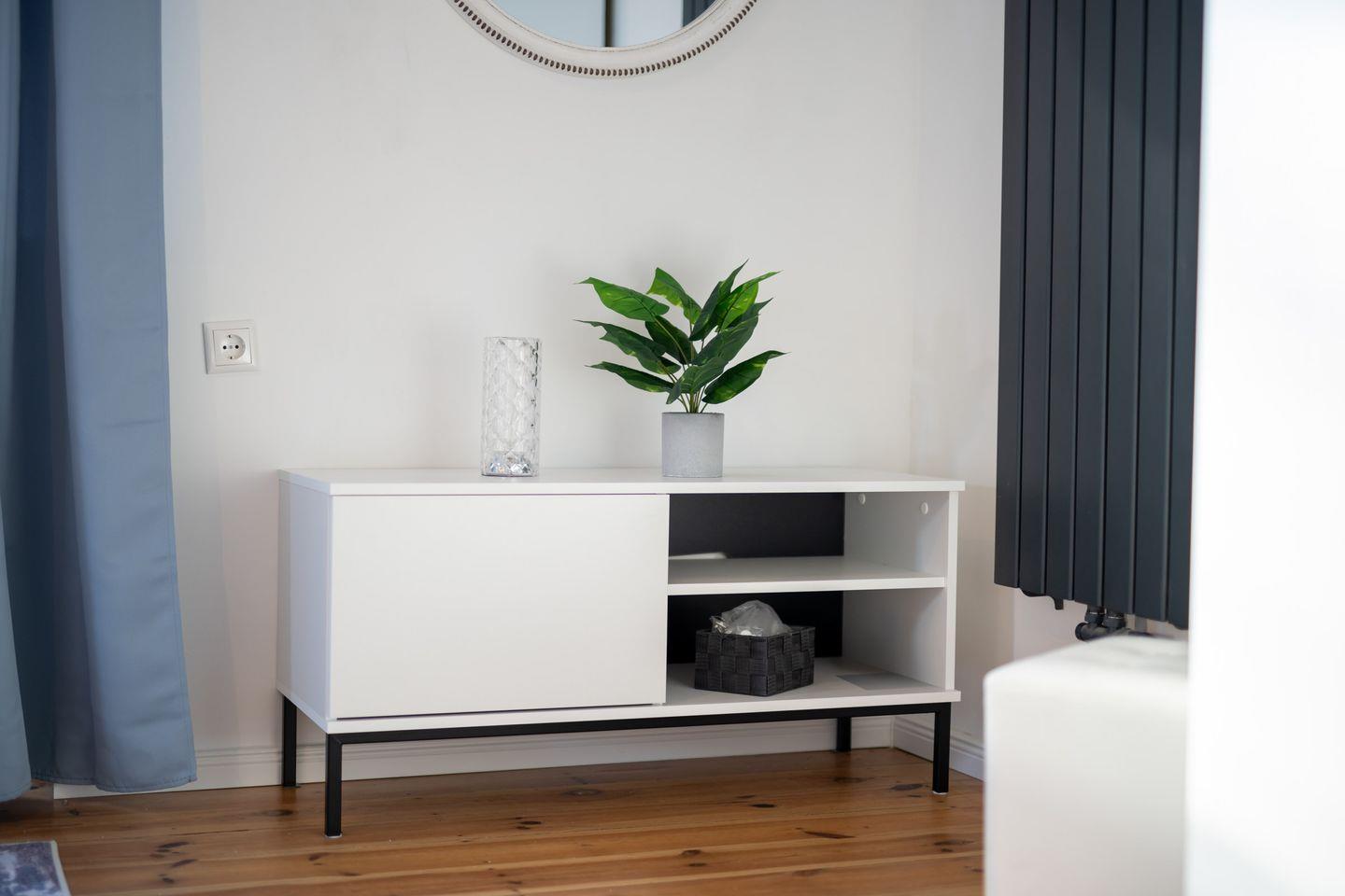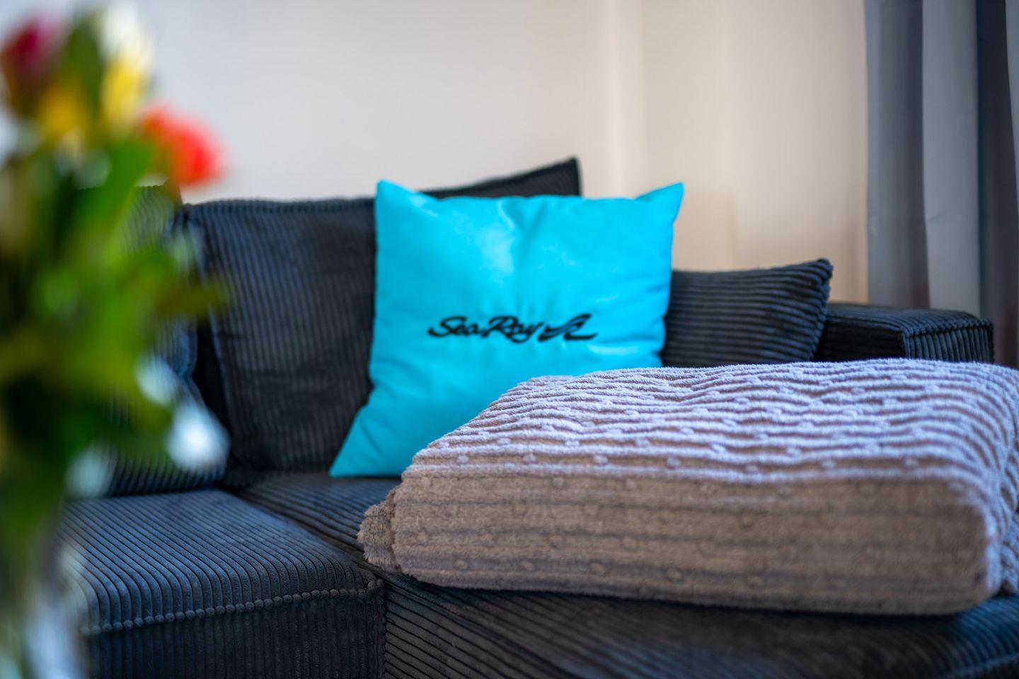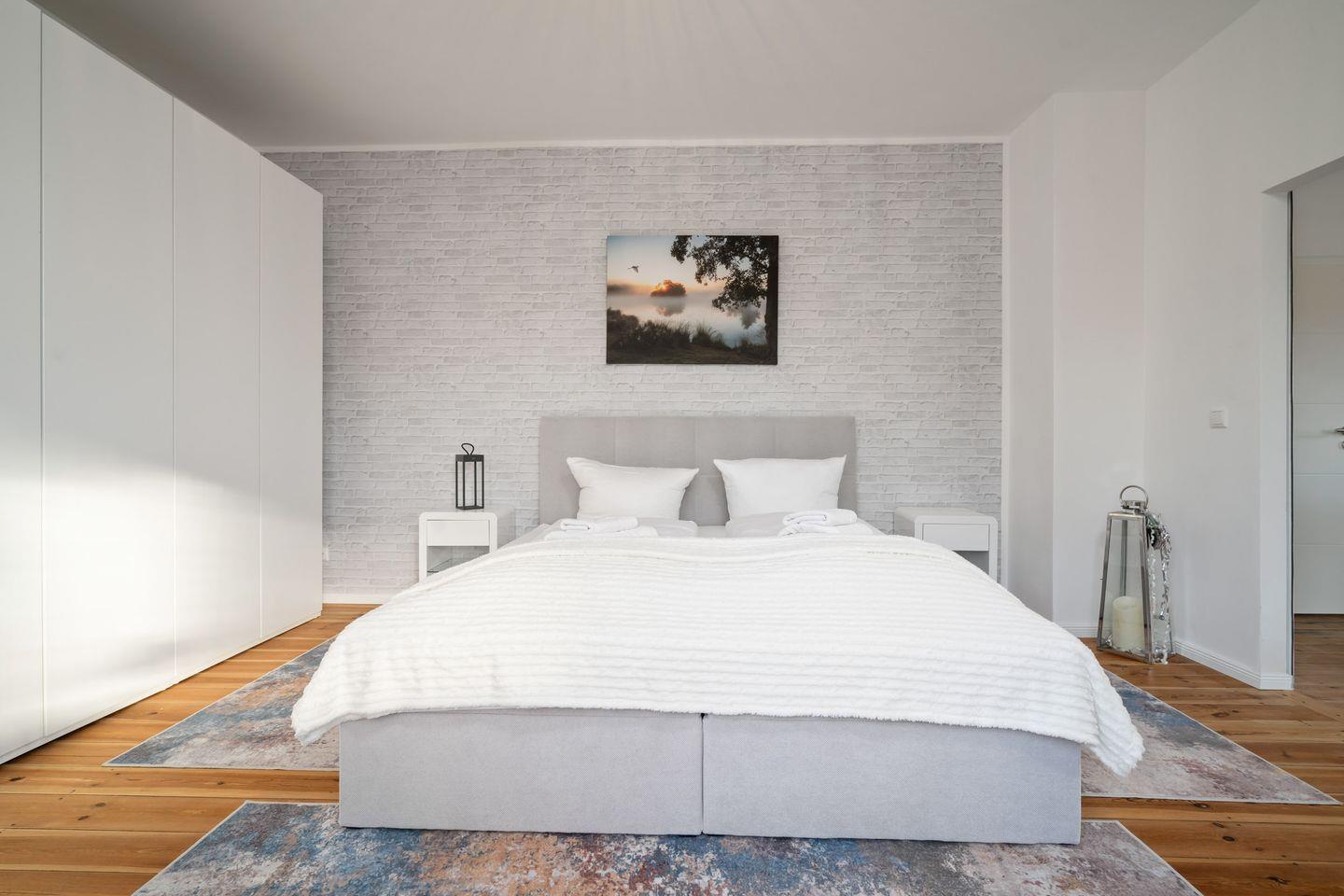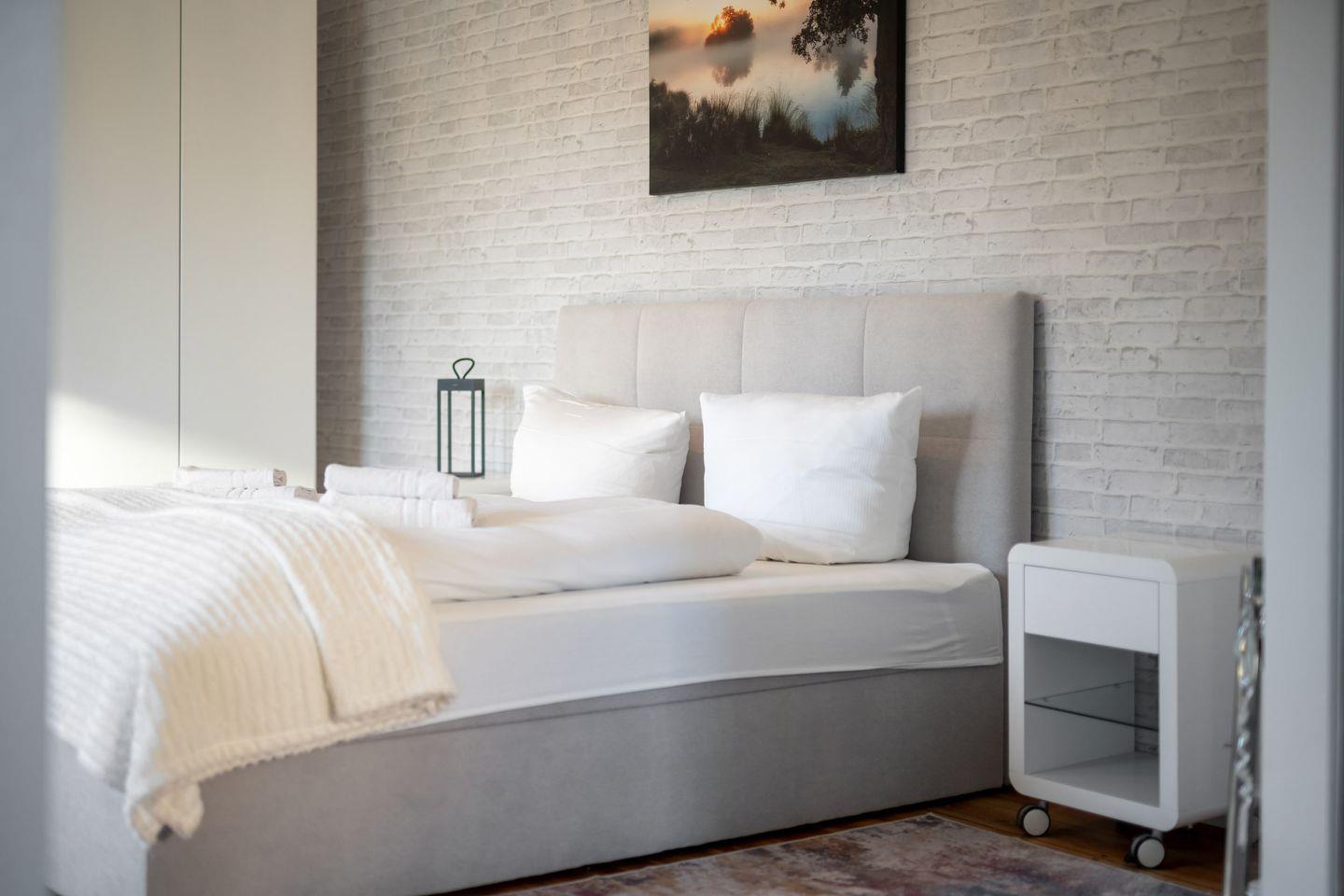 Die Wohnung präsentiert sich offen und freundlich gestaltet, mit funktionalem Grundriss, insgesamt zwei Zimmern und einem separaten Schlafzimmer. Im gemütlichen Wohnzimmer laden hochwertige Dielenböden, eine komfortable Sofaecke, Sessel und eine TV-Landschaft mit 44 bis 55 Zoll großem Smart-TV (inklusive internationaler Kanäle via Satellit) zum Ausspannen ein. Für Arbeitsaufgaben steht ein Schreibtisch bereit; zuverlässiges WLAN mit mindestens 100 Mbit/s ermöglicht ein ungestörtes Arbeiten oder Streaming.