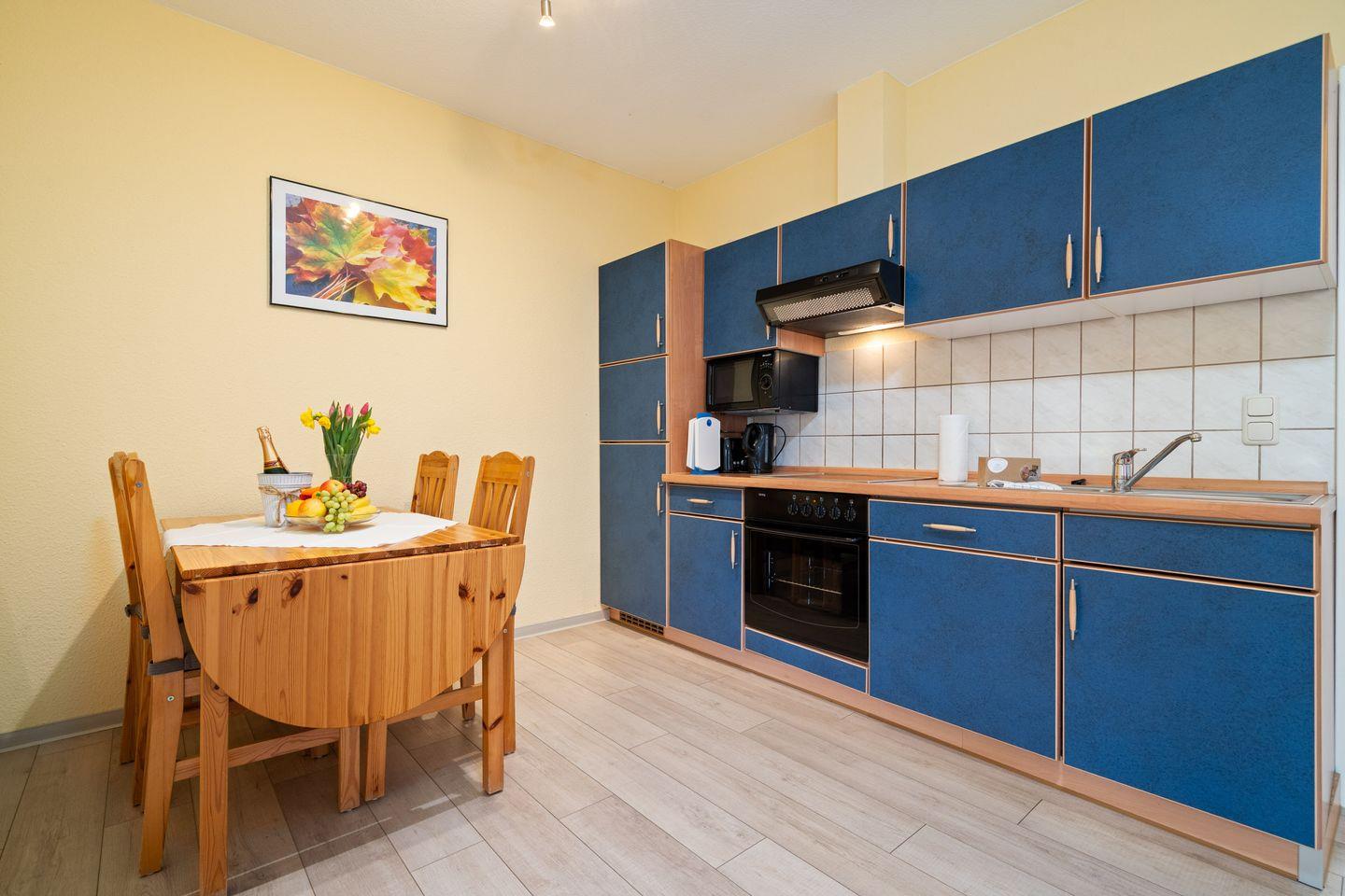 Die offene Küche ist direkt zum Wohnzimmer hin gestaltet und umfassend ausgestattet. Ihnen stehen unter anderem ein Cerankochfeld, Backofen, Mikrowelle, Spülmaschine, Kühlschrank mit Gefrierfach, Wasserkocher, Toaster, Kaffeemaschine sowie eine Kaffee- und Teemaschine zur Verfügung. Küchenutensilien, Geschirr und Besteck sind ebenso vorhanden wie Reinigungsmittel und eine Erstausstattung, sodass Sie Ihren Aufenthalt unkompliziert beginnen können.