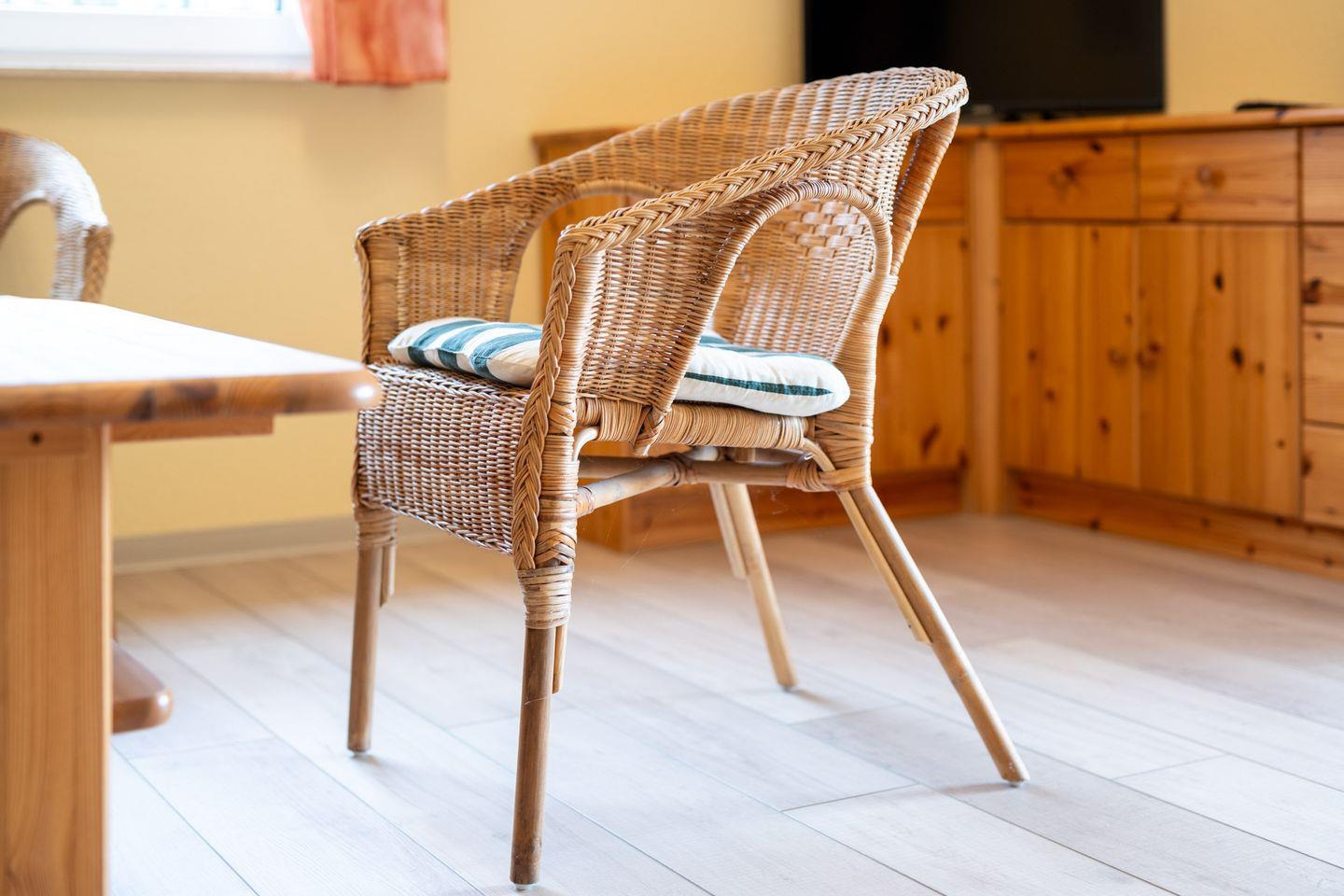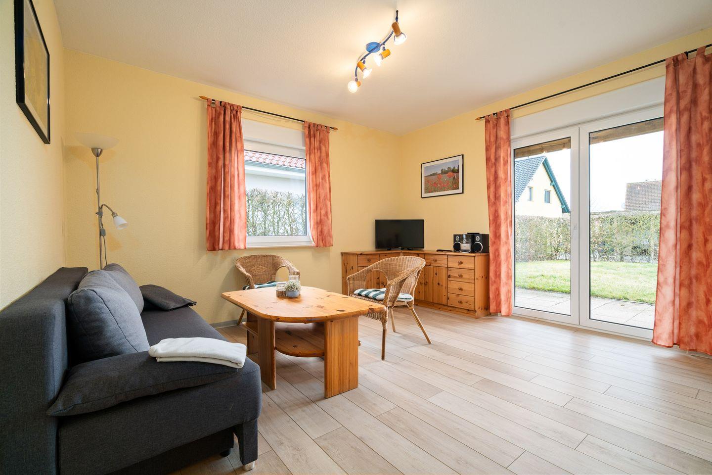 Der Wohnbereich ist mit Sofa, TV, Radio und WLAN ausgestattet. Dank Internet mit einer Geschwindigkeit ab 100 Mbit/s ist die Ferienwohnung auch für Gäste geeignet, die während ihres Aufenthalts auf eine stabile Verbindung angewiesen sind. Sichtschutz an allen Fenstern sowie Fliegengitter tragen zusätzlich zum Komfort bei. Ein Esszimmer mit Esstisch ergänzt den Wohnraum sinnvoll und schafft Platz für gemeinsame Mahlzeiten.