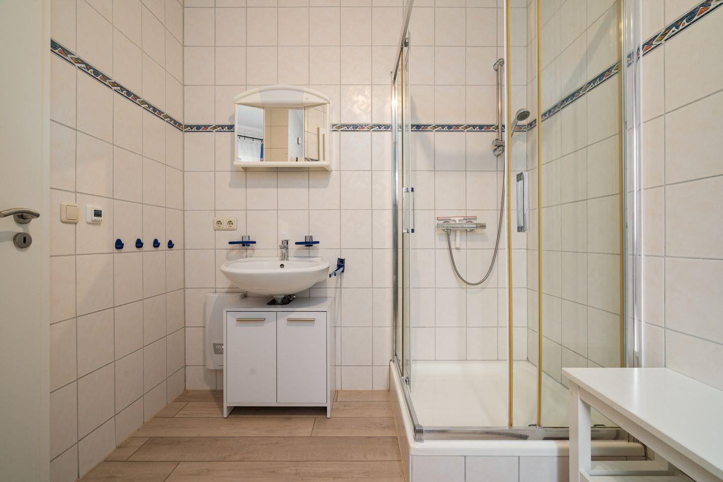 Das Badezimmer verfügt über ein Fenster, Waschbecken, WC, Spiegel und eine Dusche mit Wanne. Ein Haartrockner ist ebenfalls vorhanden. Für längere Aufenthalte oder Familien praktisch: Die Waschmaschine steht Ihnen zur Eigennutzung zur Verfügung, ergänzt durch Wäscheständer und Staubsauger.