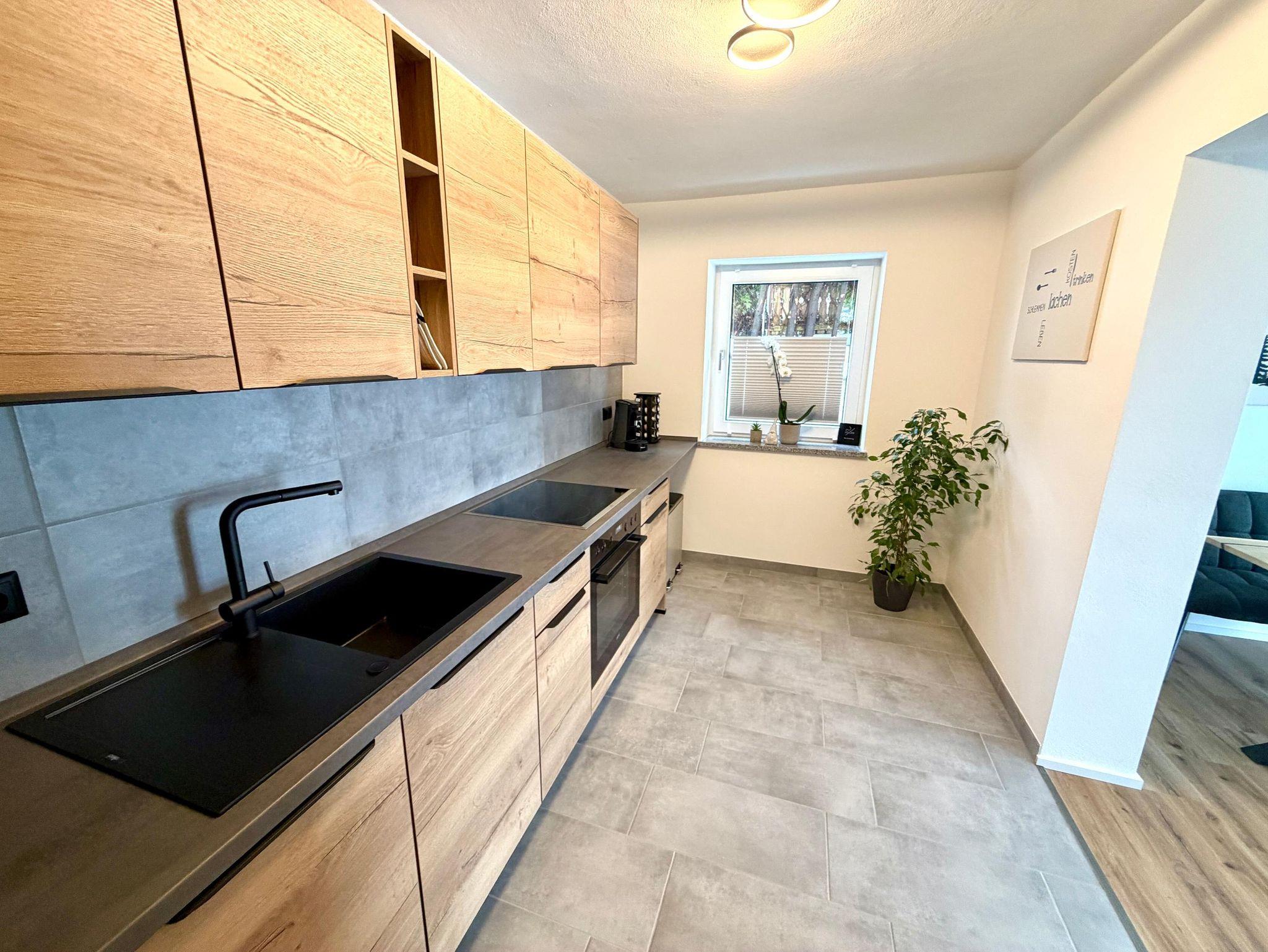 Die moderne Ferienwohnung im Erdgeschoss verfügt über eine Wohnfläche von ca. 90 qm und ist für bis zu vier Personen geeignet. Sie bietet zwei Schlafzimmer, eines davon mit Doppelbett und TV, sowie ein weiteres Schlafzimmer mit zwei Einzelbetten. Der Wohnbereich mit einem gemütlichen Sofa und einem TV ist offen zur Küche und zum Essbereich gestaltet, wodurch ein heller und einladender Raum entsteht. Das Badezimmer verfügt über eine Dusche und ein WC. Die Wohnung eignet sich besonders für Familien oder Paare, die großzügiges Wohnen auf einer Ebene schätzen.