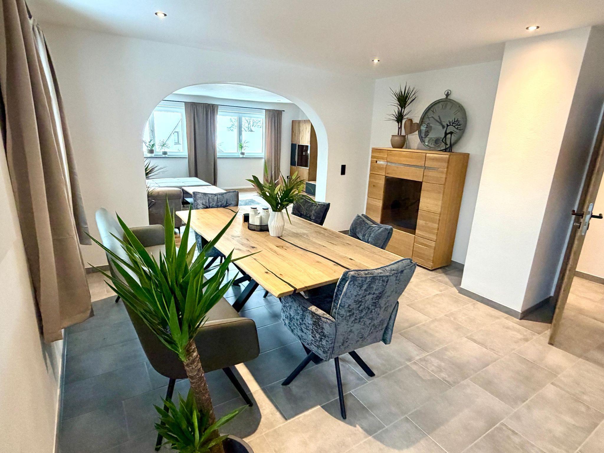 Die moderne, großzügige Ferienwohnung mit ca. 120 qm Wohnfläche bietet Platz für bis zu sechs Personen. Sie verfügt über drei Schlafzimmer, darunter ein Schlafzimmer mit Doppelbett und TV, ein weiteres Schlafzimmer mit Doppelbett und einem Einzelbett sowie ein Schlafzimmer mit einem Einzelbett. Der Wohnbereich mit gemütlichem Sofa und TV ist offen zur Küche und zum Essbereich gestaltet und bietet viel Raum für gemeinsames Beisammensein. Ein Badezimmer mit Dusche und WC rundet die Ausstattung ab. Diese Wohnung ist ideal für größere Familien oder Gruppen, die Komfort und ausreichend Platz wünschen.